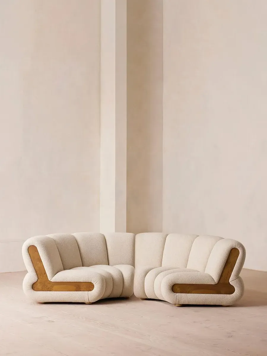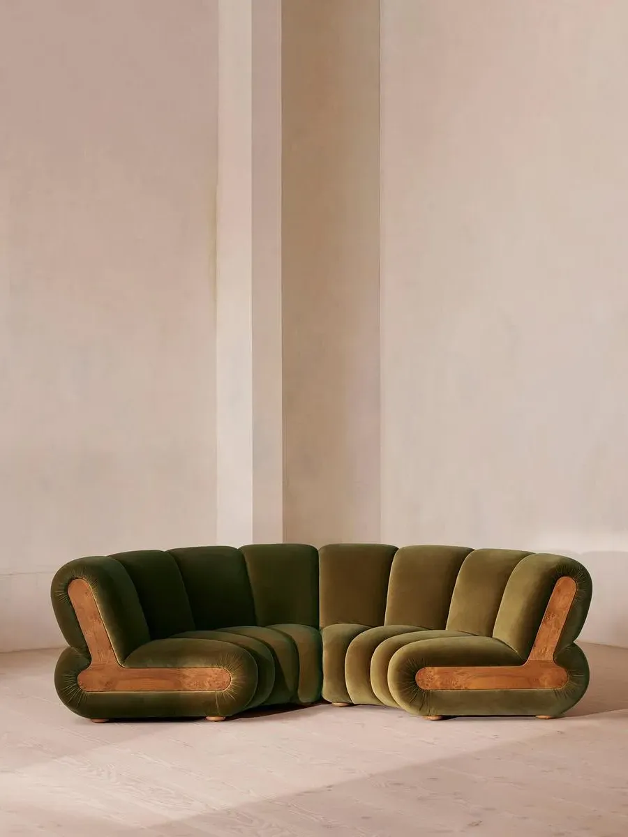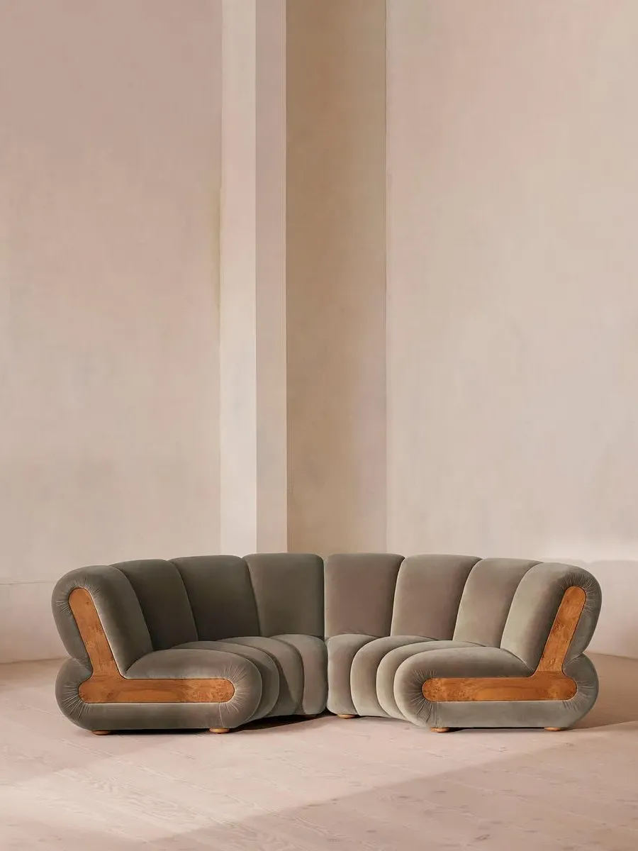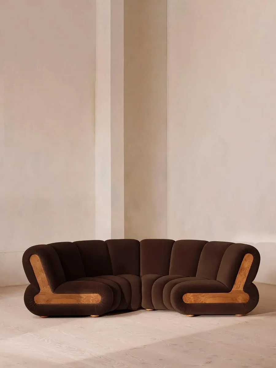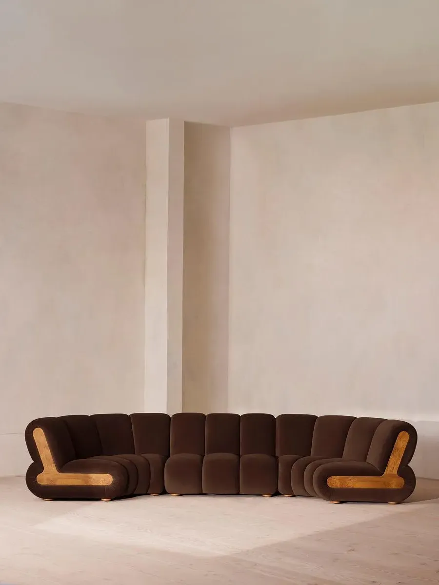 Designed to adapt to any living space, the Noelle modular sofa comprises of straight and curved modules to create the shape you desire, or alternatively a generous armchair if used alone. Rich velvet upholstery is complemented with aged Pippy Oak veneer sides that have a burl finish, while its statement curved shape takes its design cues from the 1970s interiors of 180 House.