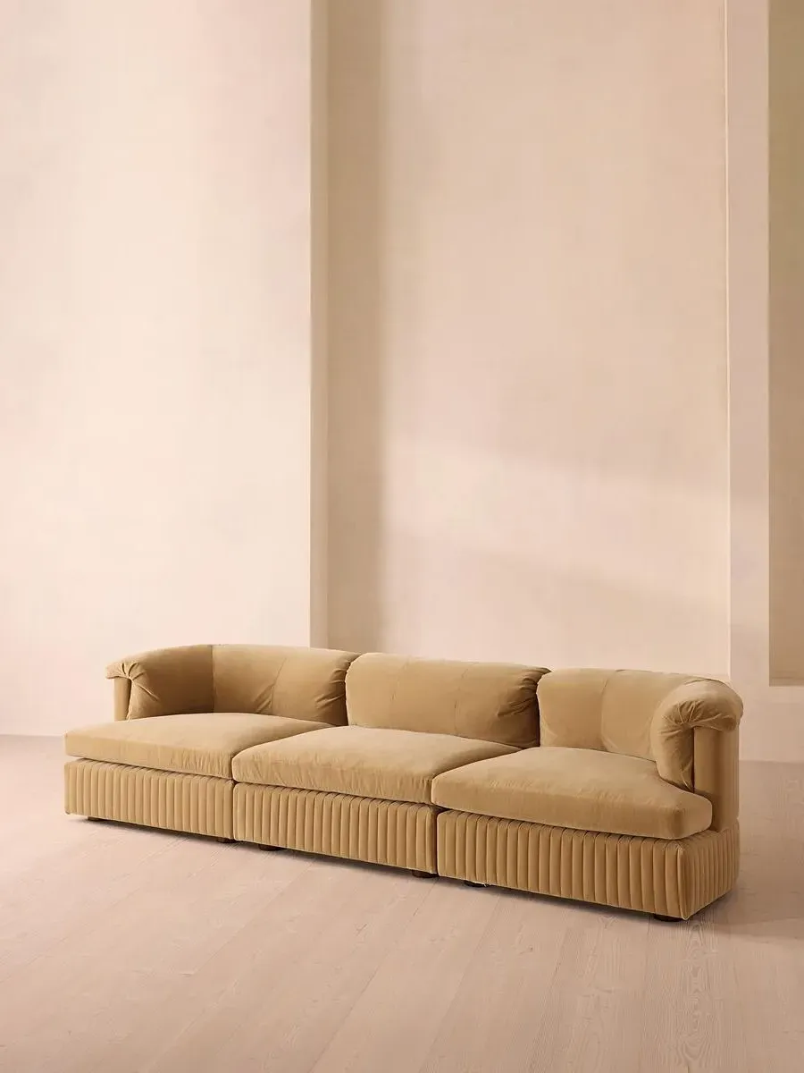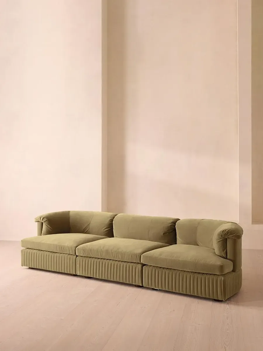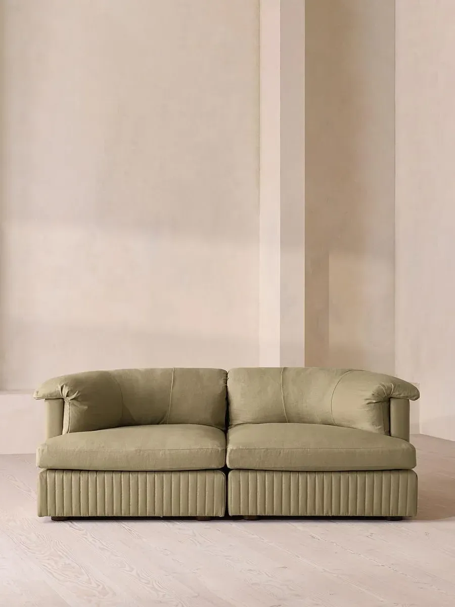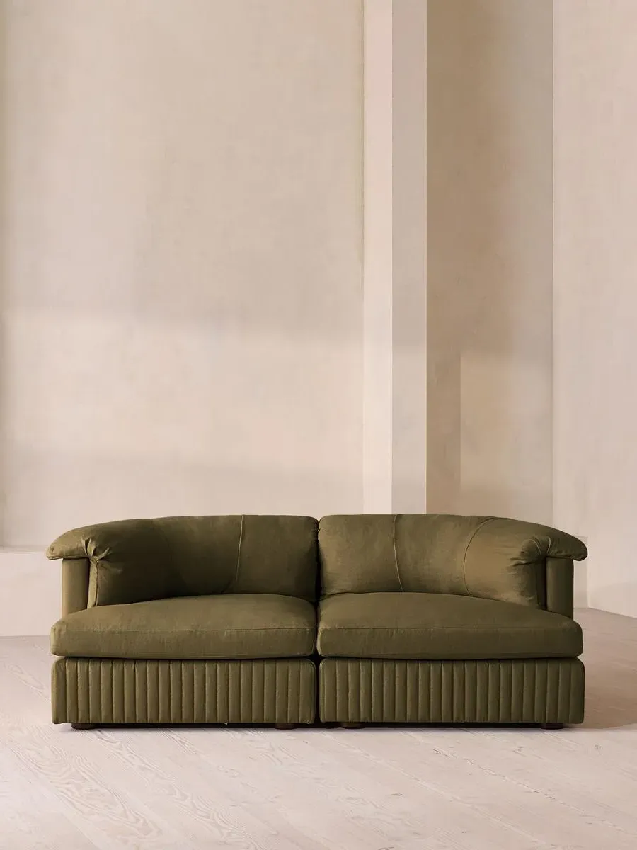 The modular sofa offers generous comfort with its rounded silhouette and feather-wrapped cushions. Its linen upholstery provides durability and natural texture, while the modular design adapts to various configurations. The channelled base upholstery adds structural detail, and the feather-filled seat and back cushions ensure plush support.