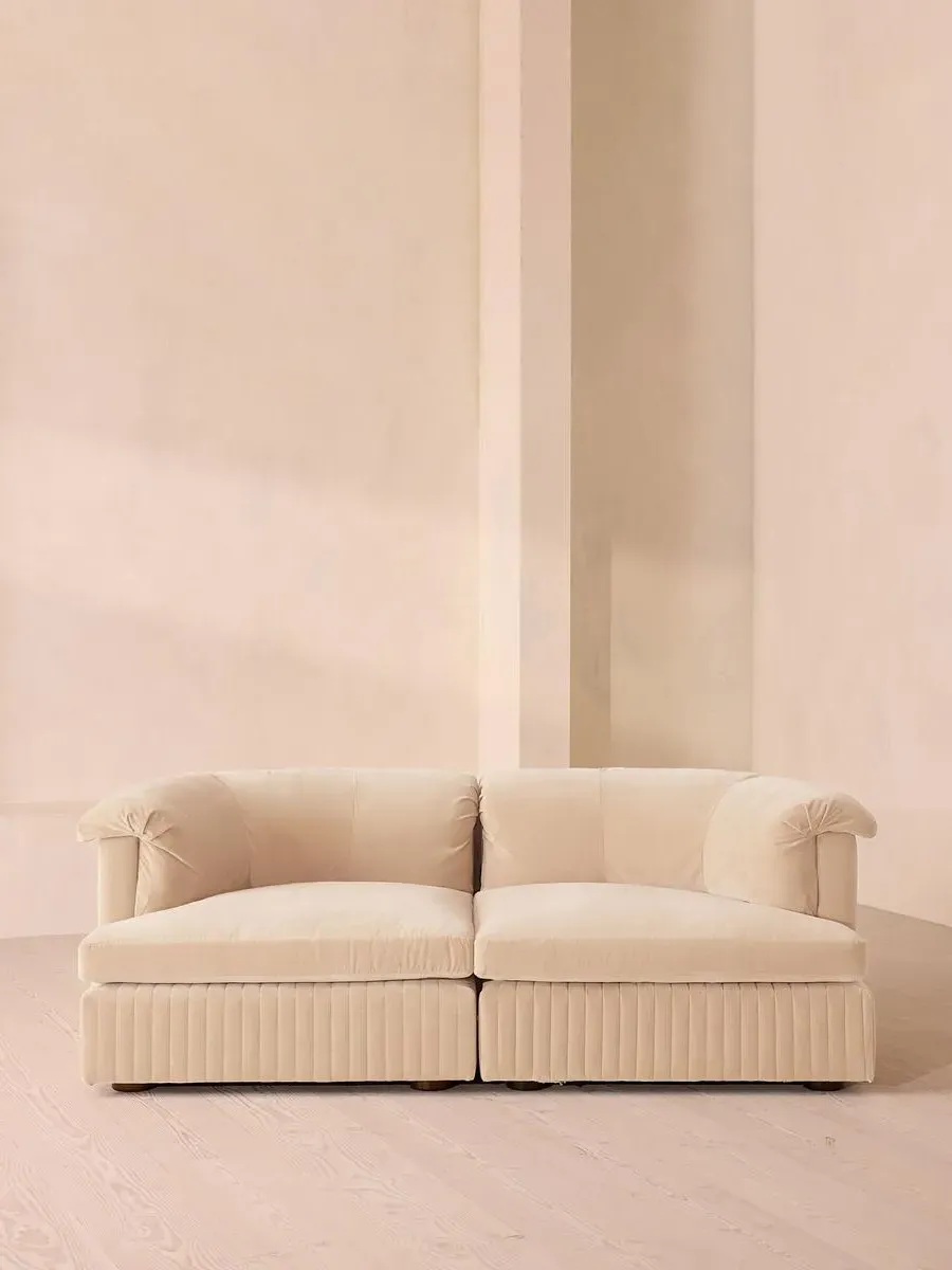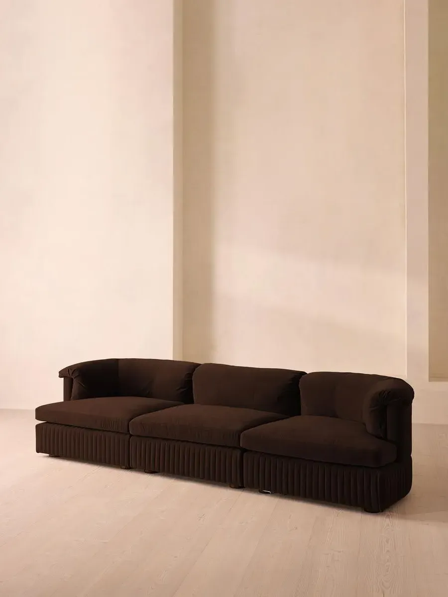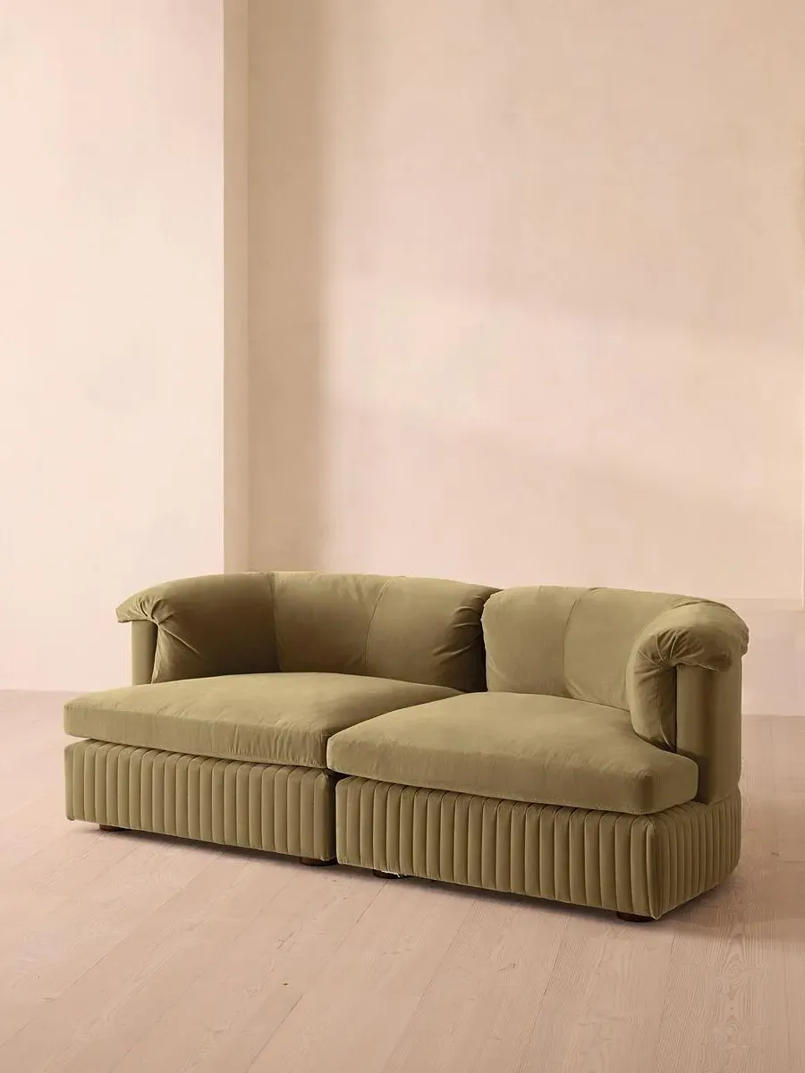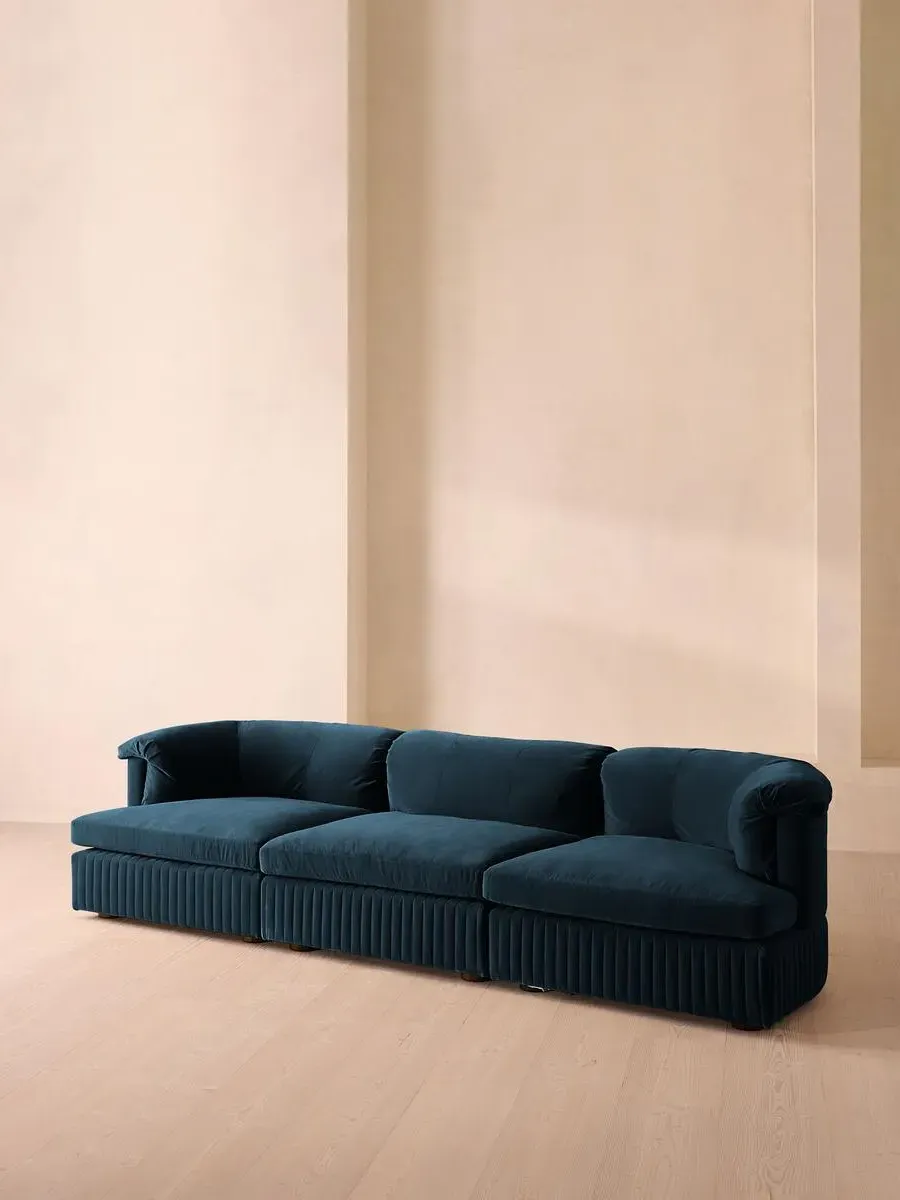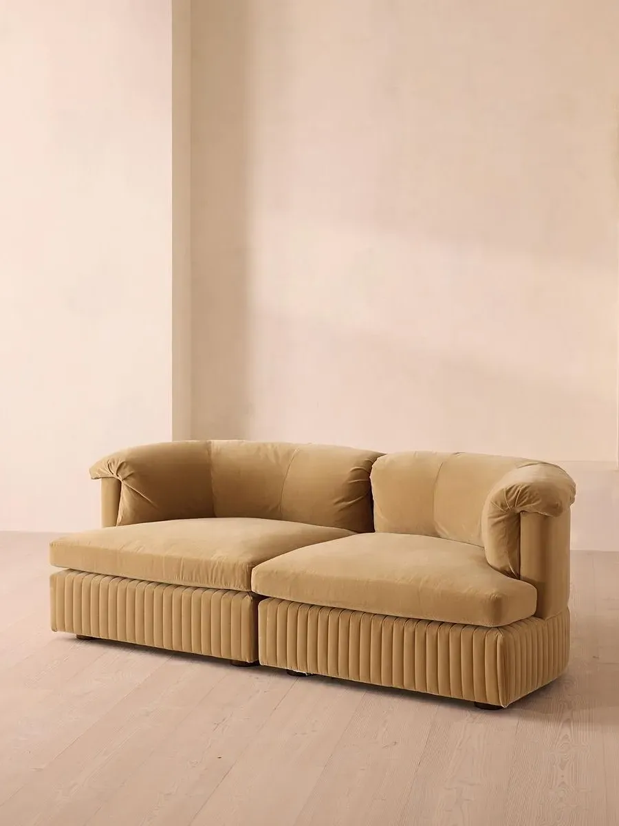 The modular sofa offers generous comfort with its rounded silhouette and feather-wrapped cushions. Its linen upholstery provides durability and natural texture, while the modular design adapts to various configurations. The channelled base upholstery adds structural detail, and the feather-filled seat and back cushions ensure plush support.