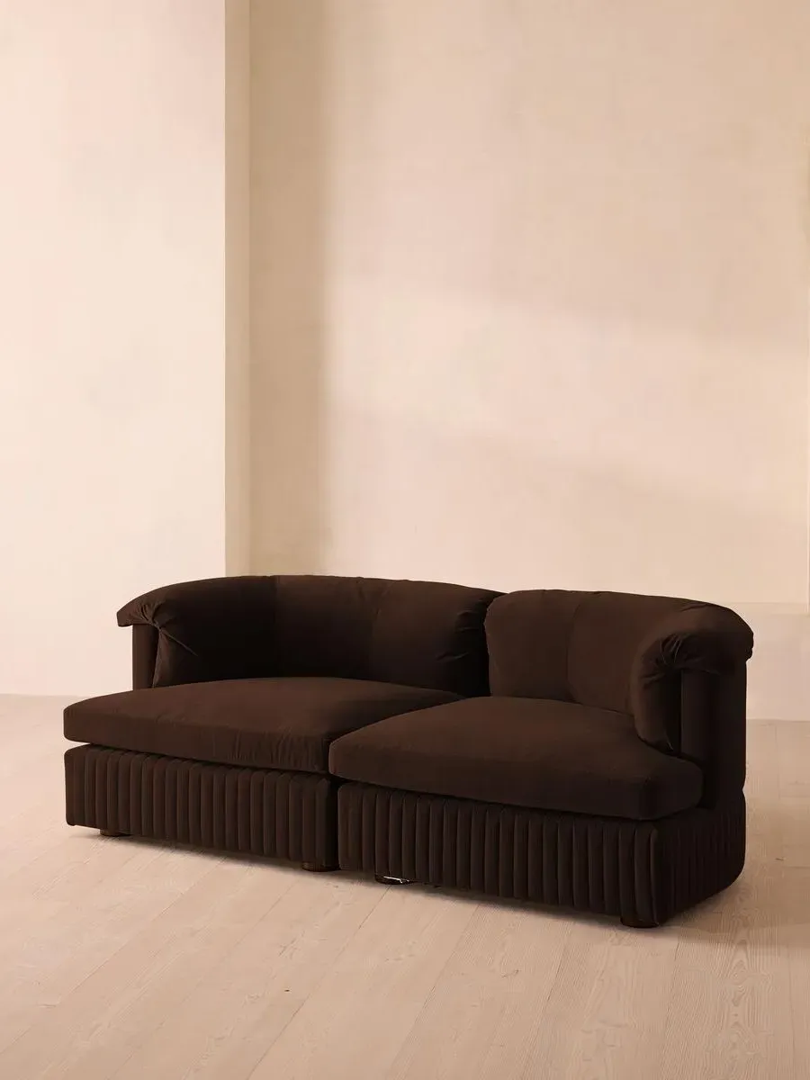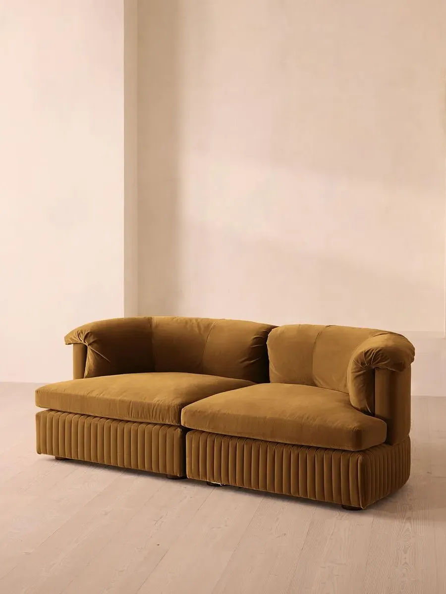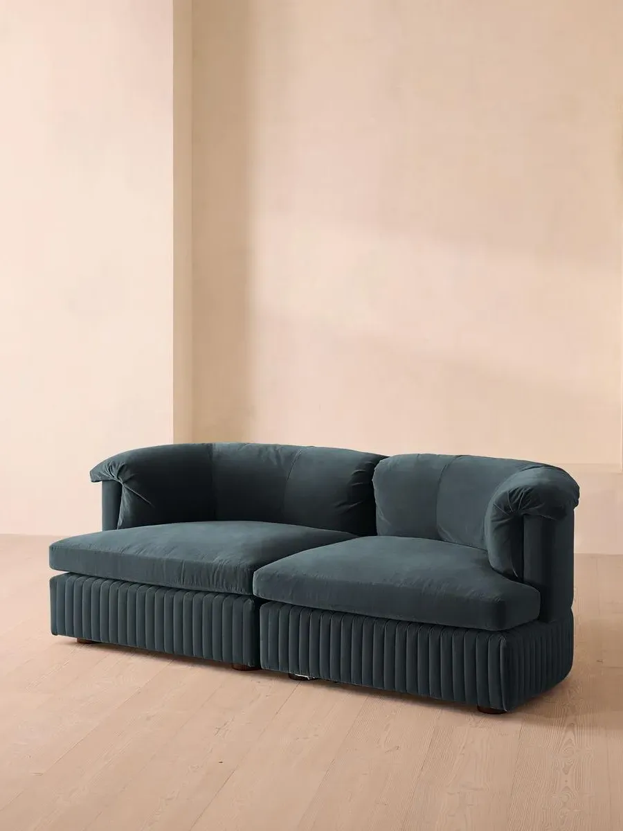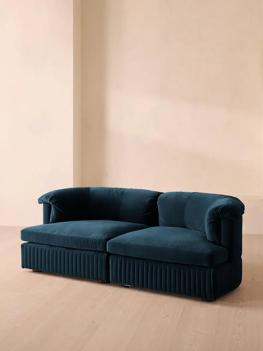 The modular sofa offers generous comfort with its rounded silhouette and feather-wrapped cushions. Its linen upholstery provides durability and natural texture, while the modular design adapts to various configurations. The channelled base upholstery adds structural detail, and the feather-filled seat and back cushions ensure plush support.