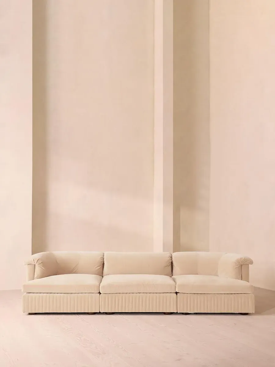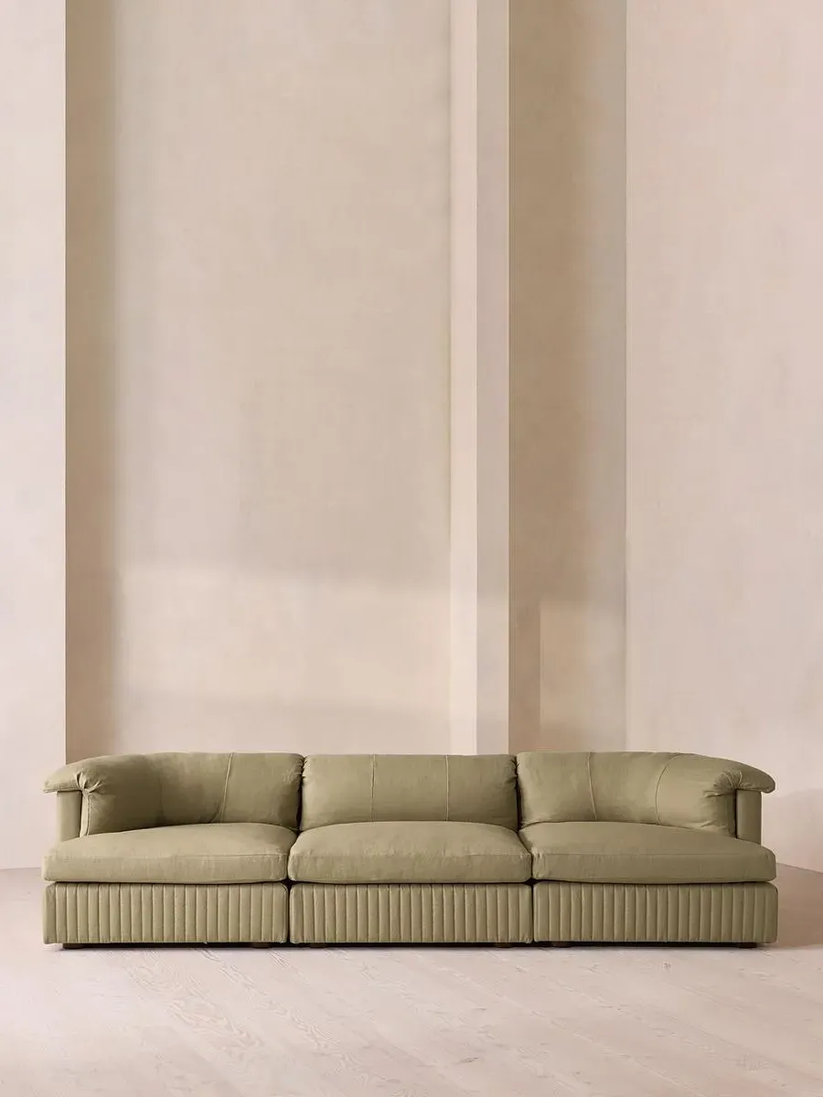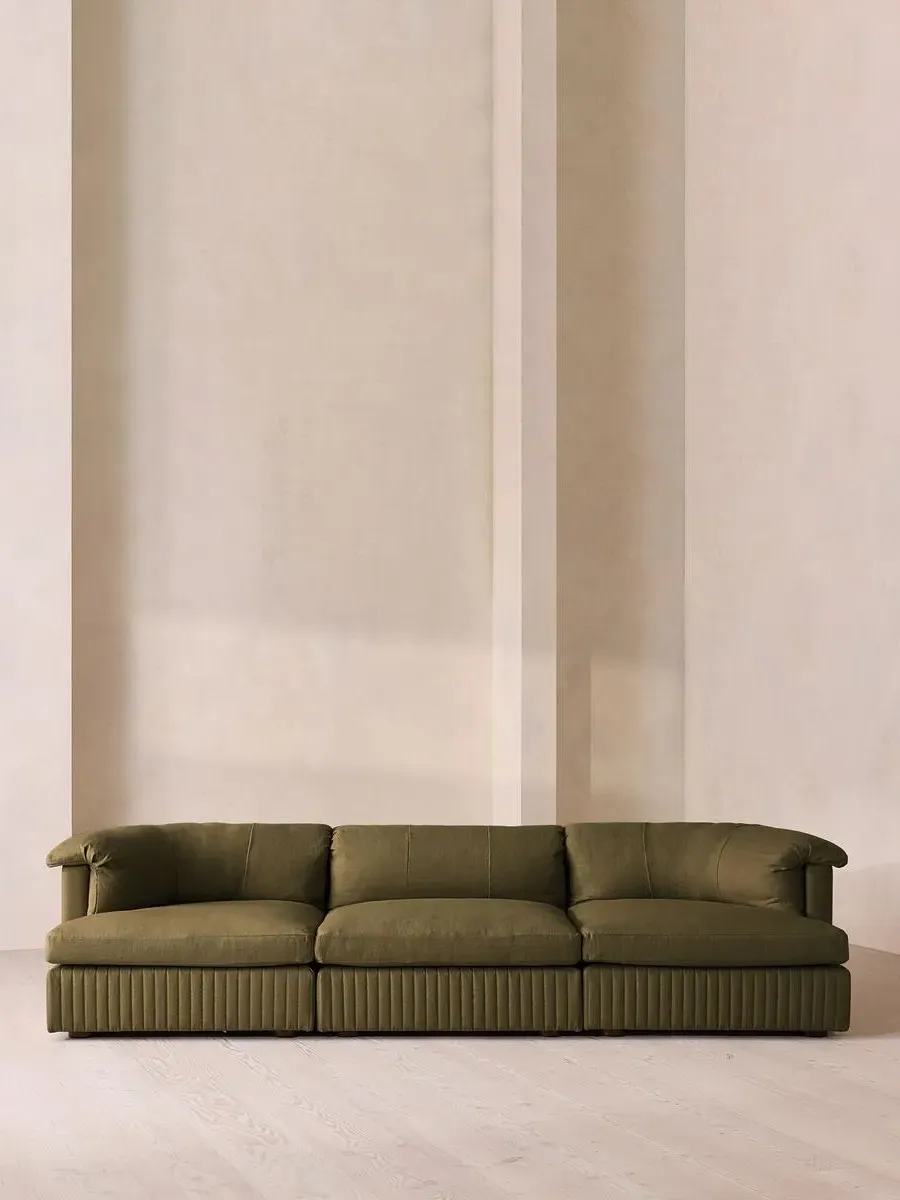 Made in the UK, a generous, rounded silhouette is finished with feather-wrapped cushions in linen upholstery. Designed to perfectly adapt to your space, our Oona four-seater modular sofa is designed to create the ideal configuration for your living requirements. Comfortable feather-wrapped seat and back cushions are fully upholstered in linen, complemented by channelled upholstery at the base.