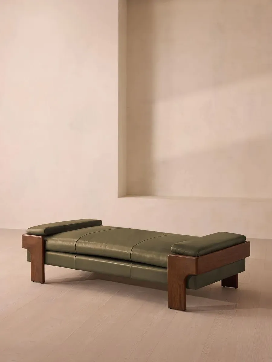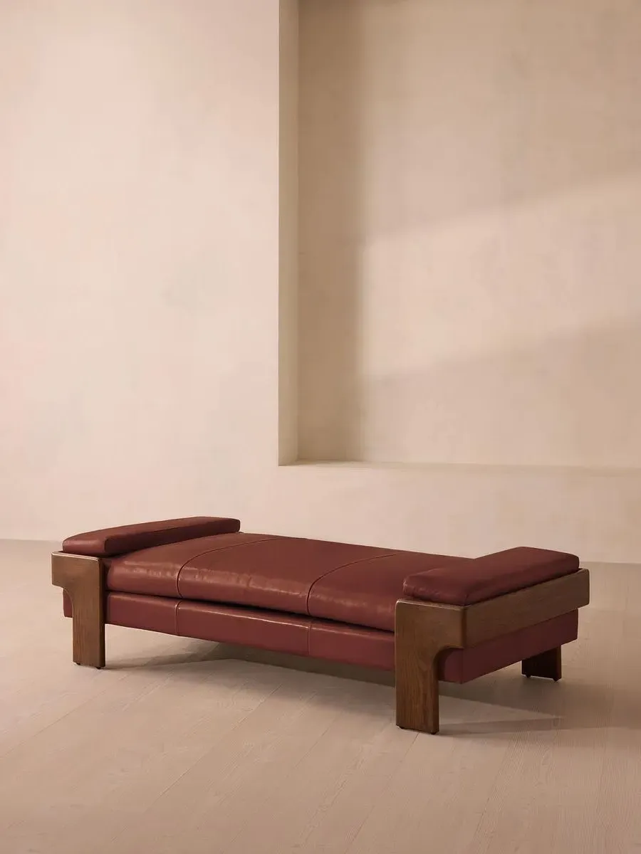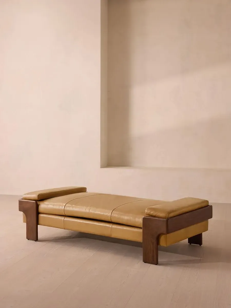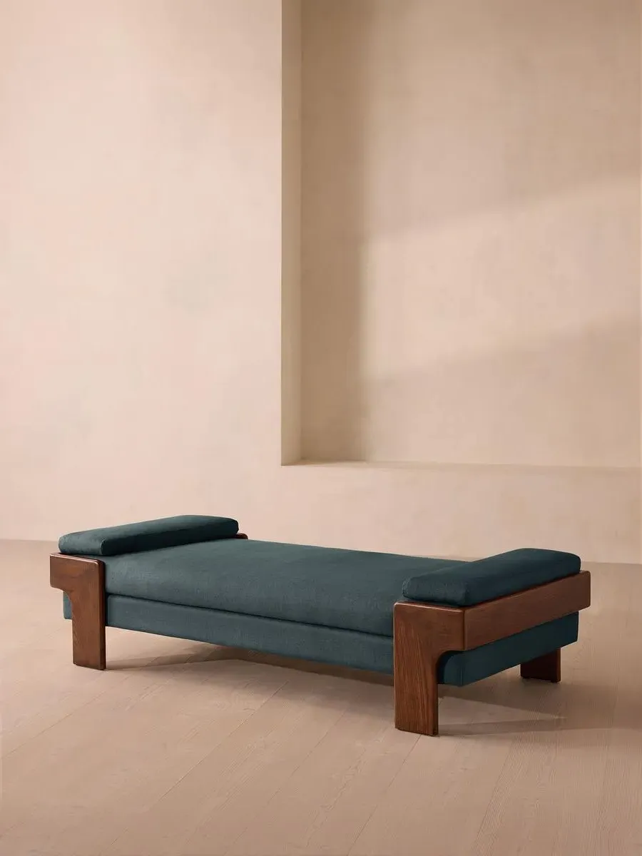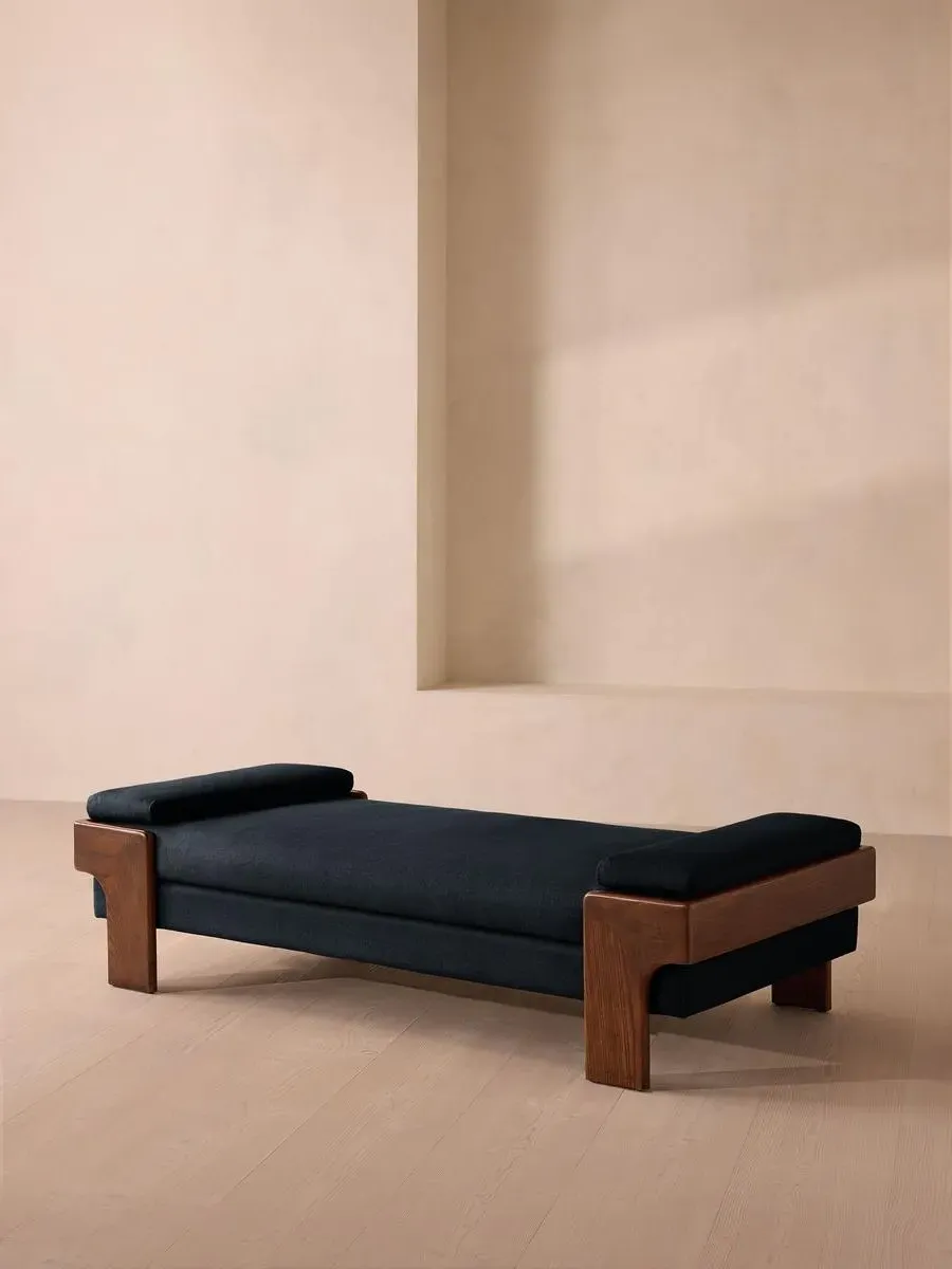 The relaxed silhouette is finished with feather-wrapped cushions upholstered in velvet. Designed as part of our Marcia range, this daybed similarly echoes the relaxed social setting of Shoreditch House with its wide, laid-back silhouette. Its feather-wrapped seat cushion and two bolster cushions are fully upholstered in velvet, available in our made-to-order palette.