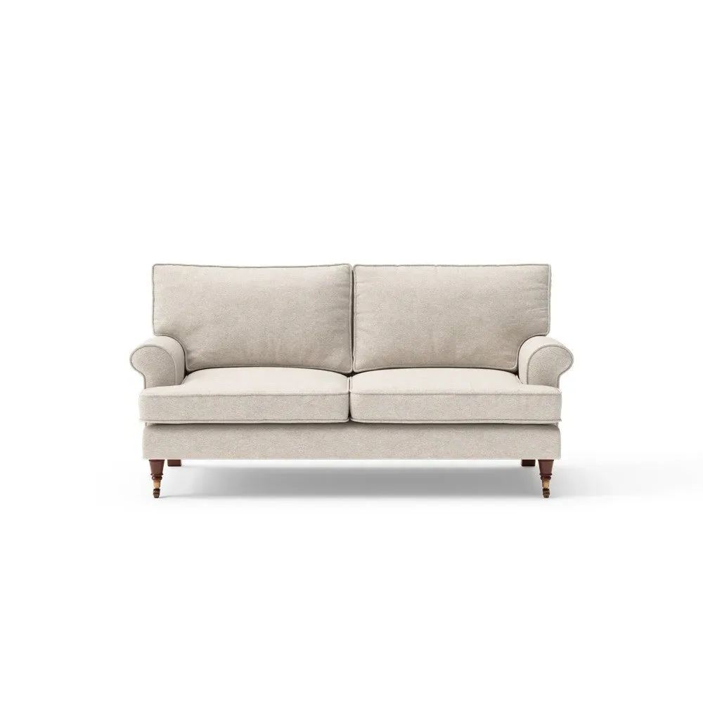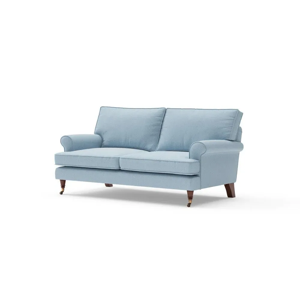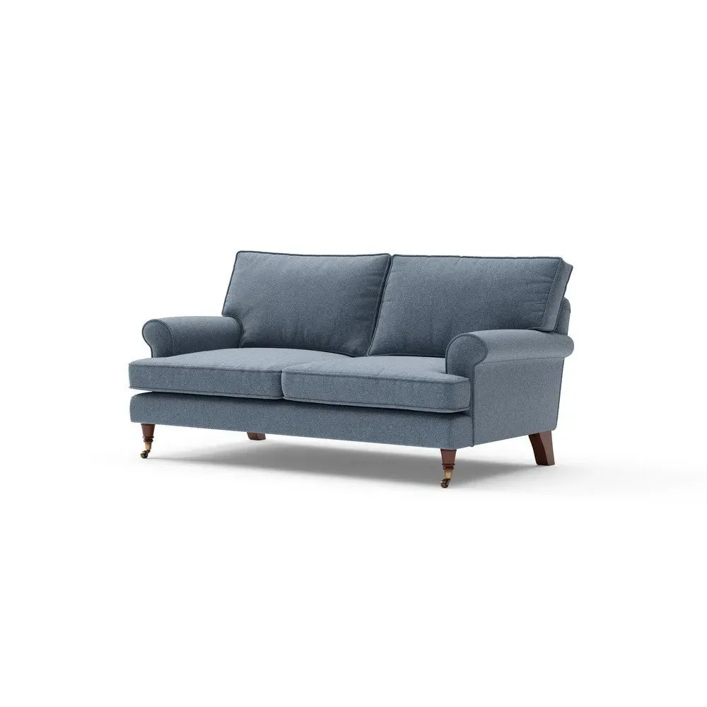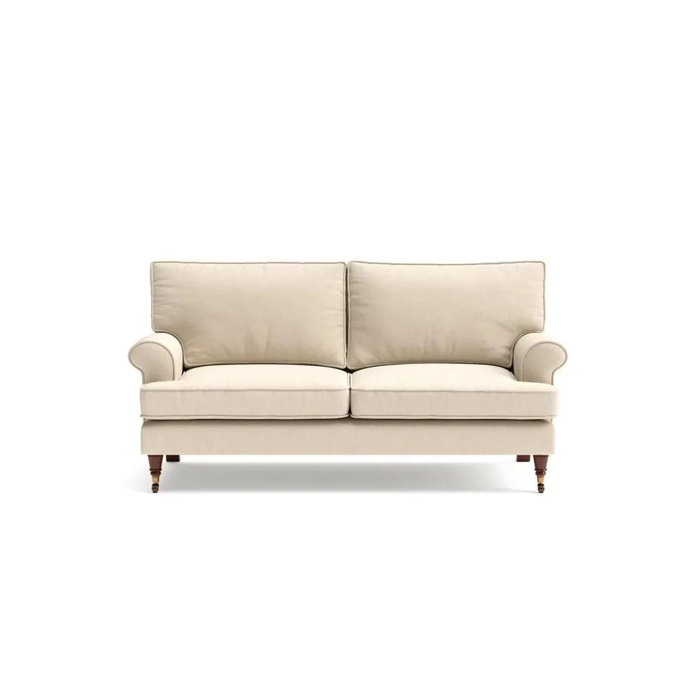 The sofa offers relaxed comfort with its gently scrolled arms and generously sized square cushioning. Traditional piping accents the design, while the castor legs provide mobility and support. The house weave fabric adds texture and durability, and the feather or low maintenance interior options suit different preferences.
