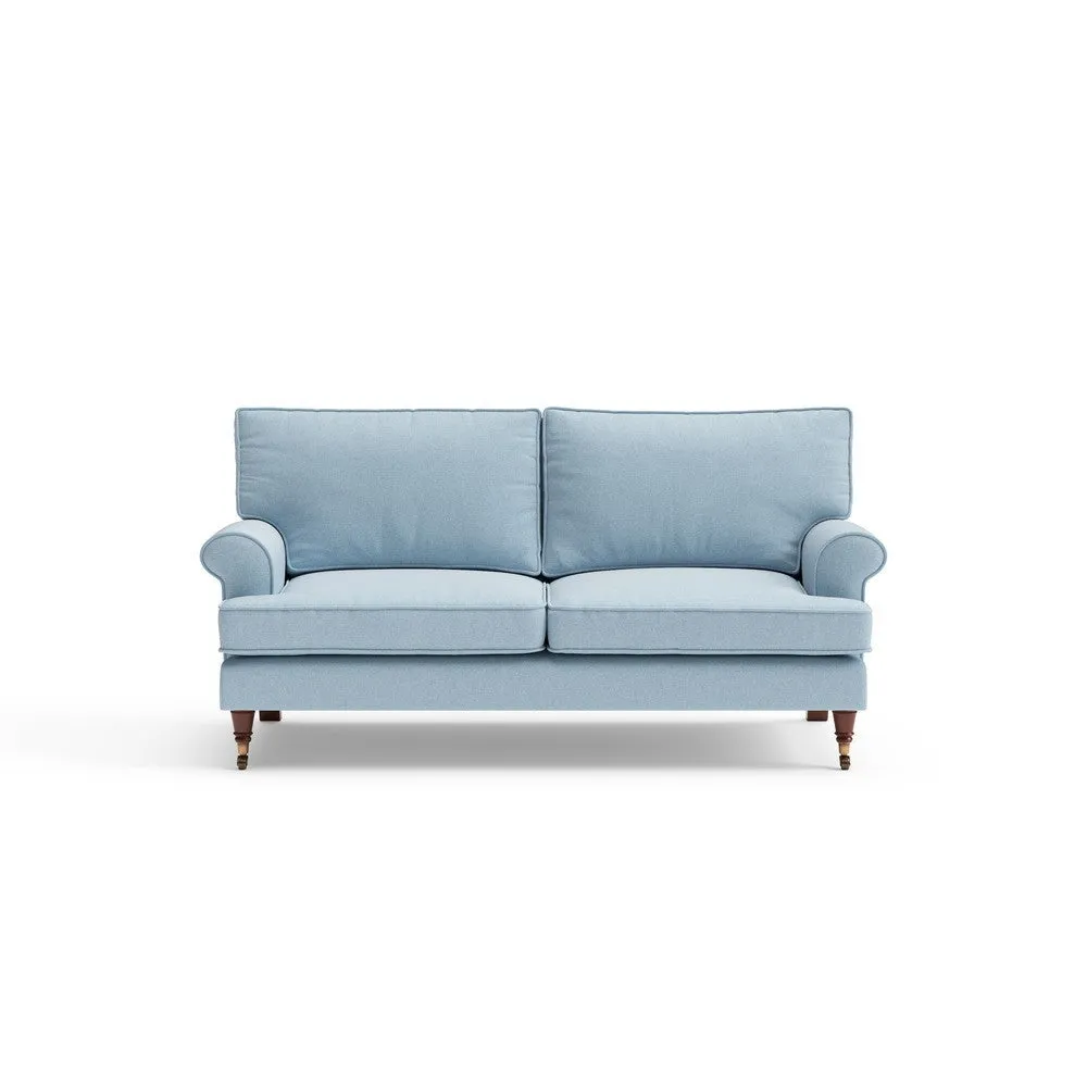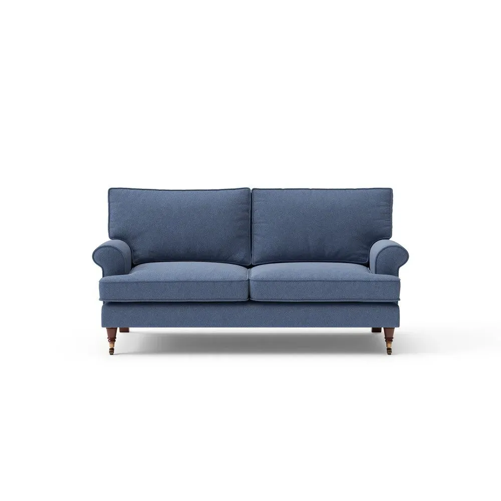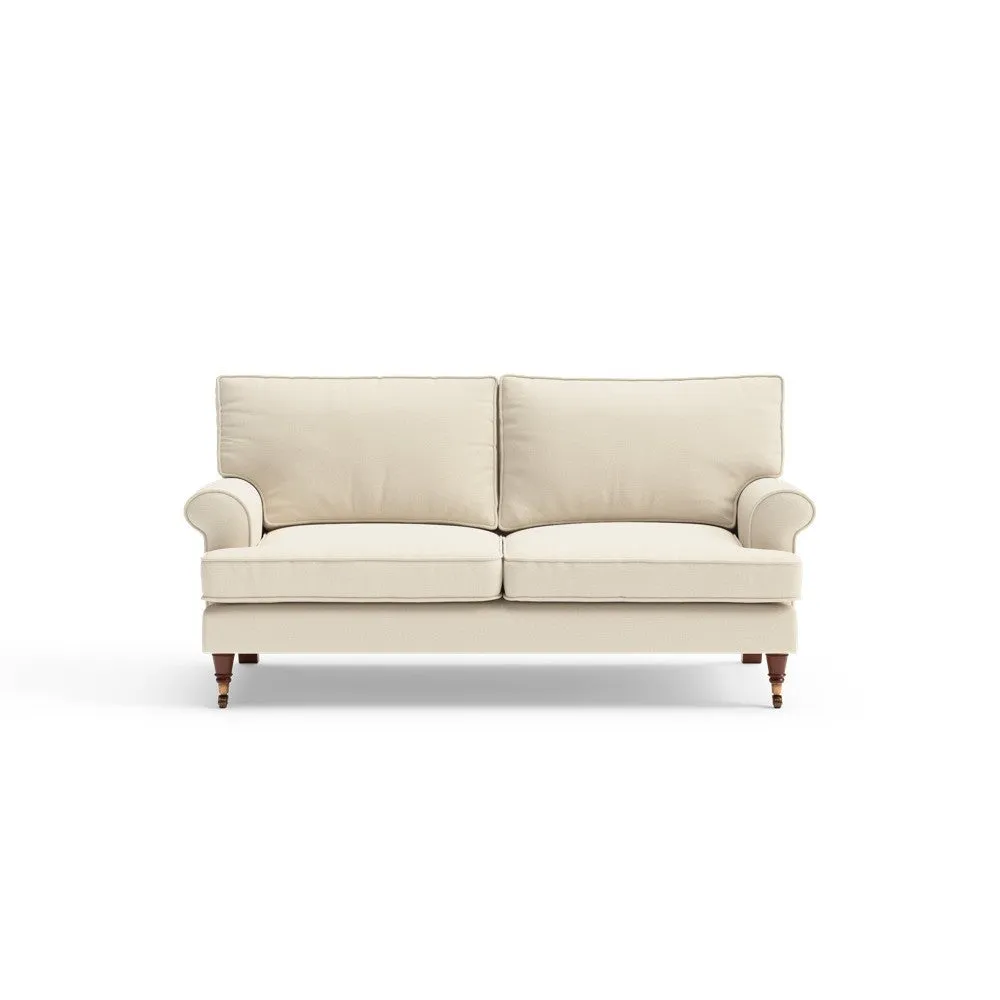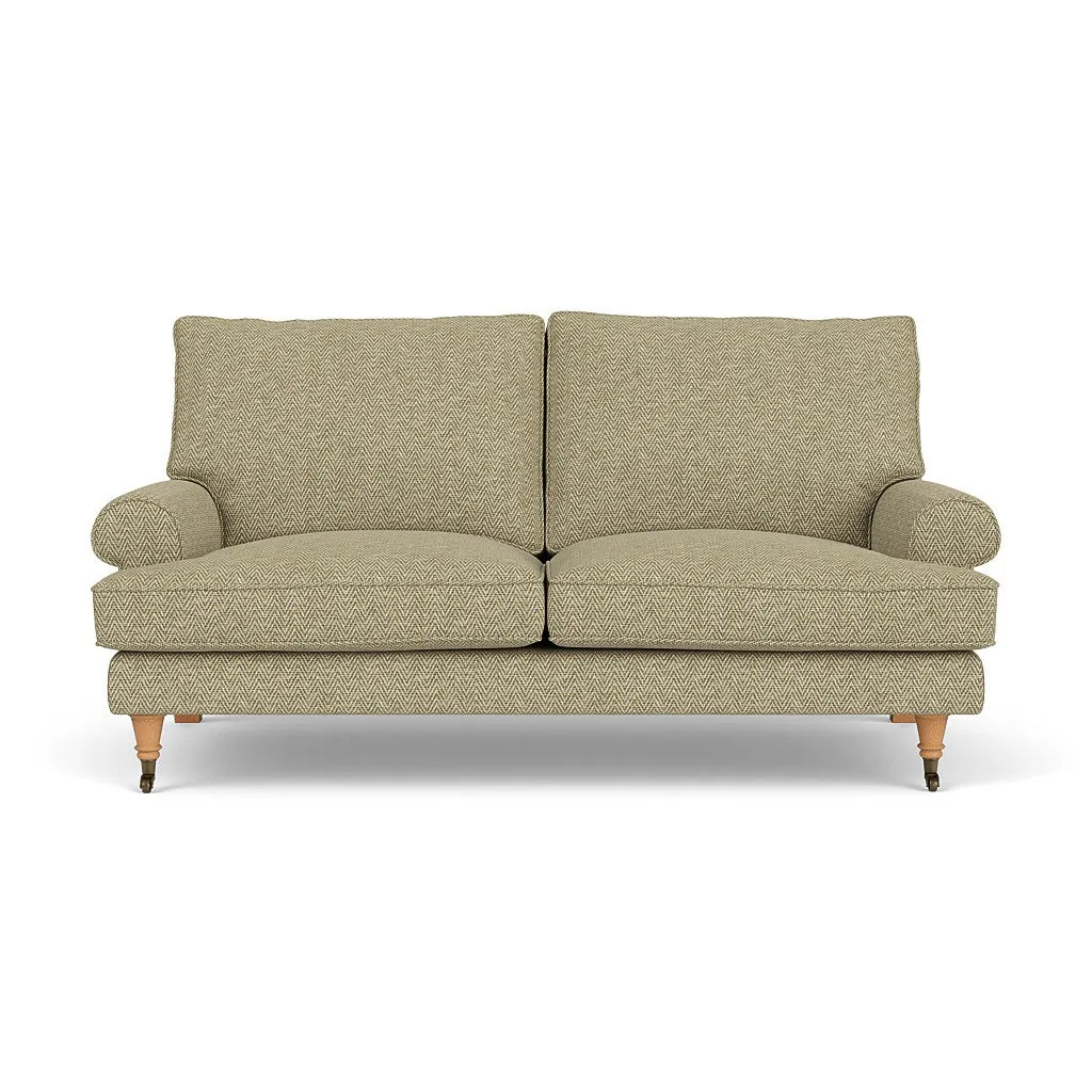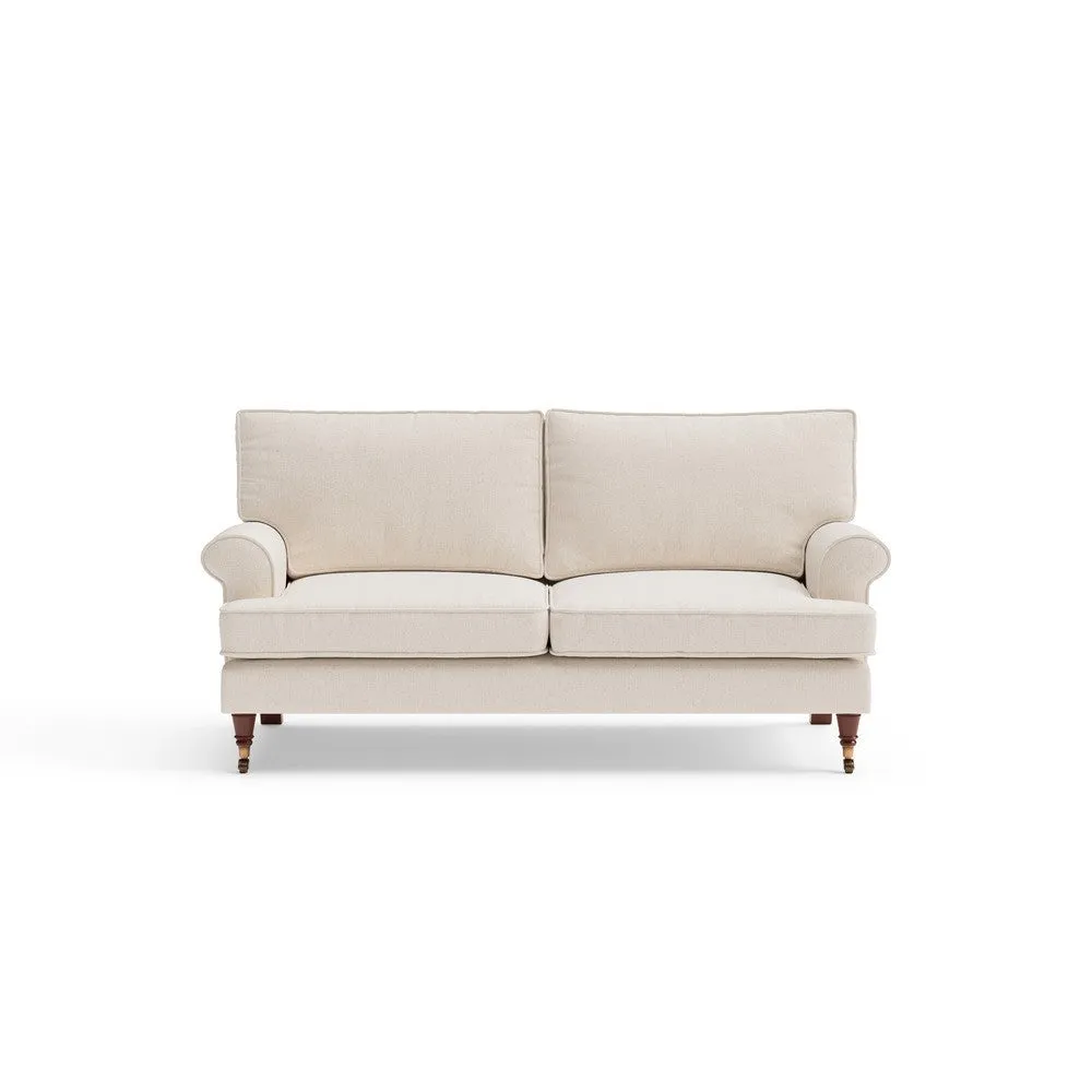 The sofa offers relaxed comfort with its gently scrolled arms and generously sized square cushioning. Traditional piping accents the design, while the castor legs provide mobility and support. The house weave fabric adds texture and durability, and the feather or low maintenance interior options suit different preferences.