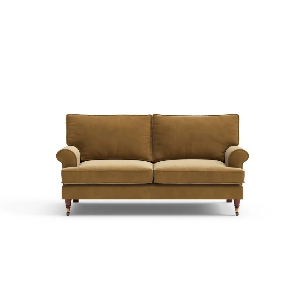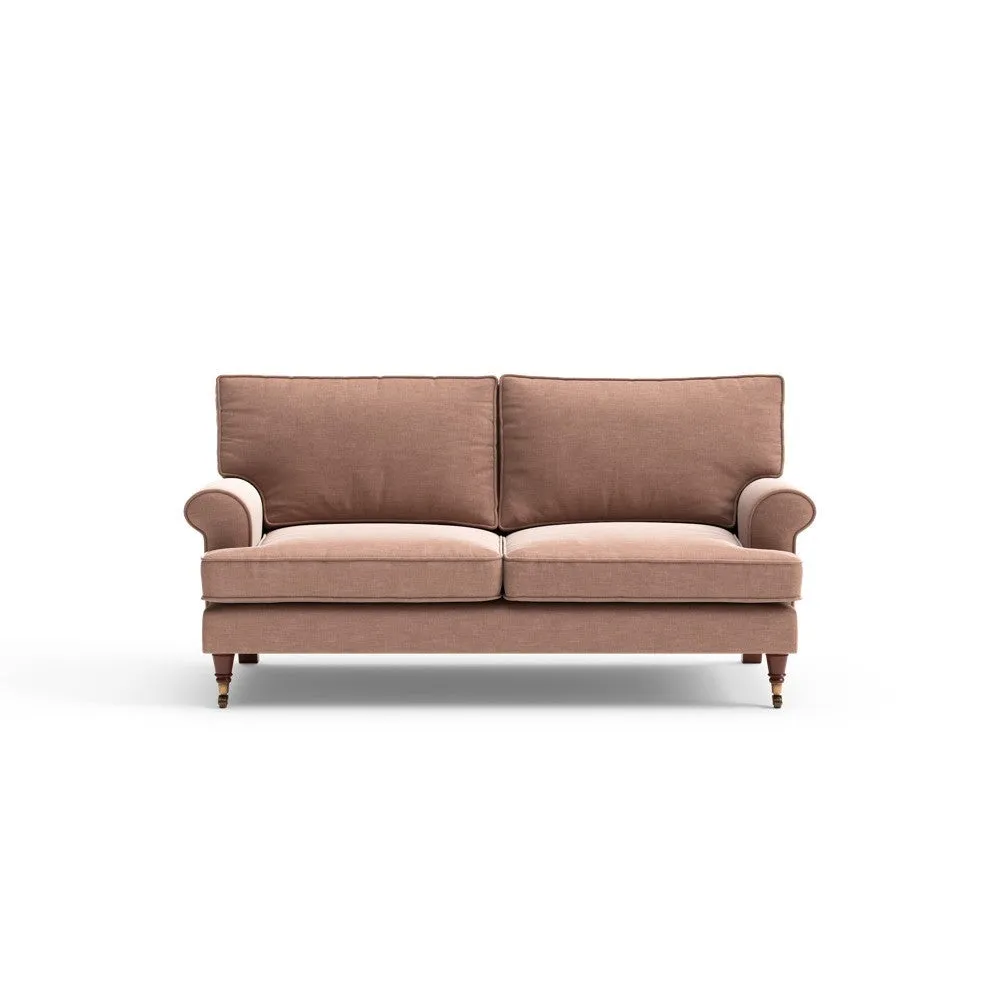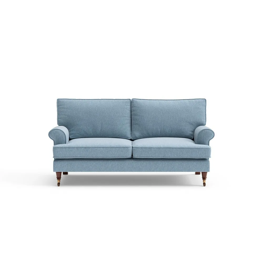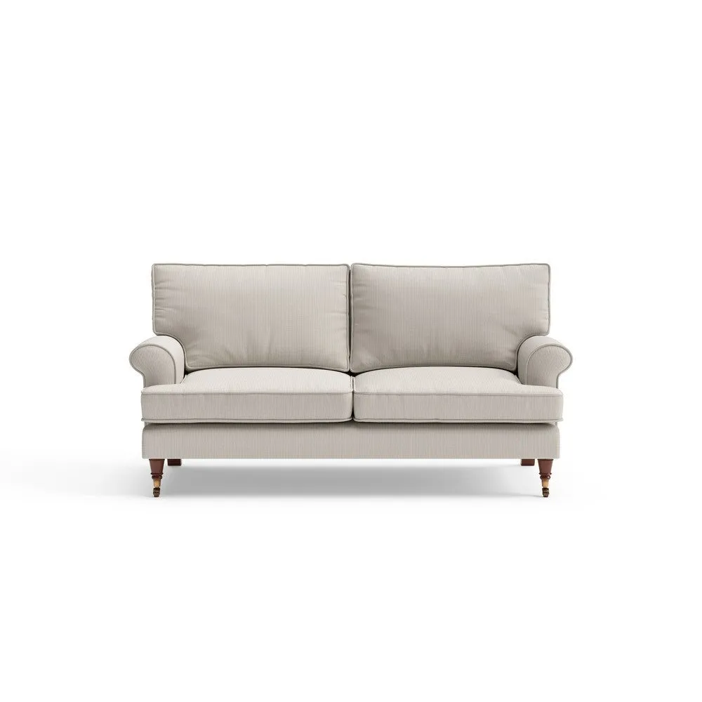 The sofa offers relaxed comfort with its gently scrolled arms and generously sized square cushioning. Traditional piping accents the design, while the castor legs provide mobility and support. The house weave fabric adds texture and durability, and the feather or low maintenance interior options suit different preferences.