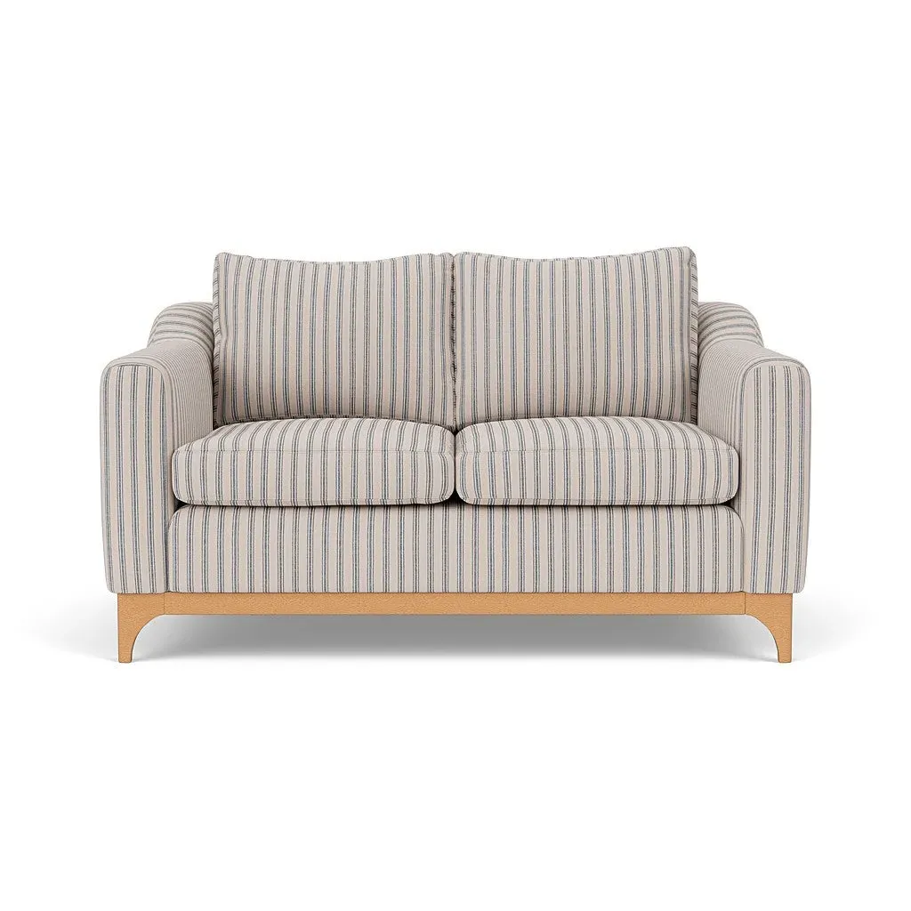 The sofa features a deep seat and structured shape for comfortable relaxation, complemented by its distinctive wooden base in light, mid or dark finish options. Its cushioning system allows choice between feather filling for softness or fibre for low-maintenance support. The rustic weave fabric adds texture while the wooden base provides stability.
