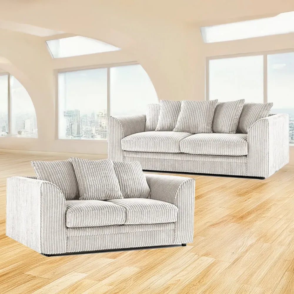 The sofa set offers comfort with its deep foam seating cushions and synthetic fibre-filled scatter back cushions. Its jumbo corduroy upholstery provides a soft texture, while the scatter back design adds relaxed support. The deep cushioning suits cosy evenings, and the cord fabric ensures durability. Requires minimum door width of 65cm.