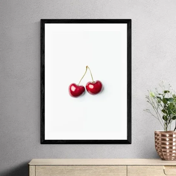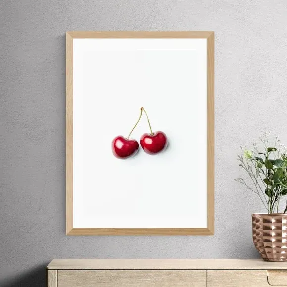 The Cherry II Art Print offers minimalist charm with its vibrant red cherry design on crisp white background. Printed using the Giclee process on 210gsm acid-free archival paper, it provides fade resistance lasting up to 70 years. The digital white border frames the artwork beautifully, while optional Obeche wood frames are available in black, white, and oak effect finishes. Available in A1, A2, A3, and A4 sizes to suit various display needs.