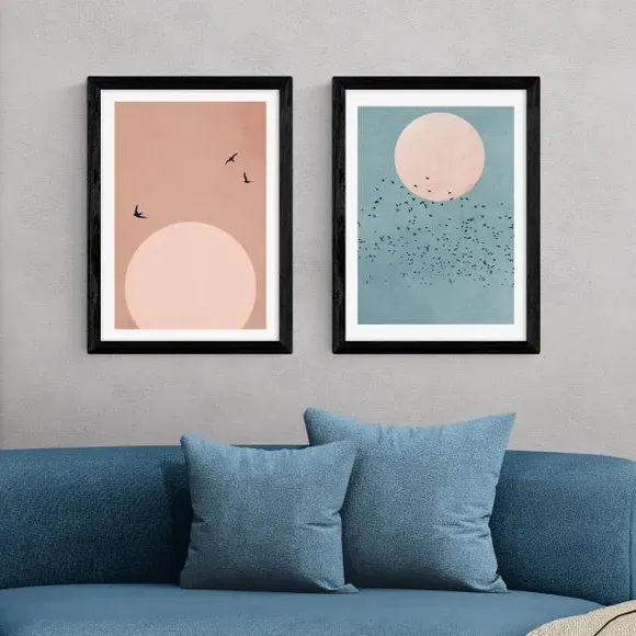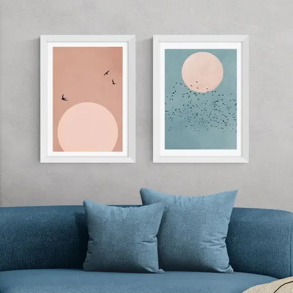 The wall print set offers coastal calm with its soft tones and sweeping lines that capture open skies and gentle horizons. Featuring giclee printing on 210gsm acid-free archival paper, the process provides fade resistance lasting up to 70 years. The prints come in multiple size options from A4 to A1, while frame choices include black, white, and oak effect finishes for versatile display.