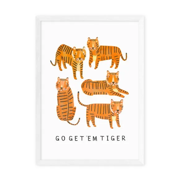 * Motivational typography* Tiger design* Vibrant colour* Available in A1, A2, A3 & A4 sizes* Choice of black, white and oak effect Obeche wood frames* You can buy the print unframed too!* Giclee printed on 210gsm acid free archival paper This bright and vibrant Tiger print features a motivational sentiment, with the words, ‘Go Get Em Tiger’ underneath the tiger illustration. Great for a pop of colour and to add an extra bounce into your day. You can customise the size and frame for this print! Choose from a variety of frame options and then pick your size. This way you can find the best design to suit your home interior. Each piece of artwork has gone through a giclee printing process which will help the print stay vibrant for years to come, keeping your home looking fresh. For every print sold, a percentage of profit is donated to Cool Earth, a charity combating deforestation in the rainforest.