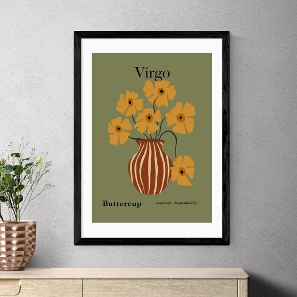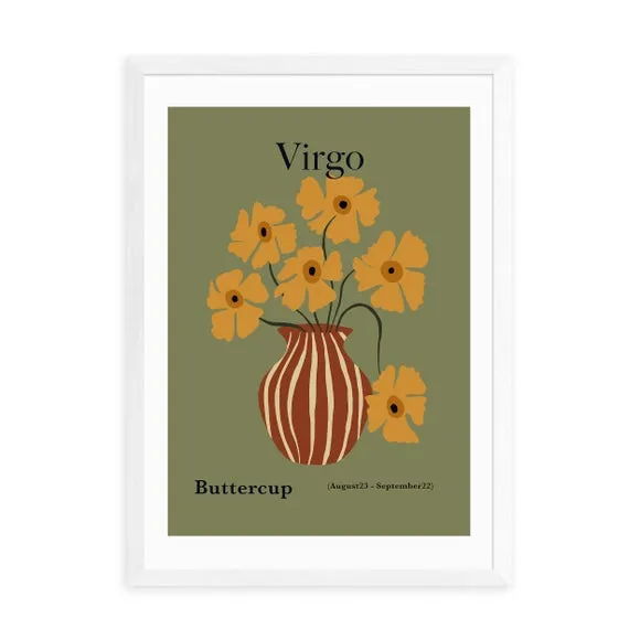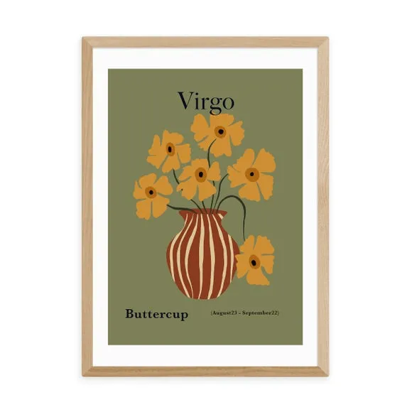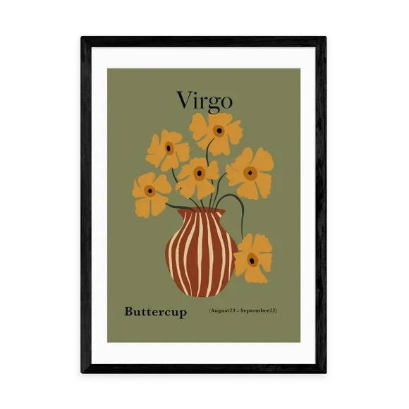 * Virgo Inspired* Artwork by Miho Art Studio* Printed on 210GSM Acid-Free Archival Paper* Available in A1, A2, A3, & A4 Sizes* Frame Options: Black, White, Oak Effect, & Unframed Add a touch of beauty with this stunning print of buttercups in a striped vase, inspired by the Virgo star sign. Tailor your print by selecting your ideal frame and size. Printed on 210gsm acid-free archival paper, it comes with a digital white border. With giclee printing, your artwork will stay fresh and colorful for up to 70 years. Please Note: For every print sold, a percentage of profit is donated to Cool Earth - a charity combating deforestation in the rainforest.