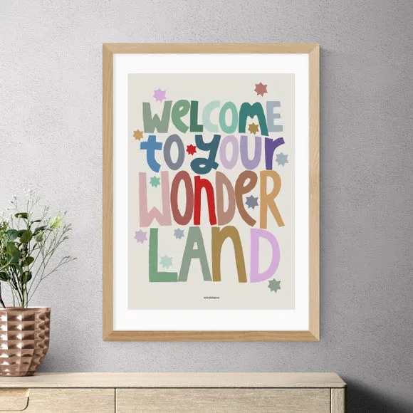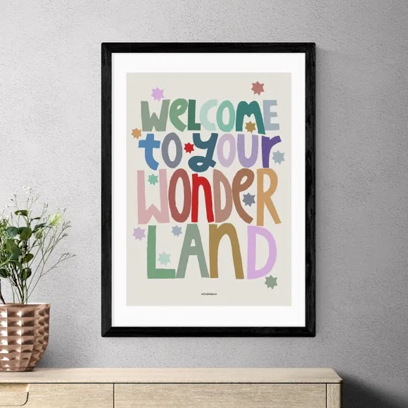 * Colourful Print* Artwork by Wonder and Rah* Printed on 210GSM Acid-Free Archival Paper* Available in A1, A2, A3, & A4 Sizes* Frame Options: Black, White, Oak Effect, & Unframed Welcome guests with this colourful typographic print saying “welcome to your wonderland.” Tailor your print by selecting your preferred frame and size. Crafted on 210gsm acid-free archival paper, it includes a digital white border for a clean, crisp look. With the giclee printing process, your artwork will stay vivid and fresh for up to 70 years. Please Note: For every print sold, a percentage of profit is donated to Cool Earth - a charity combating deforestation in the rainforest.