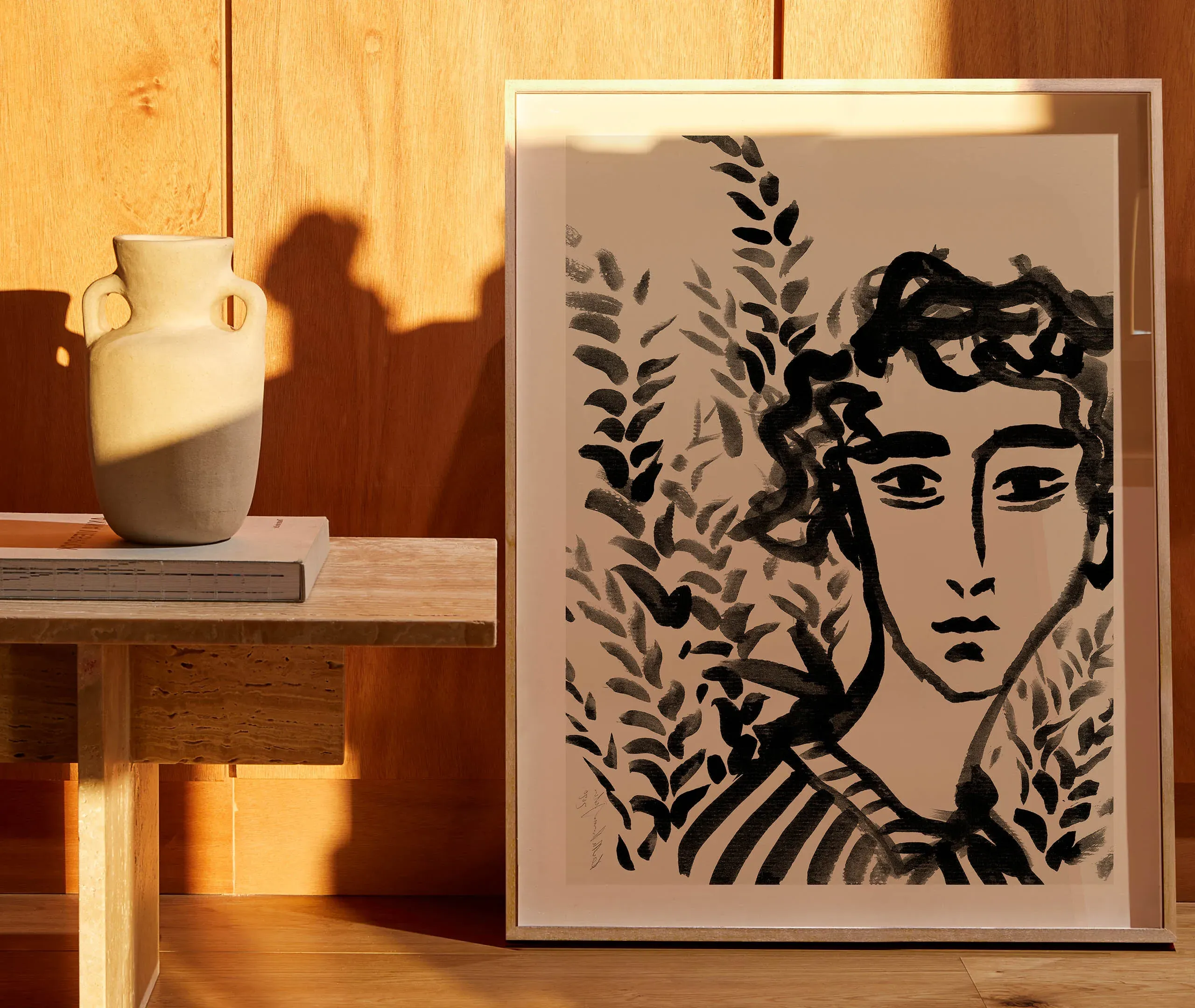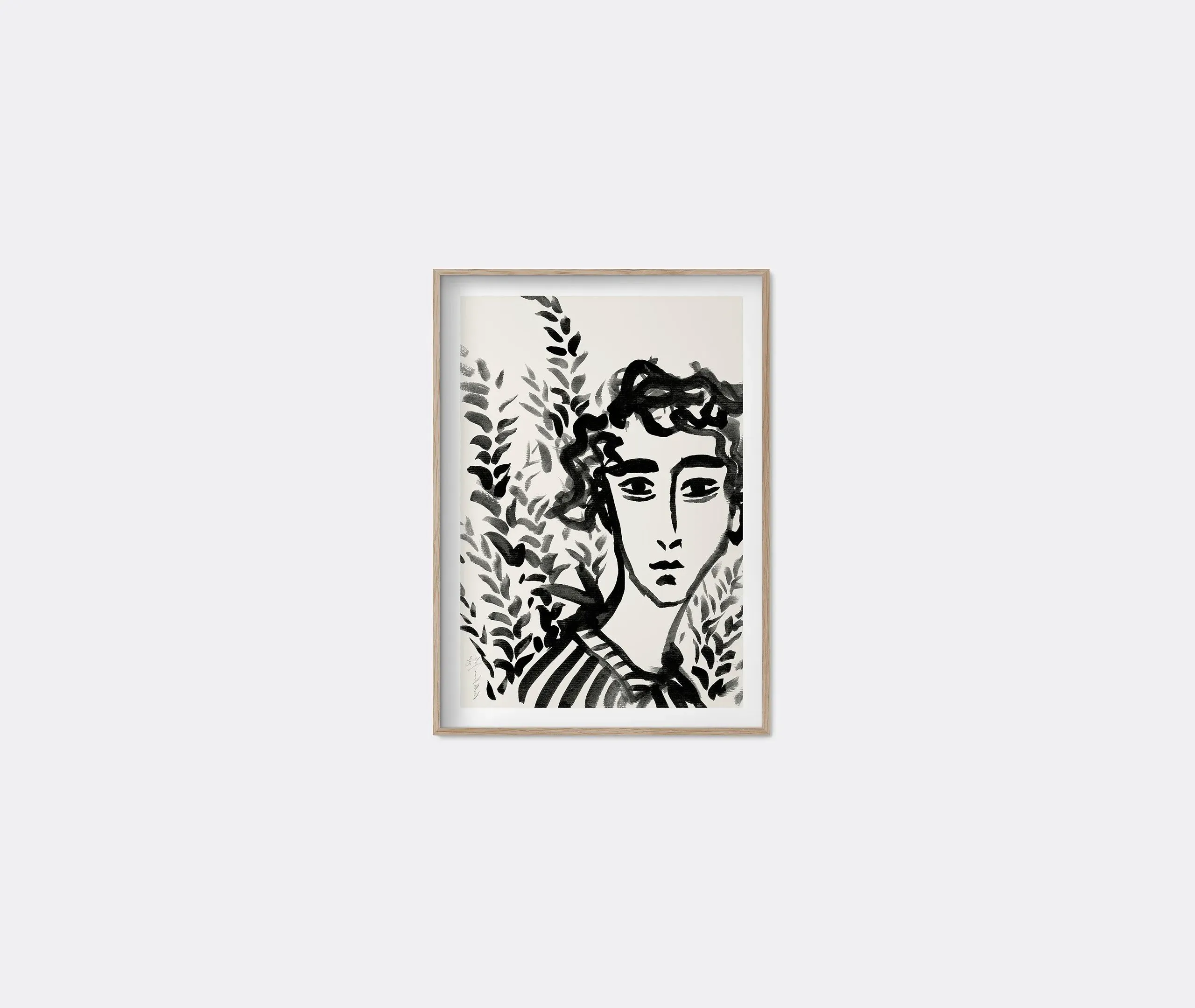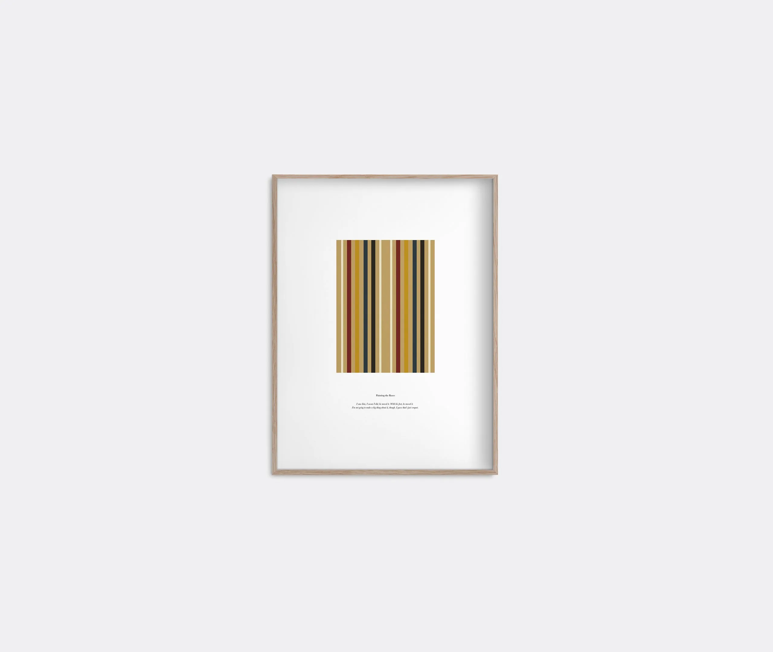 The framed art print features a multicoloured stripe pattern with compelling narrative elements. Its bright colours create visual interest, while the light brown frame adds warmth to any wall display. The piece combines traditional pattern work with contemporary storytelling, and the sturdy frame construction ensures lasting durability.