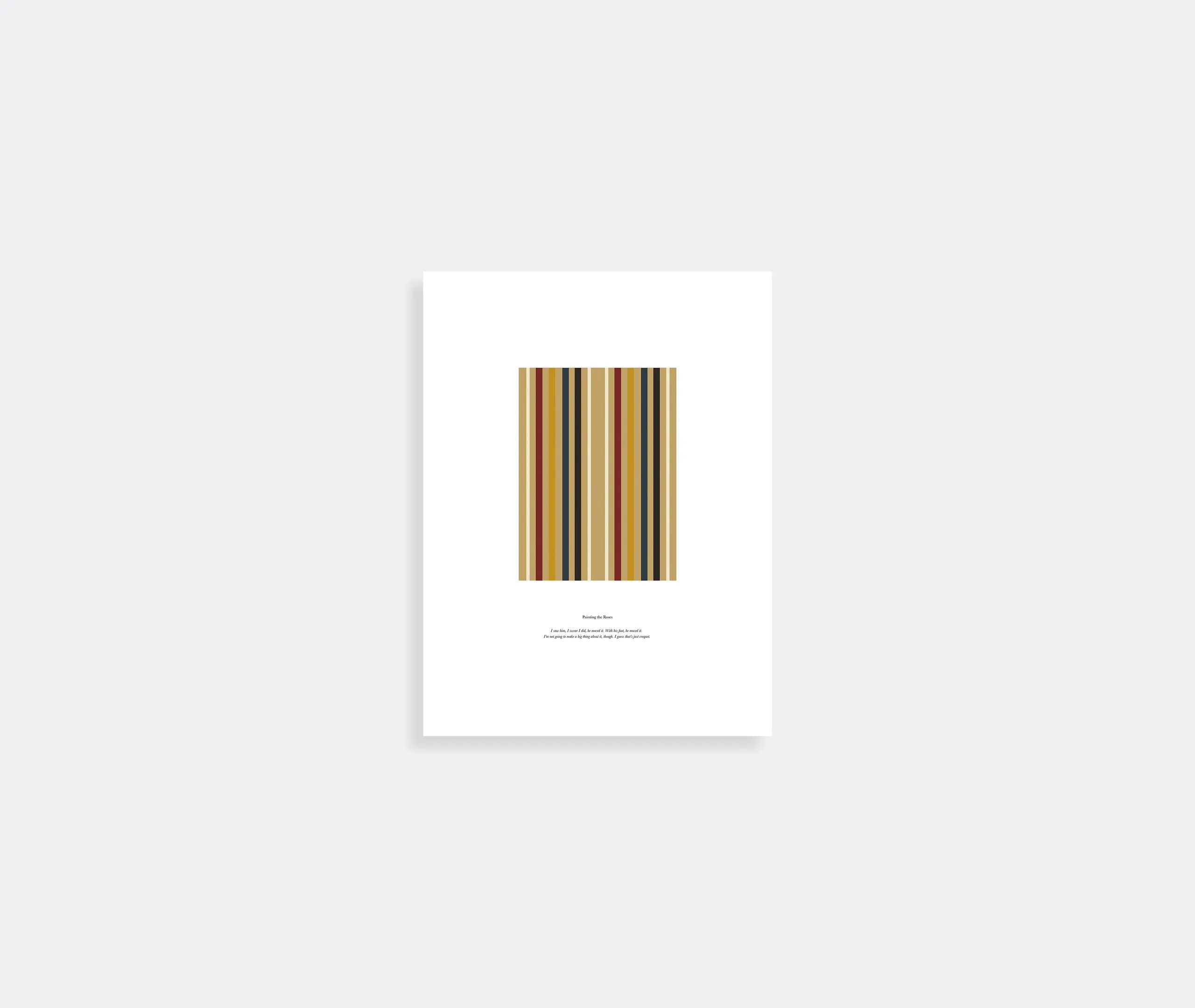 An exploration of one of the oldest and most widely used patterns — the stripe — Master Studio's collection of framed prints is a brightly coloured series accompanied by compelling narratives that hint at the lineage of each image. This multicoloured image features the following short: Master of Beagles There was once a young country cottage filled with bric-à-brac as far as the eye could see. One’s eye darted side to side, up and down then east to west and north to south once more. The cottage belonged to both everyone and no-one, and was located somewhere and nowhere in particular. I guess that’s club life.