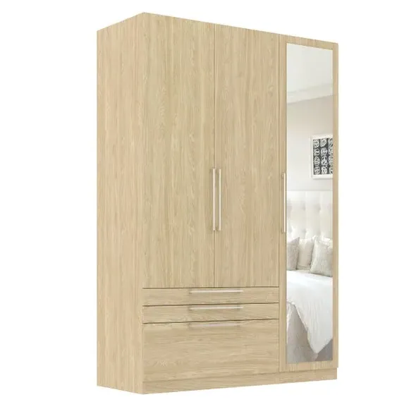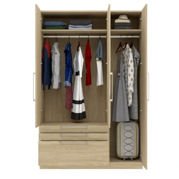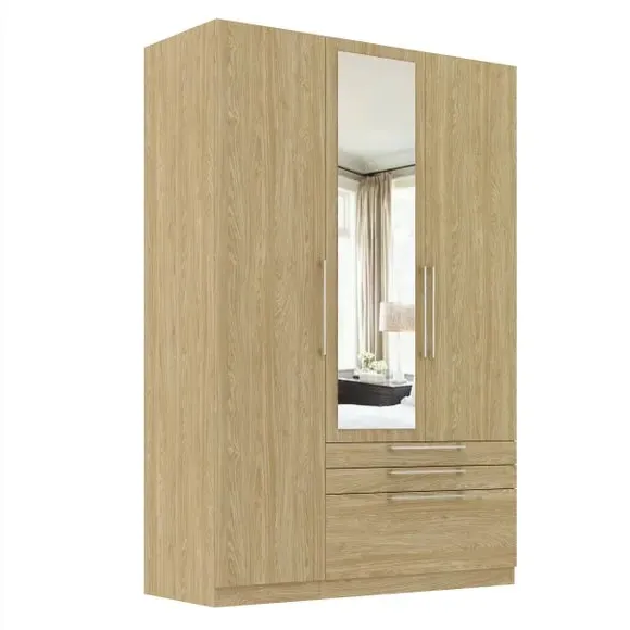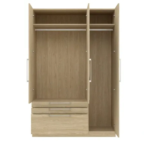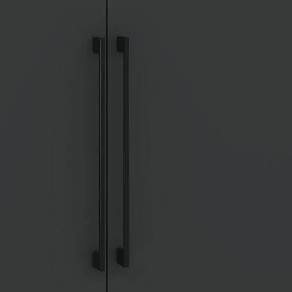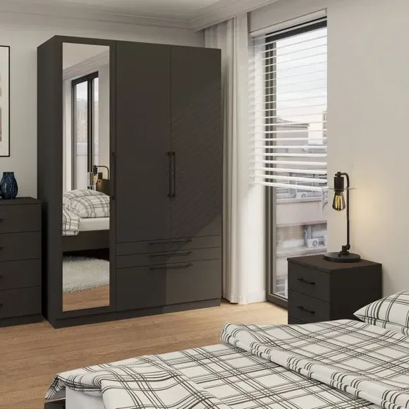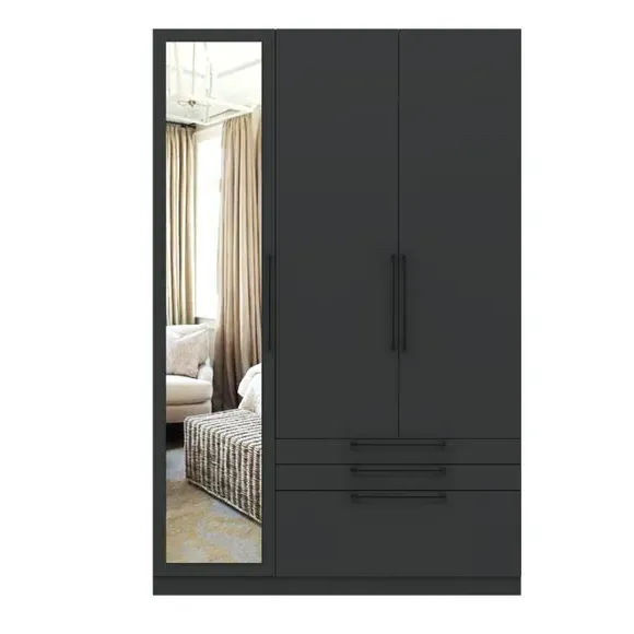 The wardrobe combines spacious storage with practical organization through its triple-door design and three soft-close drawers. Its adjustable shelves and hanging rails provide flexible storage options, while the modern metal bar handles add contemporary appeal. The soft-close mechanism ensures smooth operation, and the anthracite finish offers a sleek modern look.