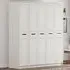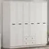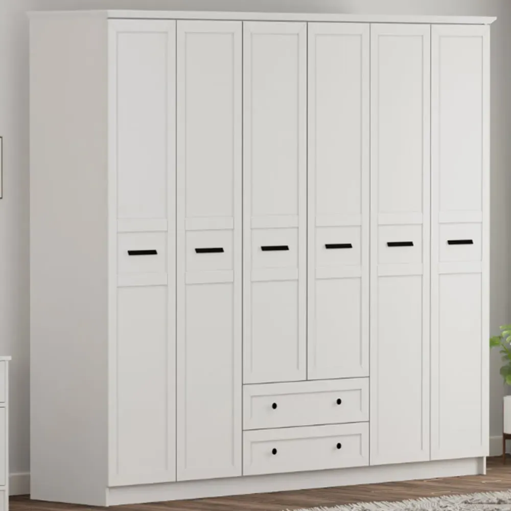 The DAISY wardrobe offers French-inspired design with three doors and two drawers, complemented by inner shelves and a hanging rod. Its membrane-coated MDF board construction features a matt finish, while the sleek black handles provide easy access. The CNC-finished structure ensures stability, and the organized interior provides ample storage for clothes and essentials.