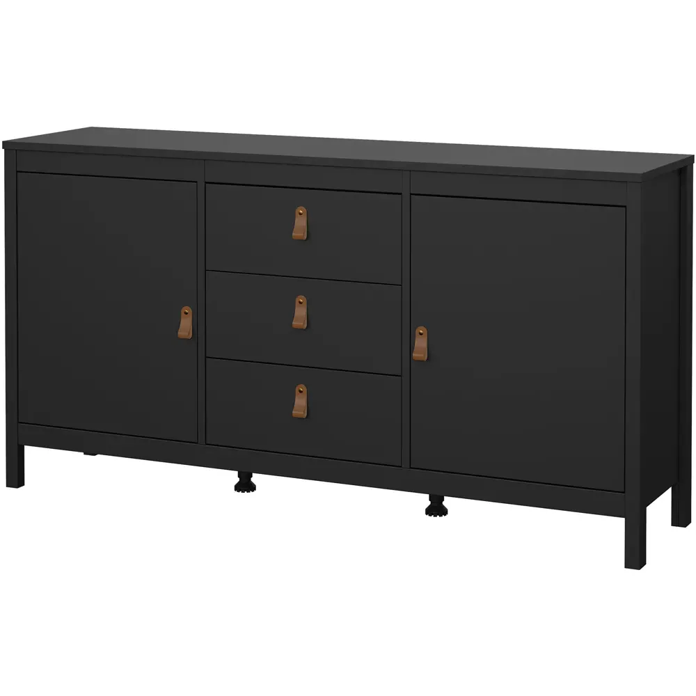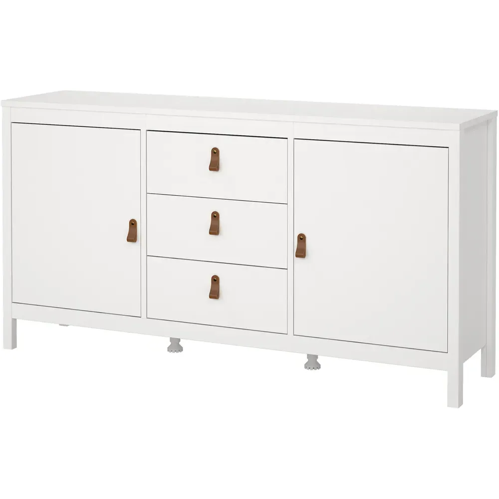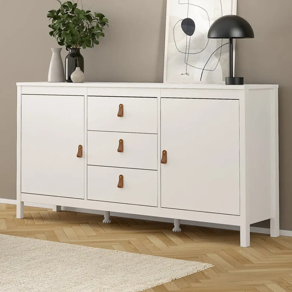 Upgrade your home interiors with the Barcelona Sideboard. It is a practical storage solution with a contemporary design that will complement most interior spaces. This white sideboard is crafted using PEFC certified sustainable wood. It features a two-door design with two storage compartments and one drawer, complete with uniquely designed brown leather tab handles for easy accessibility. It also features a high-quality laminated board resistant to scratches, damage, moisture and high temperature.