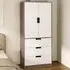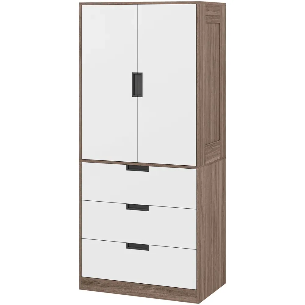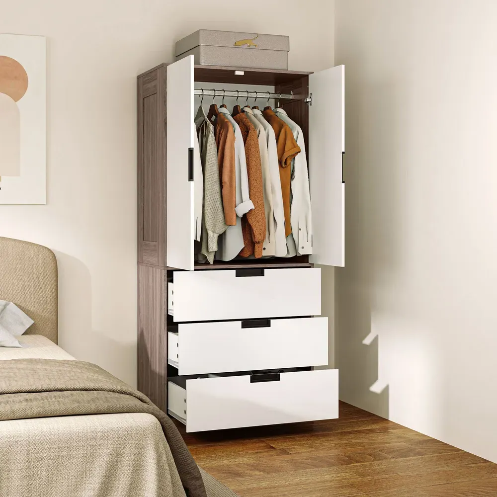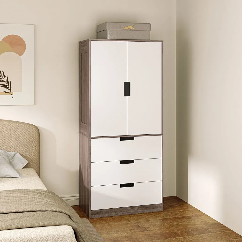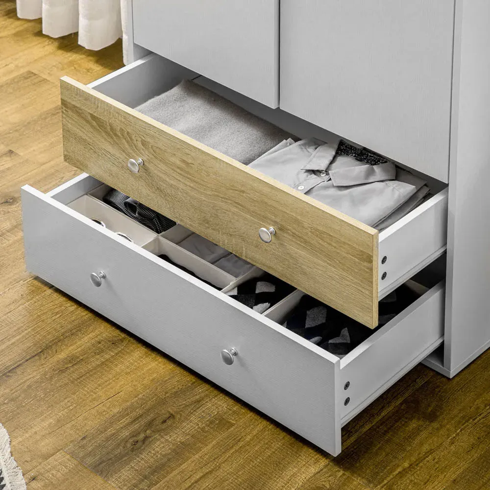 The wardrobe combines hanging space with two bottom drawers for versatile clothing storage. Built from particle board with wooden legs, it offers stability and reliability for everyday use. The wood-effect design matches existing furniture effortlessly while providing practical organization for both hanging and folded garments.