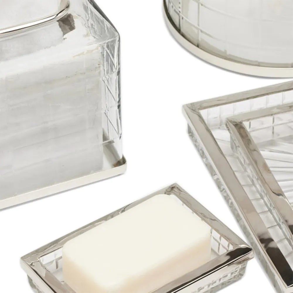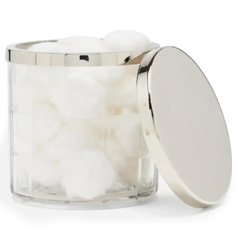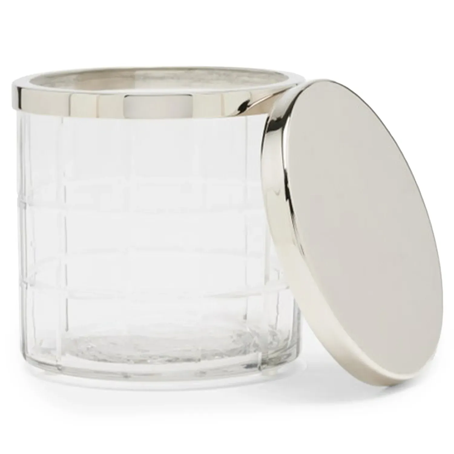 The Argos Bath Canister offers organized storage with its textured glass construction and nickel accents. The durable glass base features nickel detailing that adds visual interest while providing reliable containment for bathroom essentials. Its compact design suits countertop placement, and the secure construction ensures lasting performance. W8 x D8 x H10 cm.