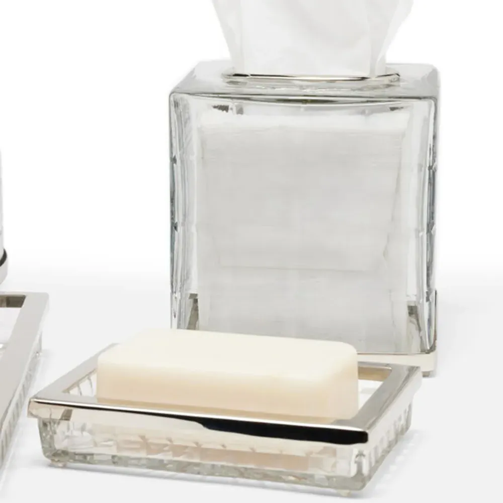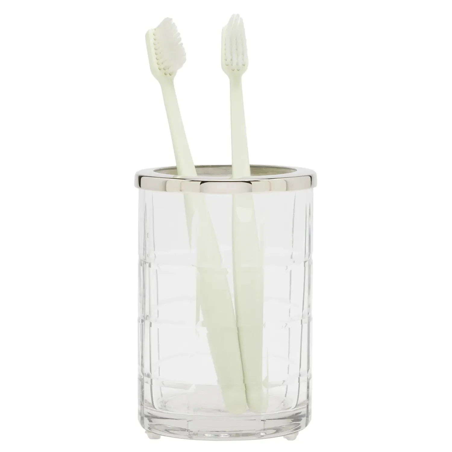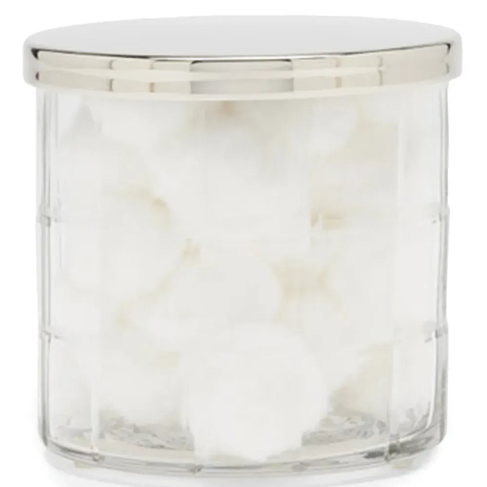 The Argos Bath Canister offers organized storage with its textured glass construction and nickel accents. The durable glass base features nickel detailing that adds visual interest while providing reliable containment for bathroom essentials. Its compact design suits countertop placement, and the secure construction ensures lasting performance. W8 x D8 x H10 cm.