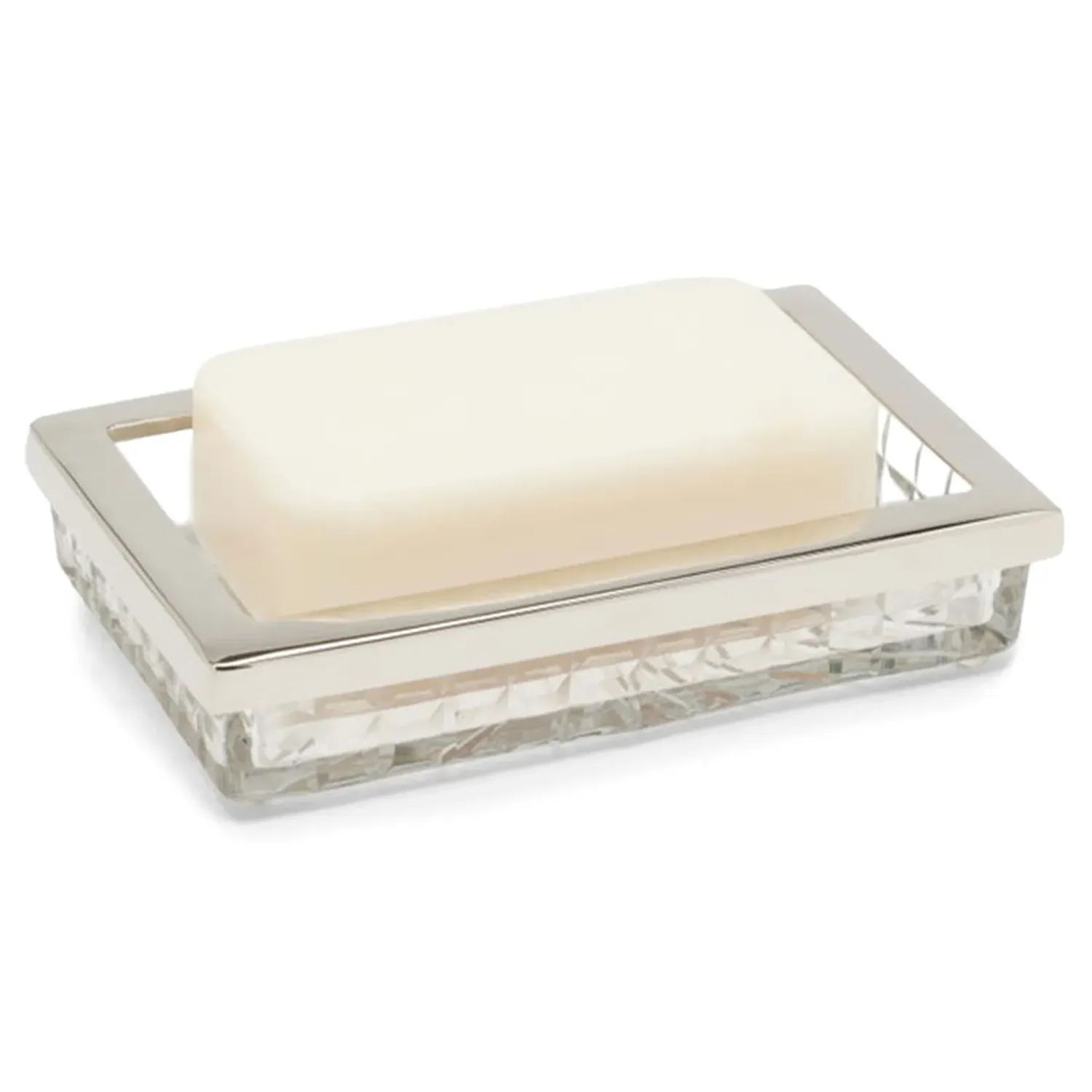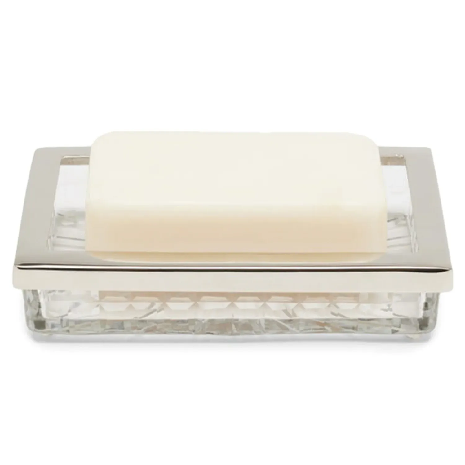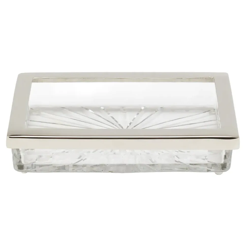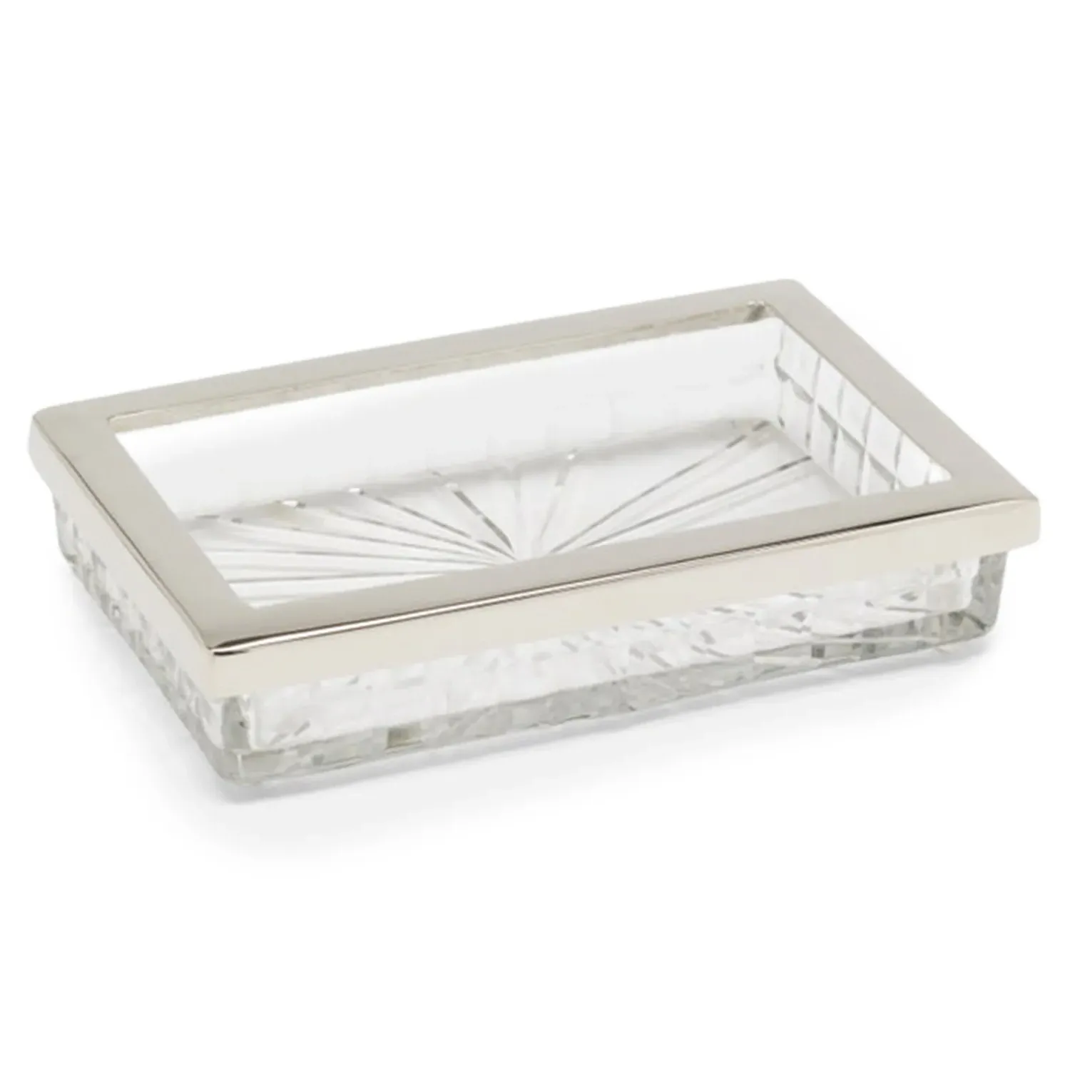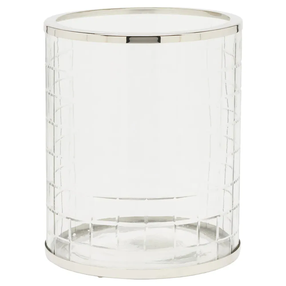 4 inches high x 3 inches wide x 3 inches deep. Constructed from glass and nickel. Finished in clear and nickel.