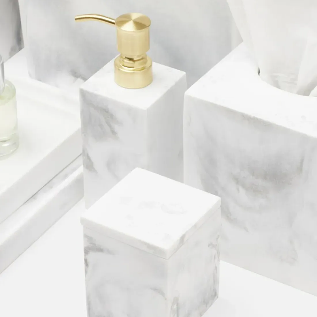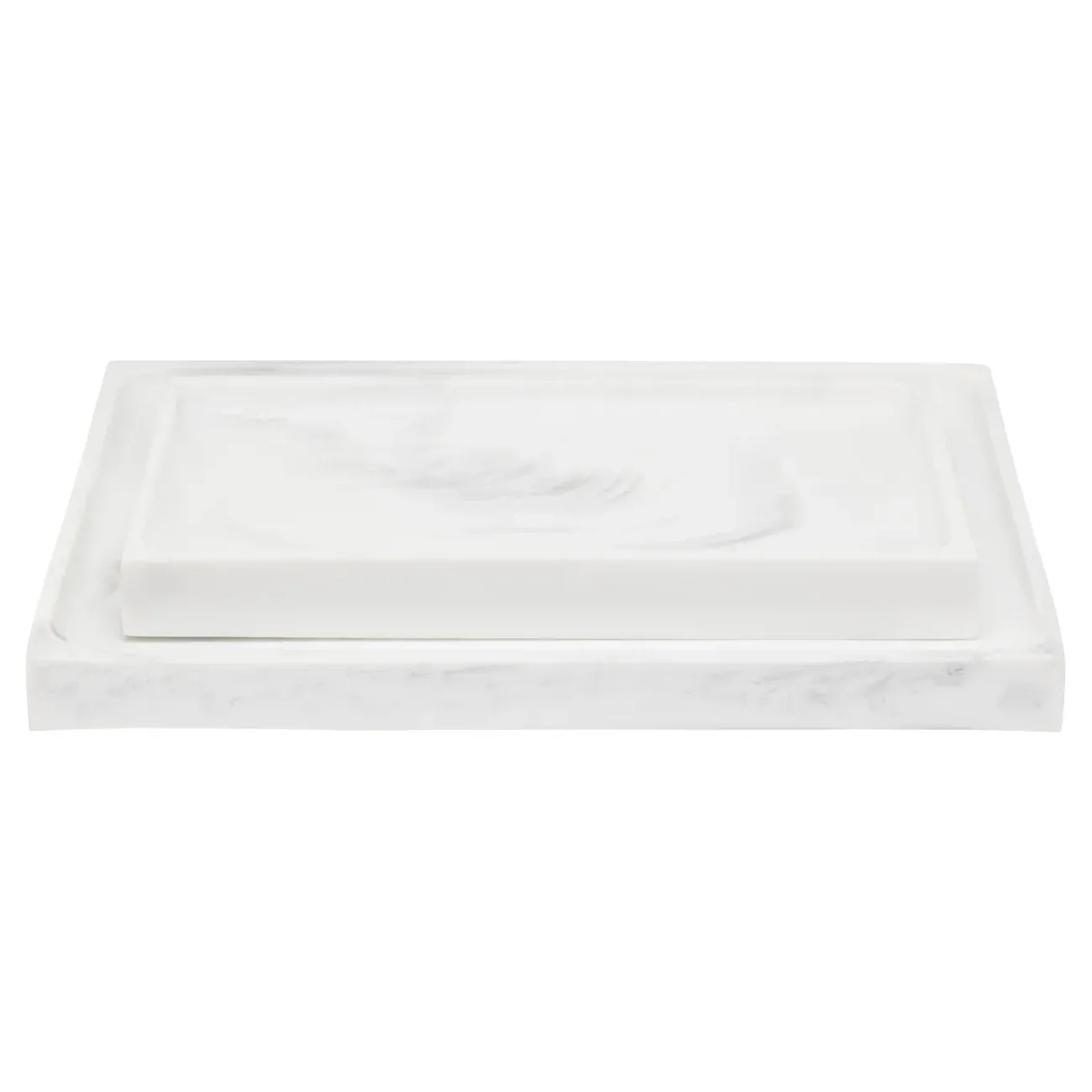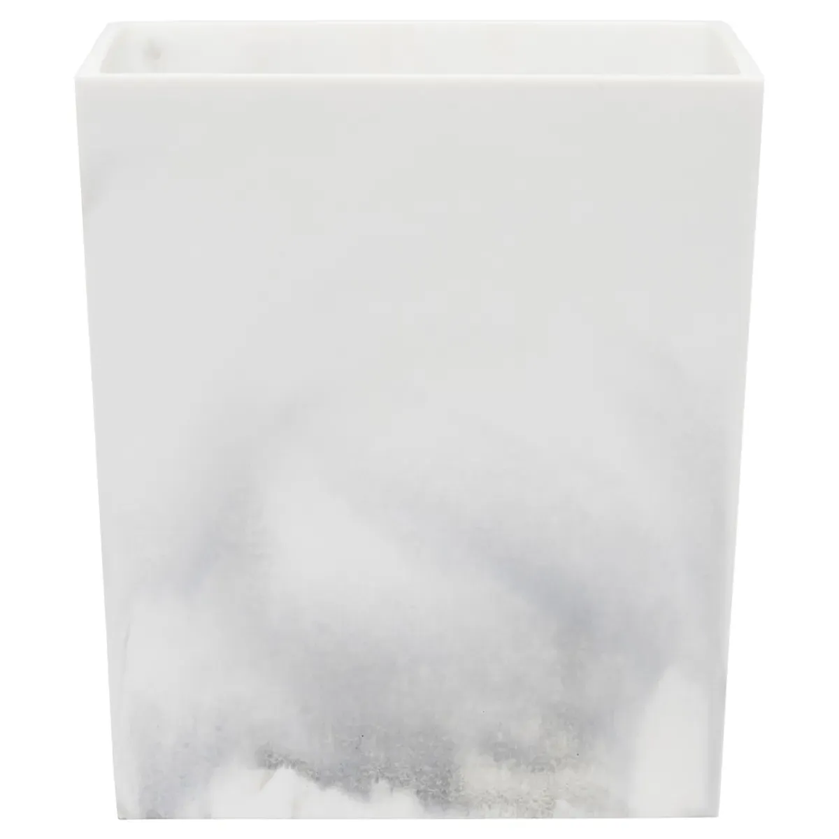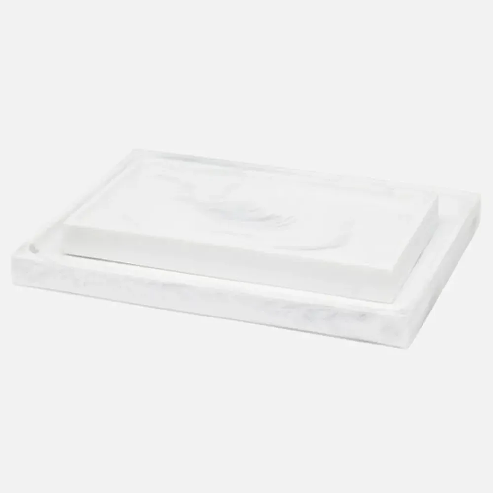 The Parma soap dish combines practicality with its low-profile resin construction, featuring a swirled white and grey finish. Its rectangular design provides ample surface area for soap bars, while the raised edges contain moisture. The smooth resin surface ensures easy cleaning and prevents soap residue buildup. W10.2 x D15.2 x H2.5 cm