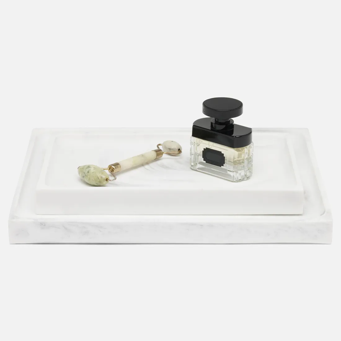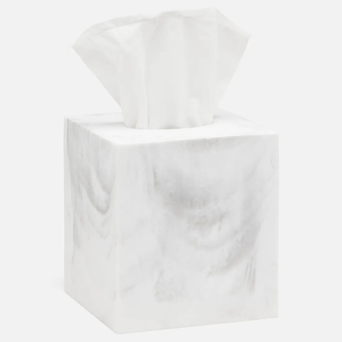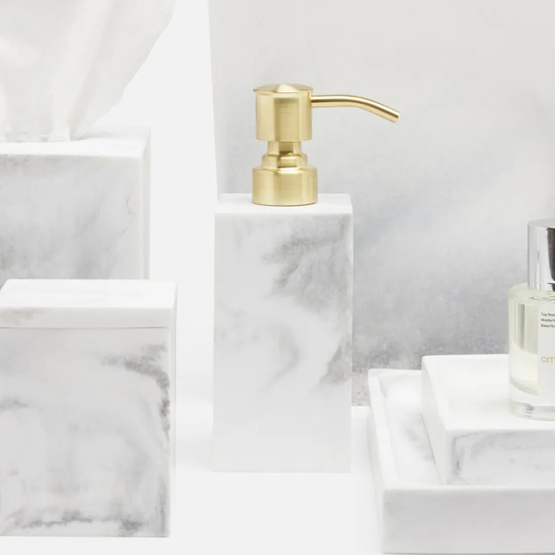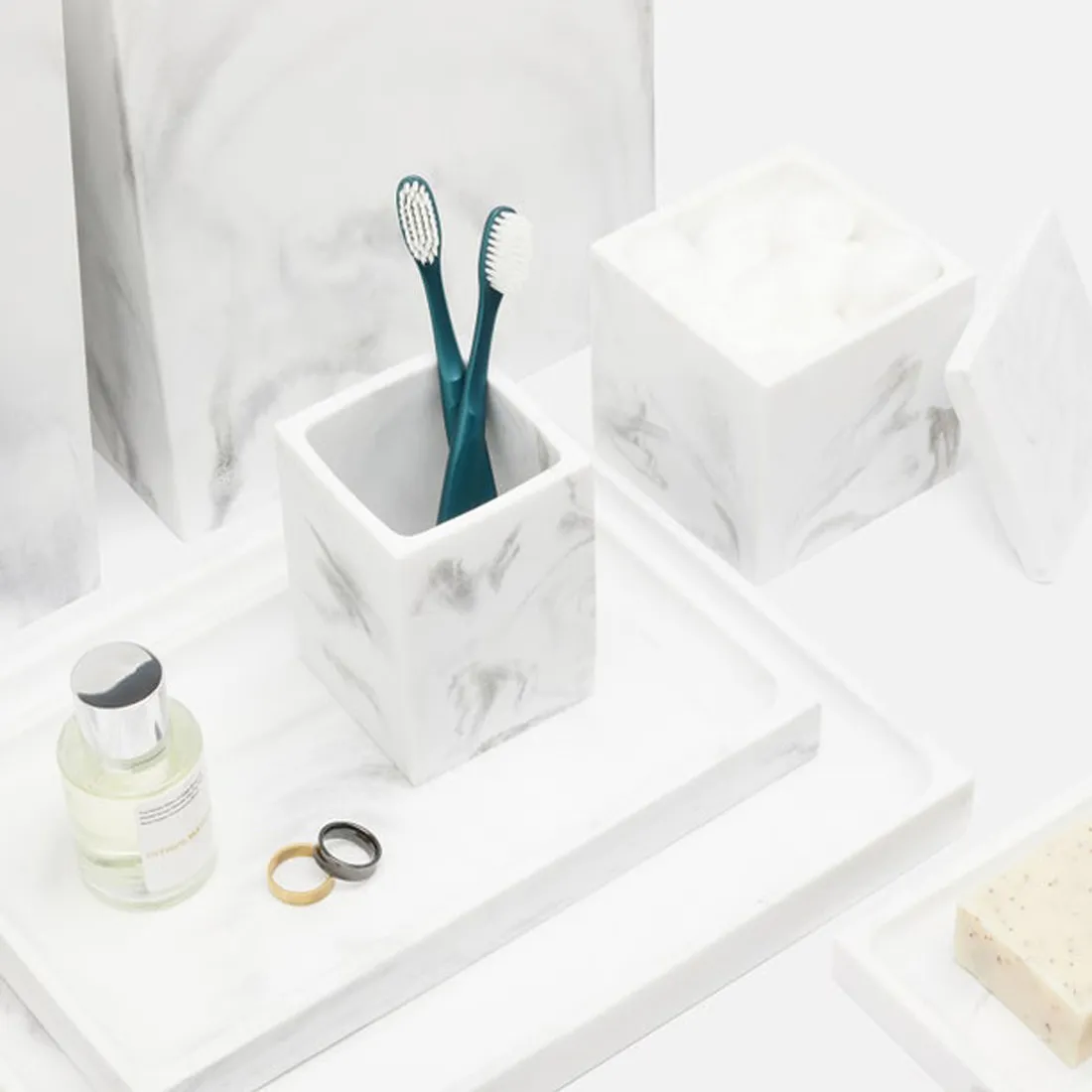 The Parma soap dish combines practicality with its low-profile resin construction, featuring a swirled white and grey finish. Its rectangular design provides ample surface area for soap bars, while the raised edges contain moisture. The smooth resin surface ensures easy cleaning and prevents soap residue buildup. W10.2 x D15.2 x H2.5 cm