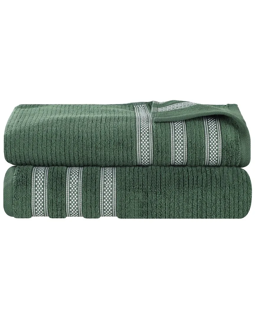 The Brea towel set offers natural softness and impressive absorbency with its zero twist cotton construction. The smooth loop technique provides enhanced performance and longevity, while secure hemmed edges prevent fraying. Each towel features a ribbed texture with geometric border detailing and hanging loops for convenient drying. The set includes 1 washcloth (13" x 13"), 1 hand towel (16" x 30"), and 1 bath towel (30" x 54").