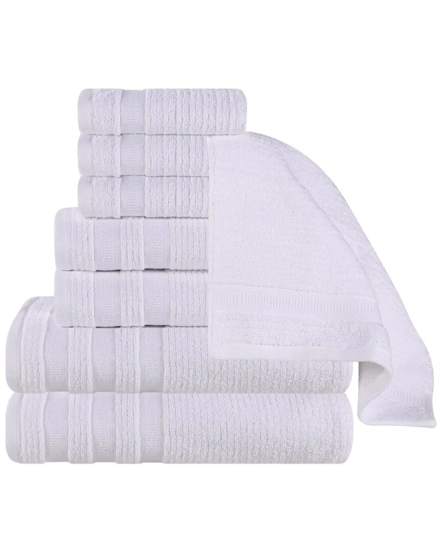 About the brand: Luxurious staples for the bedroom and bathroom. Superior Brea Zero Twist Cotton Ribbed Geometric Border Plush Soft Absorbent 3-Piece Towel Set, in white Design details: Effortlessly merge opulence and practicality with the extravagant Zero Twist Cotton Ribbed Geometric Border Plush Soft Absorbent 3-Piece Towel Set. These ultra-plush towels are crafted from Cotton for natural softness and impressive absorbency. The zero twist technique boasts smooth loops to that offer impressive performance and longevity. Finished with secure hemmed edges to avoid fraying and a durable single-ply, these towels can withstand countless washes and last you years to come. For added style, each piece in this bundle features a ribbed texture and stylish geometric border and a hanging loop for effortless drying. This set includes 1 Face Towel/Washcloth, 1 Hand Towel, and 1 Bath Towel to complete your bathroom essentials. Measurements: face towel/washcloth measures 13in x 13in, Each hand towel measures 16in x 30in, Each bath towel measures 30in x 54in Fabric: 100% cotton Machine wash Imported Contents of Set: One Face Towel/Washcloth One Hand Towel One Bath Towel