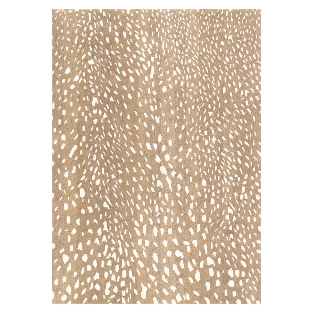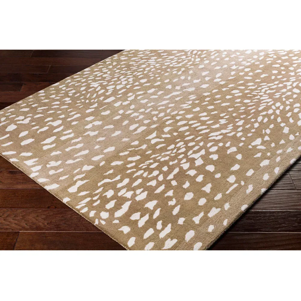The Eleanor rug sample provides a tactile preview of the hand-tufted 100% wool construction, featuring the playful spotted pattern in light brown and cream hues. Its plush medium pile demonstrates the softness and quality of the full-size rug. The 0.63-inch pile height showcases the substantial texture and luxurious feel. W46 x D46 cm.