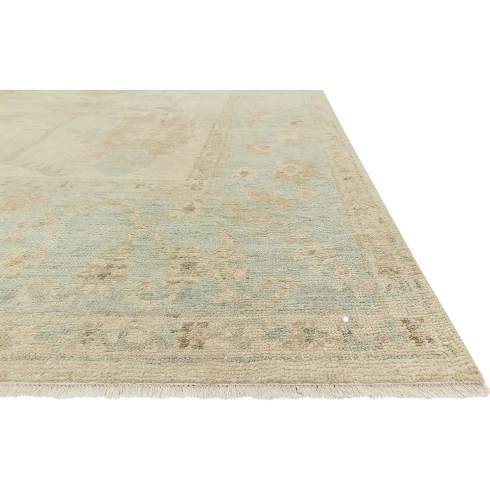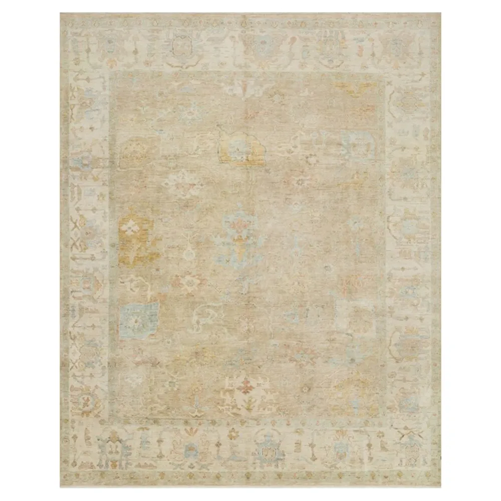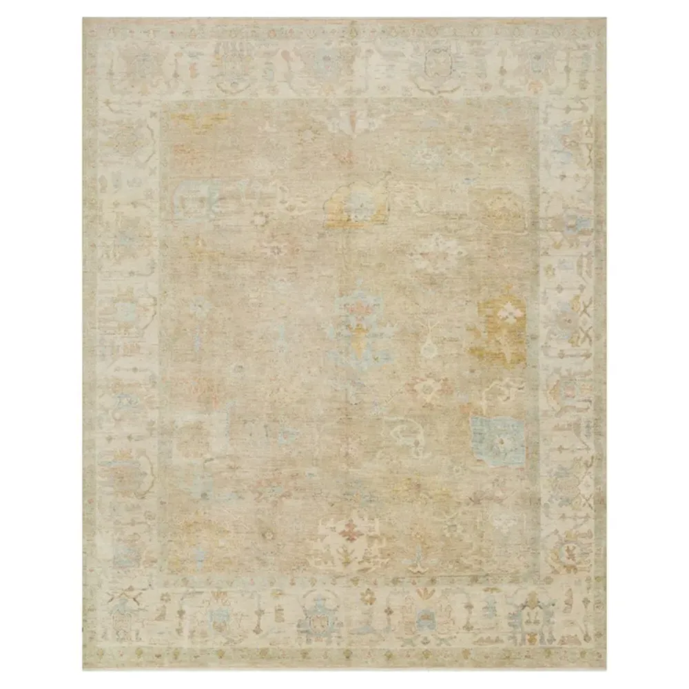 The Forrest rug sample offers authentic antique character with its hand-knotted construction and washed color palette. This beige and ivory piece features accents of moss green, gold, dusty rose and sky blue, while the unique aging process creates an age-worn patina. The 100% wool construction provides durability and texture, and the 0.25-inch pile height adds comfortable underfoot feel. W46 x D46 cm.