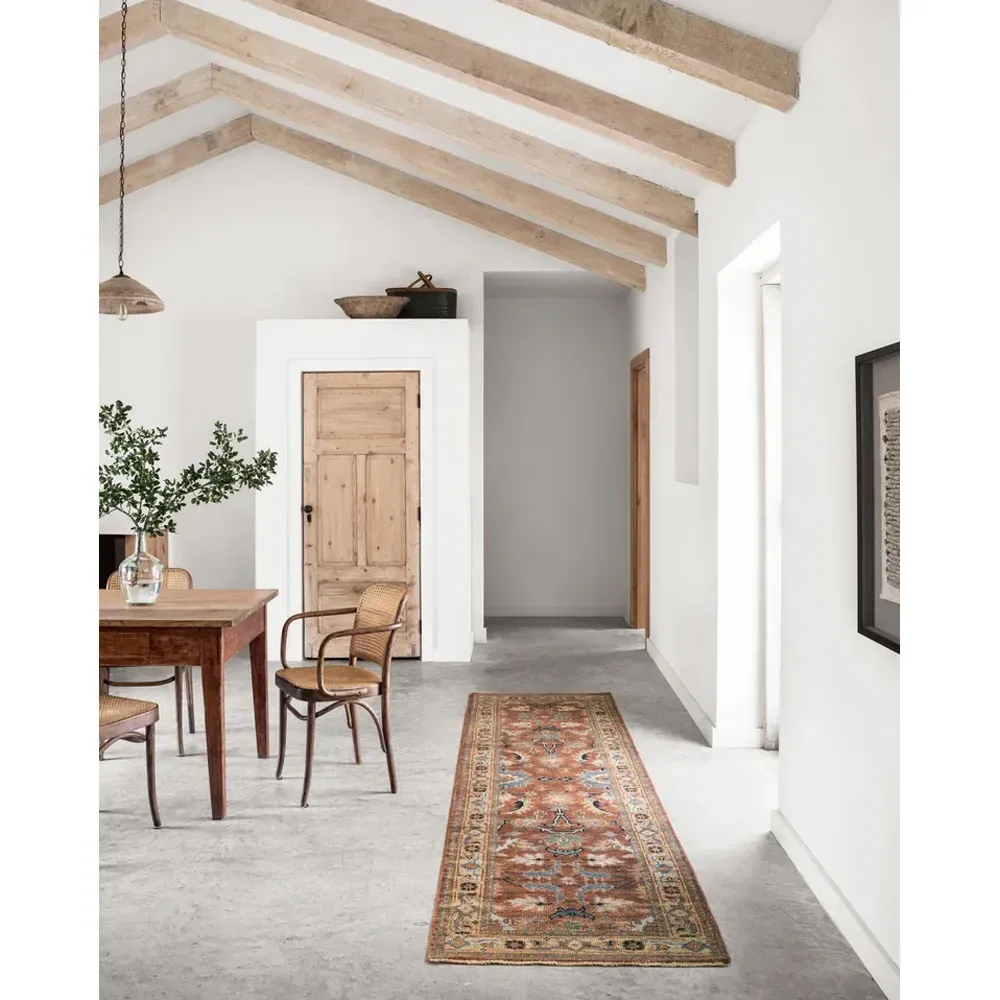 The Ismael rug sample offers authentic hand-knotted craftsmanship with its traditional patterned design in red and beige tones. Constructed from 85% wool and 15% cotton, it provides durability and natural texture. The 0.38-inch pile height delivers comfortable underfoot feel, while the hand-knotted construction ensures lasting quality. Sample dimensions: W46 x D46 cm.