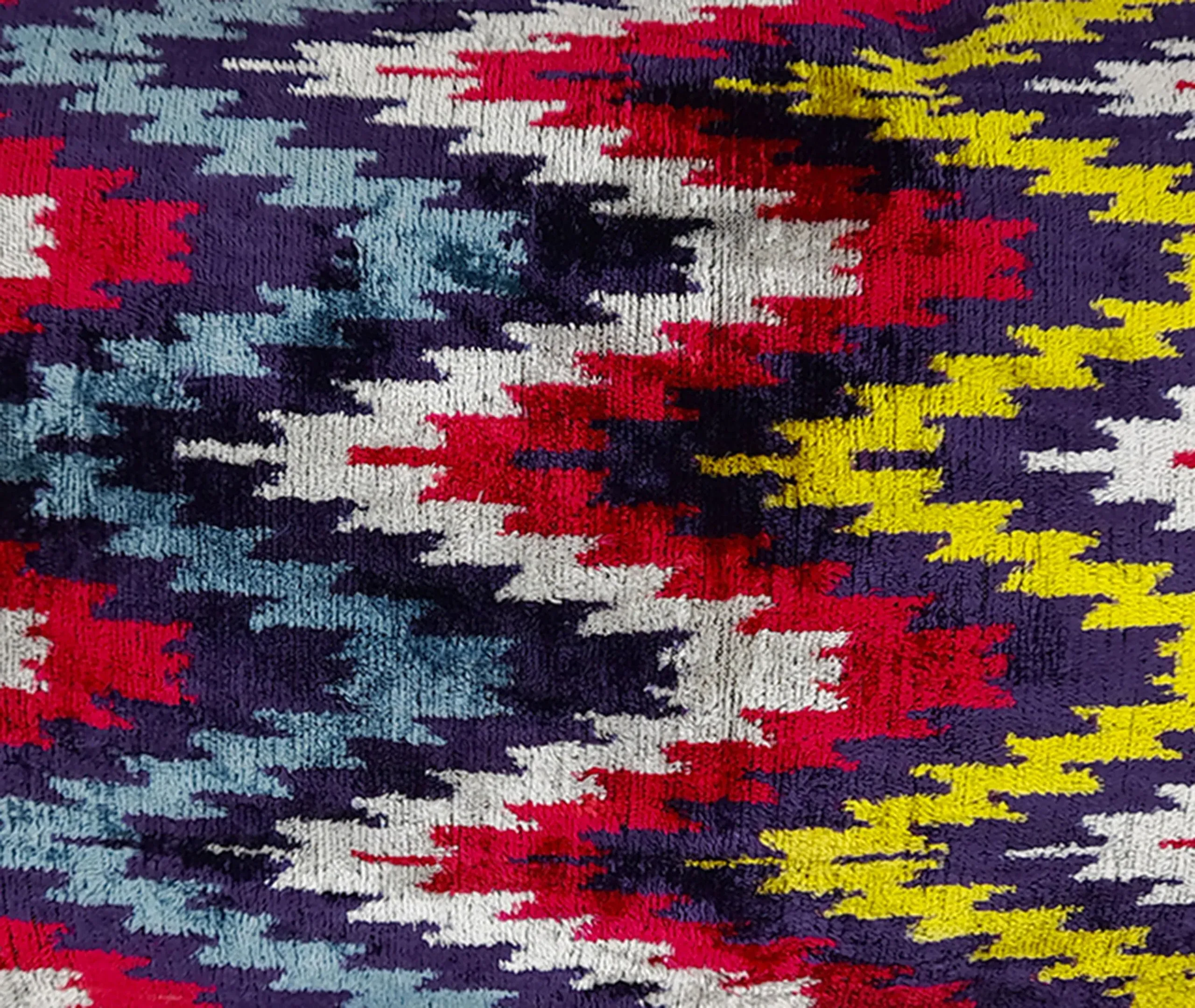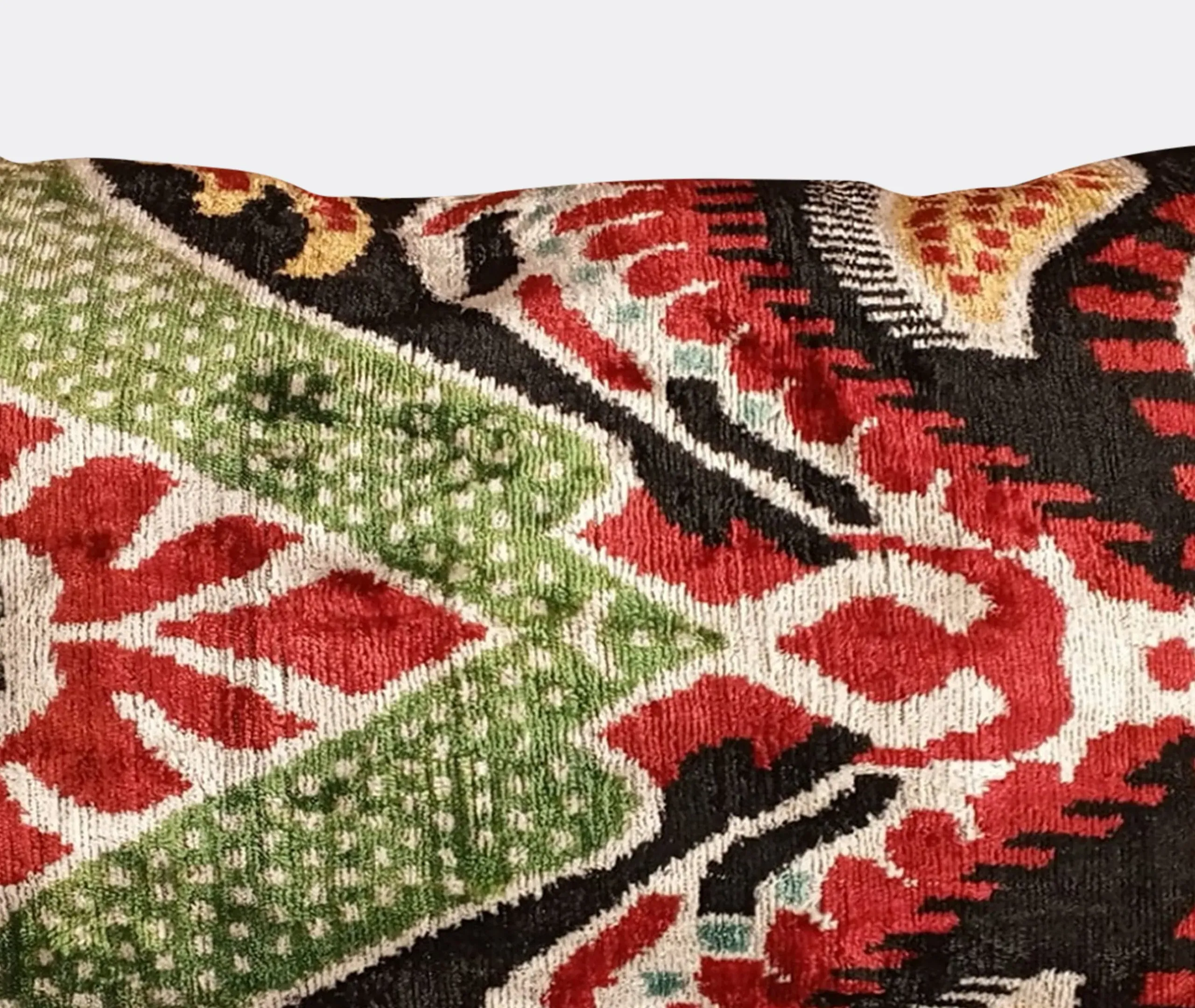 The cushion offers handcrafted quality with its silk velvet construction, featuring vibrant patterns in white and blue shades. Its traditional Italian techniques provide authentic craftsmanship, while the luxurious silk material adds comfort and visual appeal. The versatile design suits mixing and matching with other pieces in the collection.