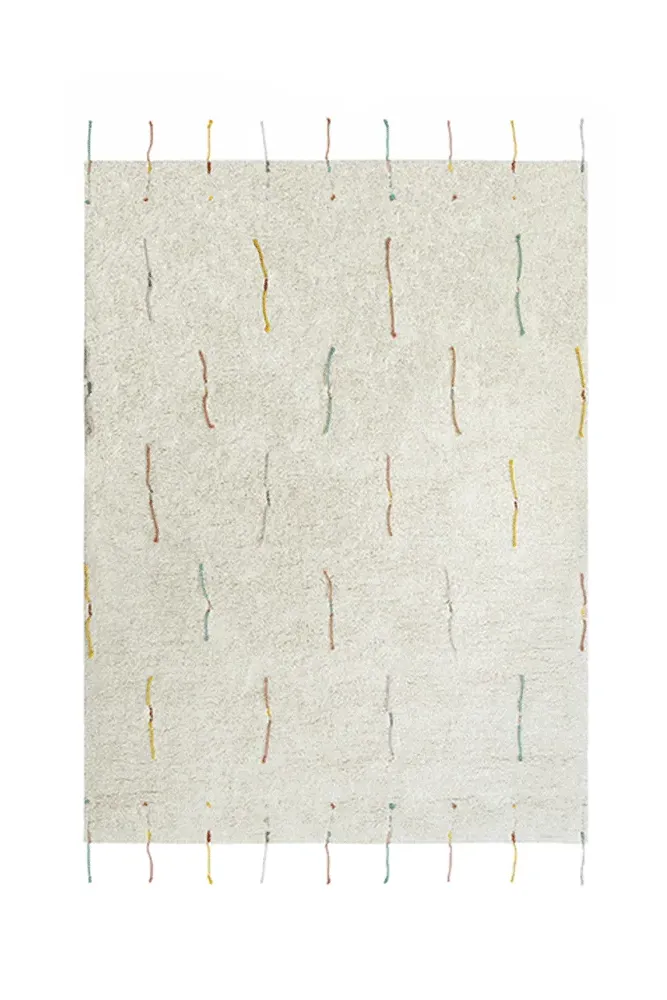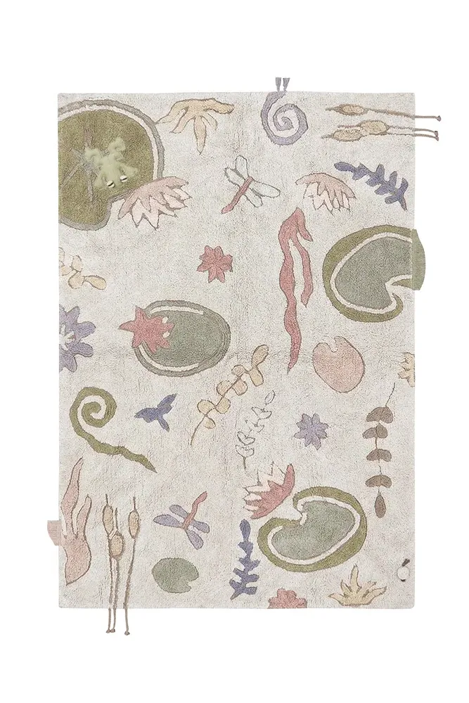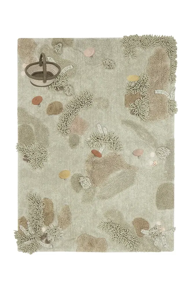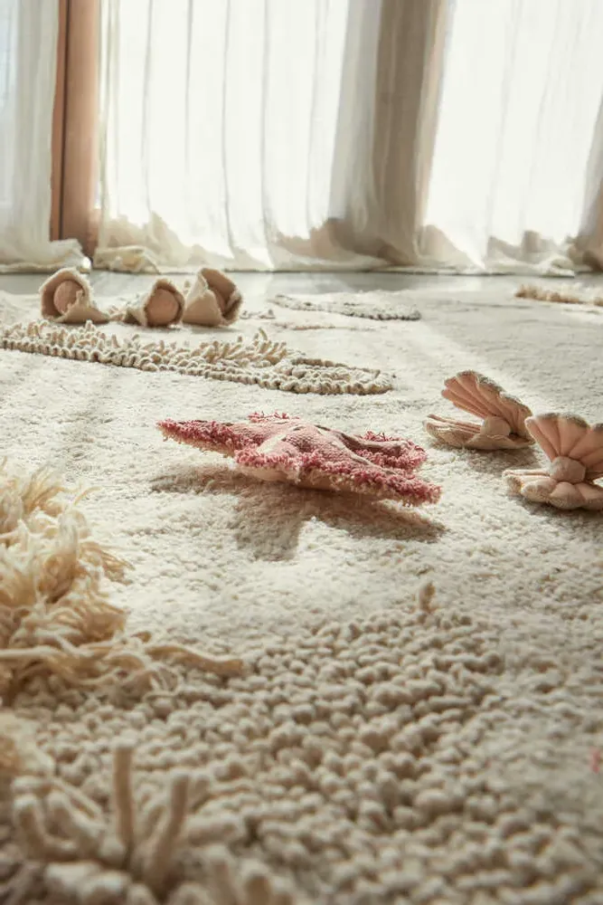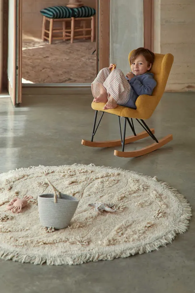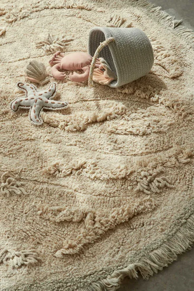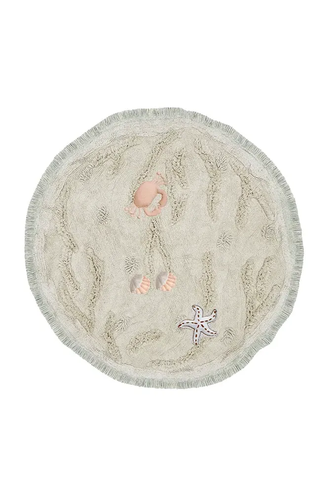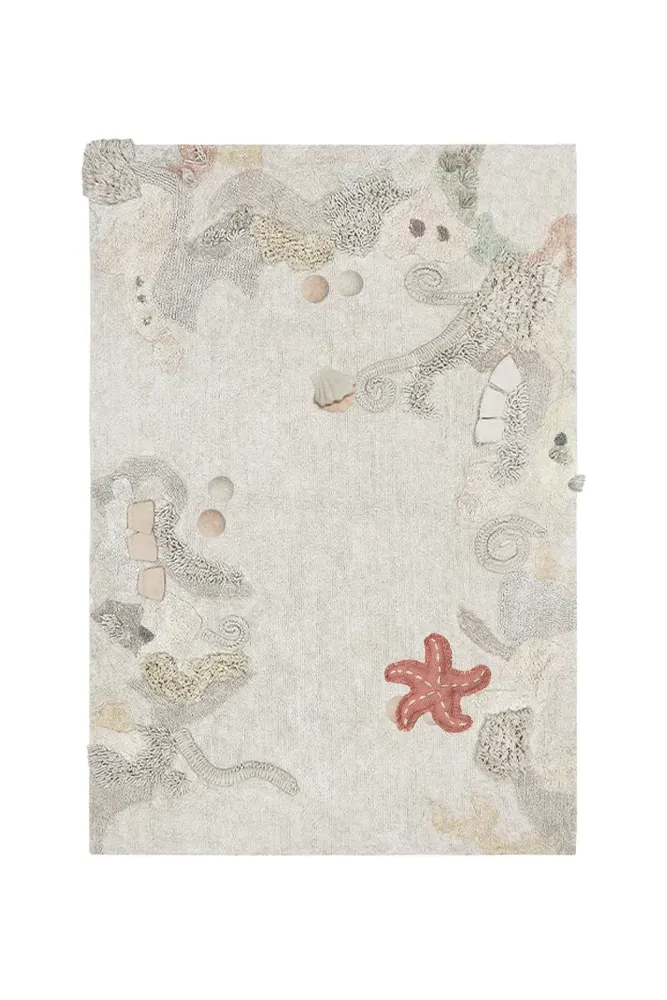 The washable play rug features an ocean-inspired design that imitates the depths of the sea, crafted from eco-friendly cotton materials. Its lightweight construction allows for easy machine washing while maintaining durability through high-quality natural fibers. The rug includes three handcrafted textile accessories - a toy boat, dolphin, and desert island playset for imaginative ocean adventures. The Rugcycled base made from production leftovers adds environmental consciousness to this interactive play surface.