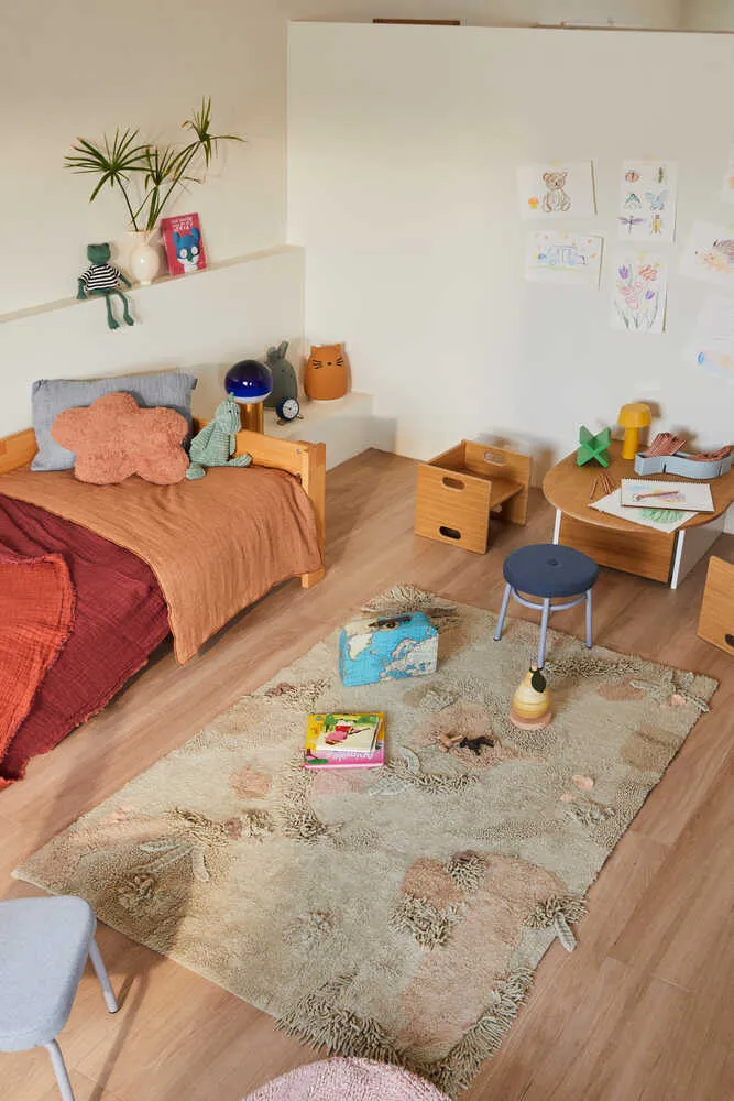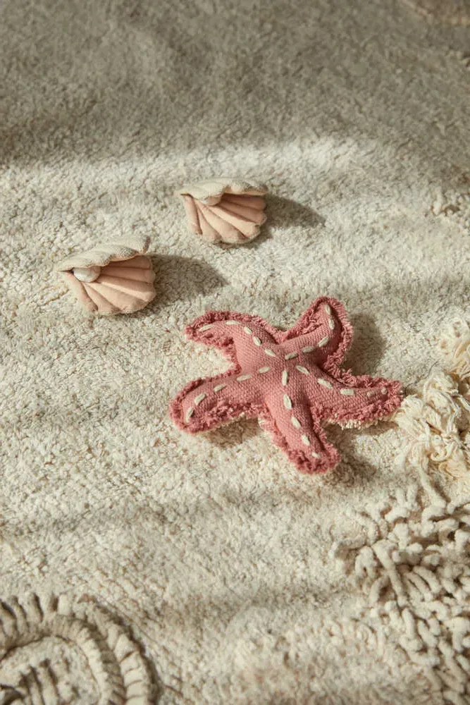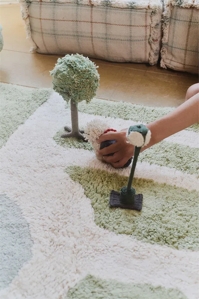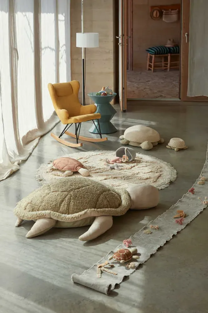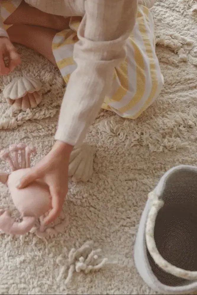 The Play Rug Ocean is the perfect playtime companion for your little ones. Made with eco-friendly materials, this cotton rug features a design that imitates the depths of the ocean. It also comes with three adorable handcrafted textile accessories for your child to play with - a toy boat, a dolphin, and a desert island playset. Your child can let their imagination run wild as they sail the seas, jump over waves with the dolphin, and explore the island. • Lightweight: flexible design that makes the rug easily machine washable without sacrificing quality. • Long Lasting: high-quality natural fibers to ensure maximum durability. It will grow with the families. • Rugcycled base made from leftovers from our own production