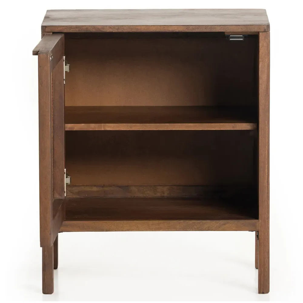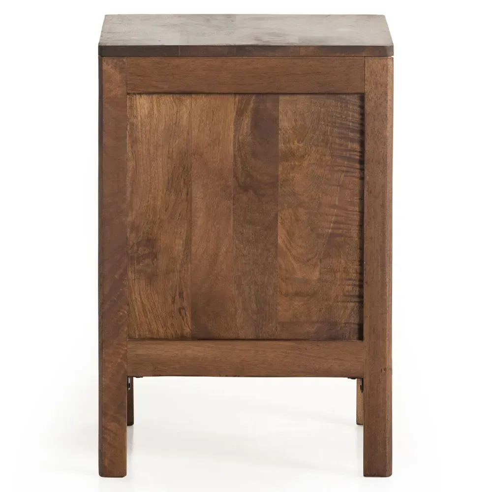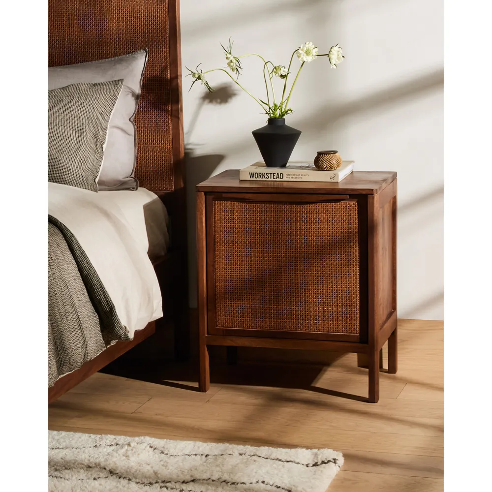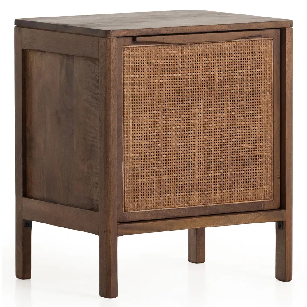 The Rhian nightstand offers bedside storage with its natural mango wood frame and woven cane inlay. Its roomy interior features a removable shelf, providing multiple storage options within arm's reach. The magnetic closure and soft-close hinges add functional convenience, while the solid wood construction ensures lasting durability. W20 x D16 x H23.5 cm.