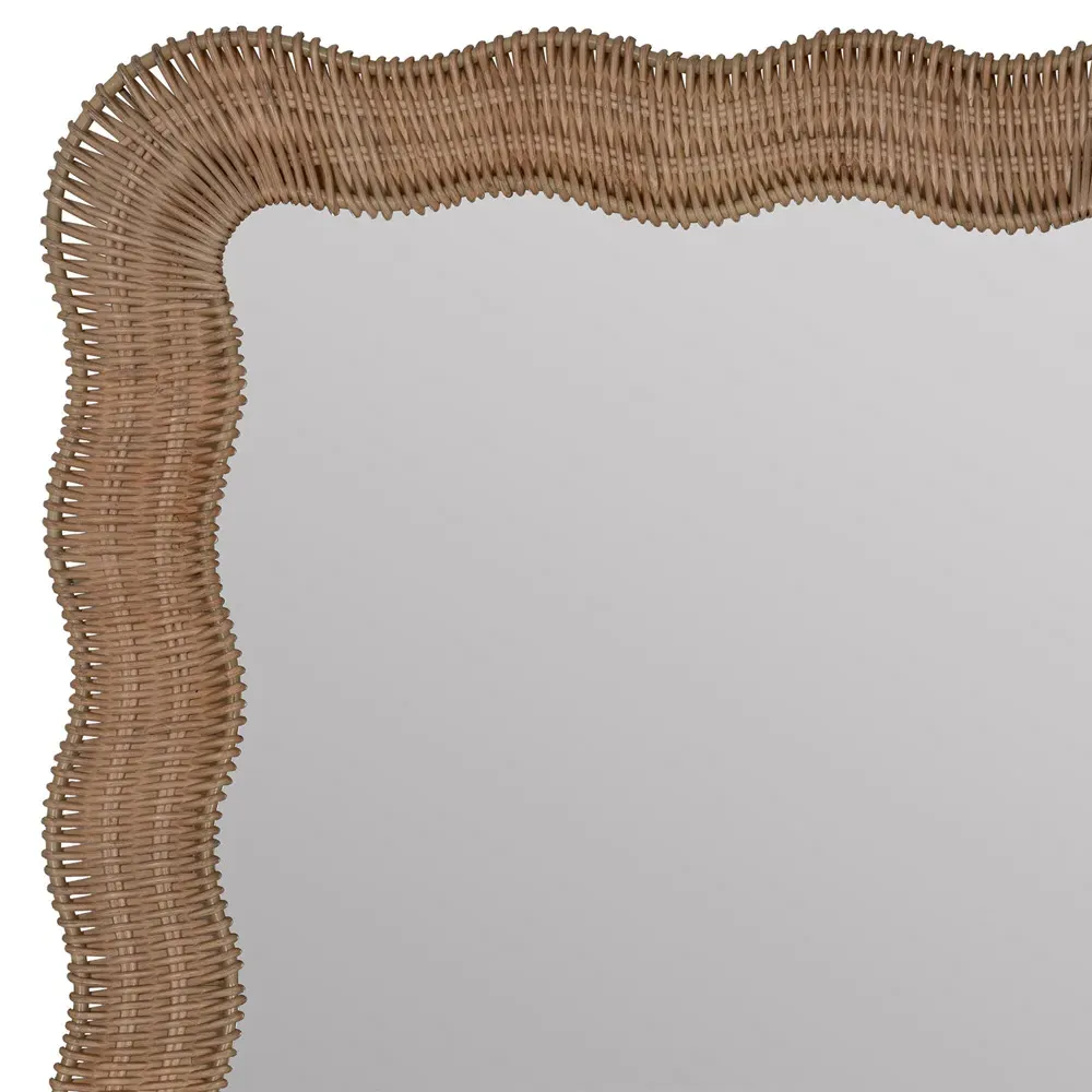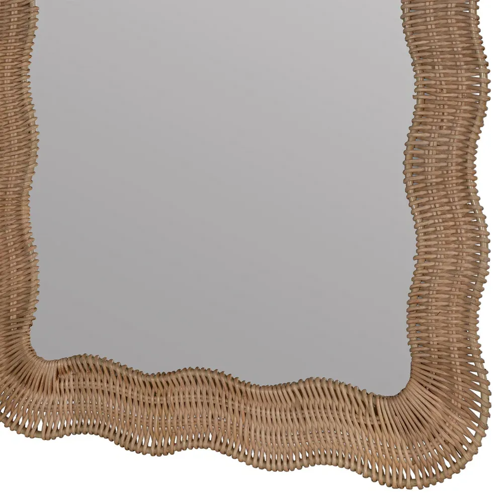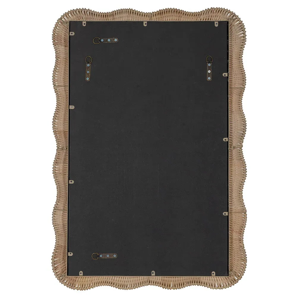 28 inches high x 28 inches wide x 1.5 inches deep. Constructed from rattan and mirrored glass. Finished in natural.