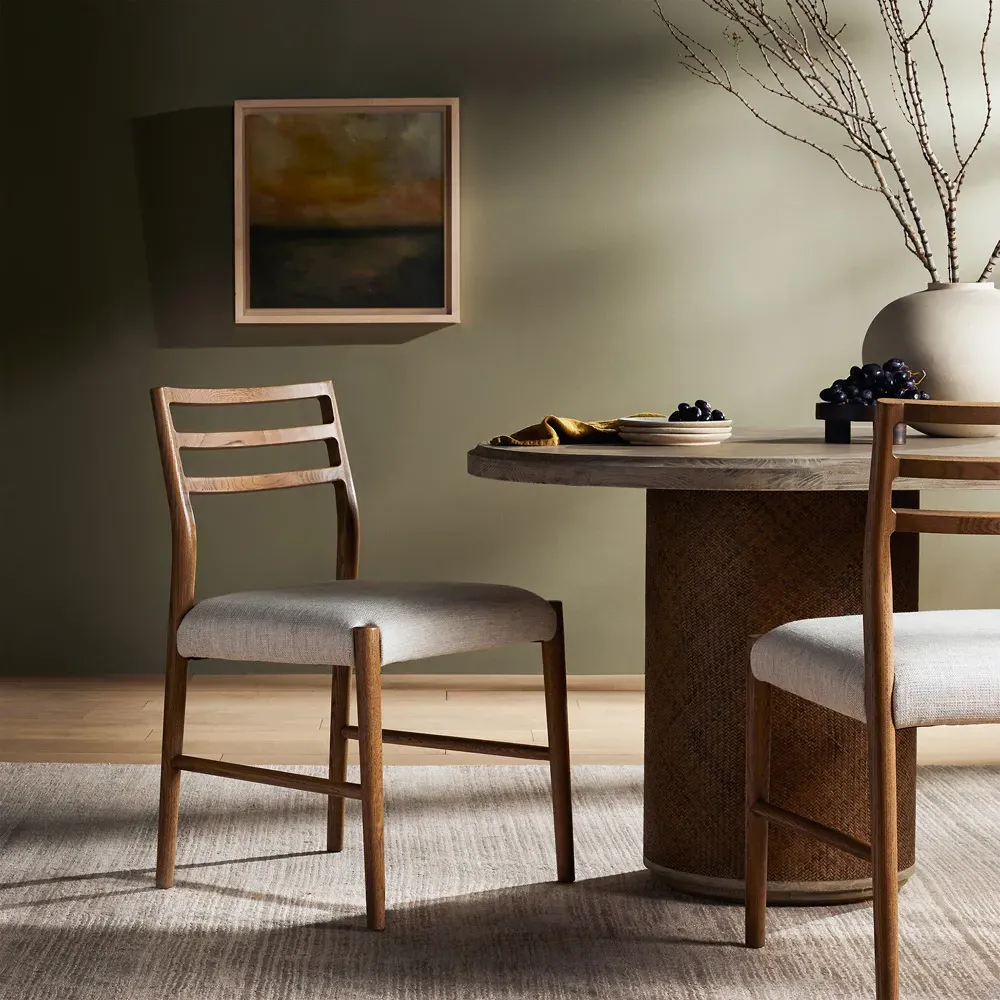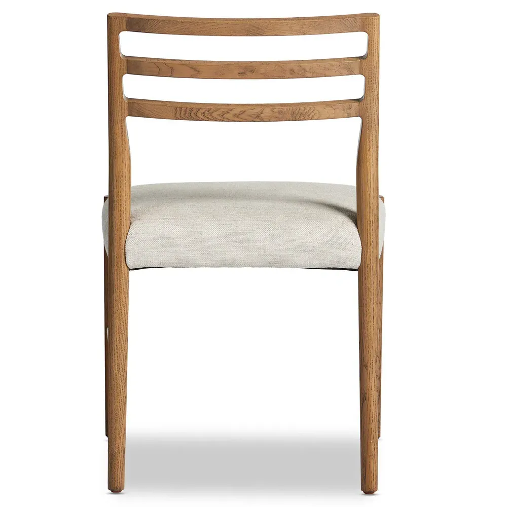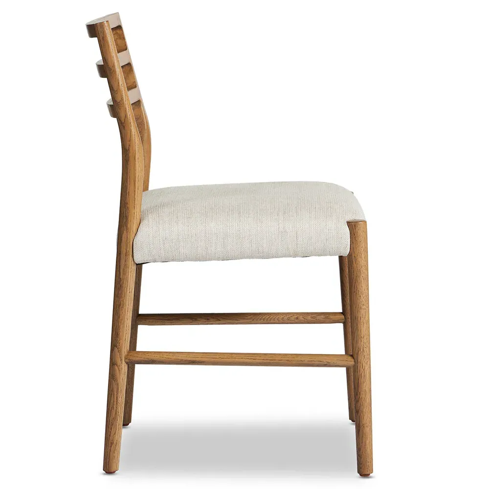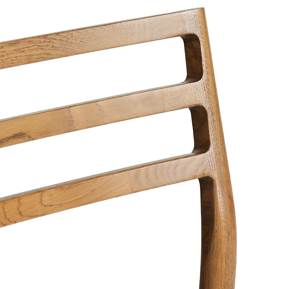The George dining chair combines comfort with its beige upholstered seat, featuring a distinctive ladder back design in black-finished oak. Its fabric blend of viscose, linen, polyester, and cotton provides durability, while the solid oak construction ensures lasting stability. The chair offers reliable seating with a 250-pound weight capacity. W55 x D56 x H86 cm.