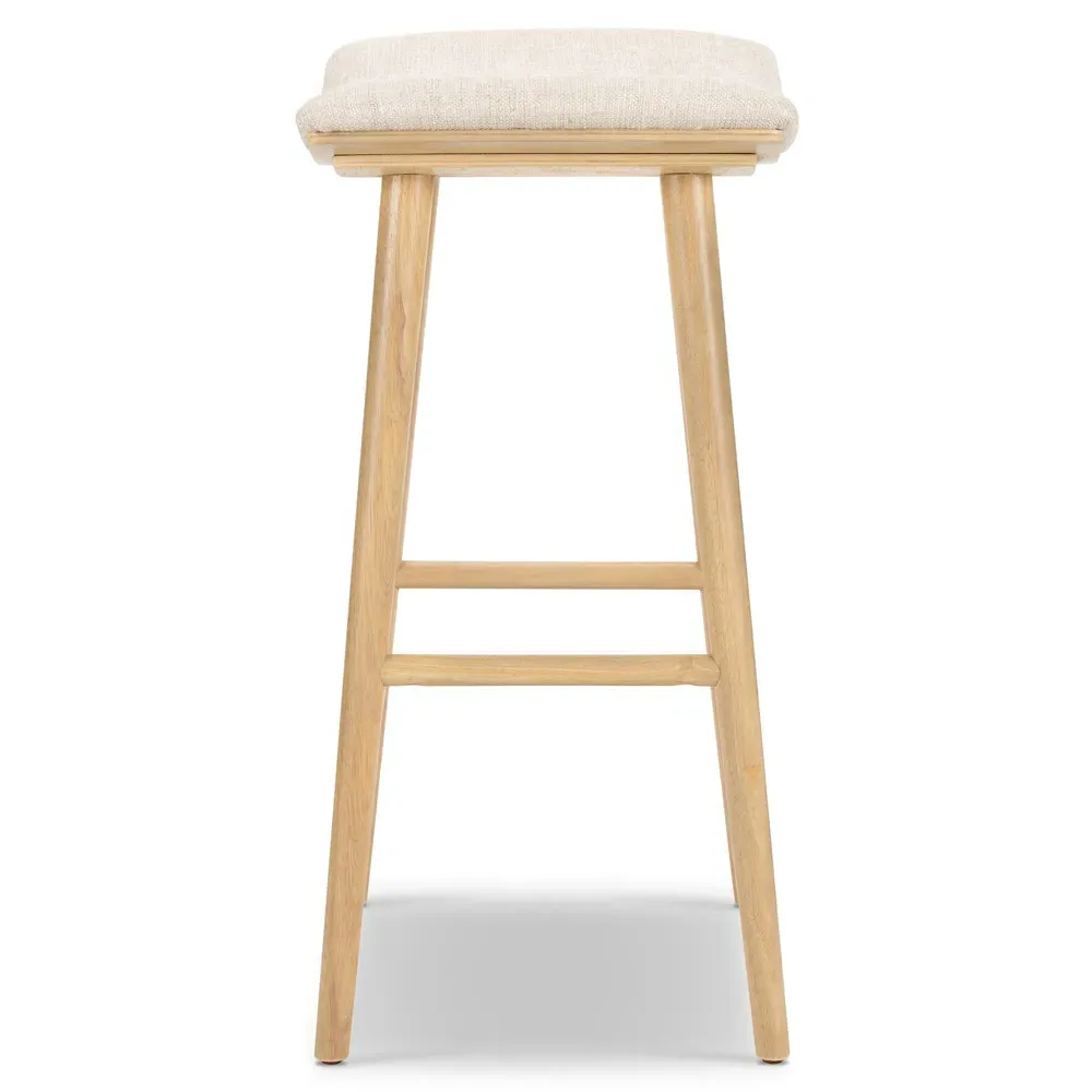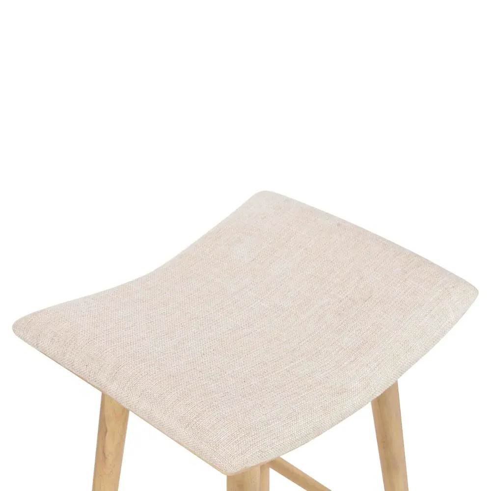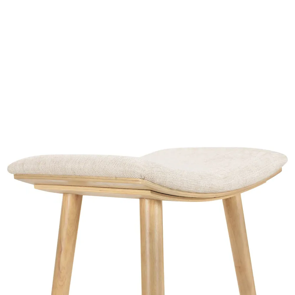 The Shiela counter stool offers streamlined design with its saddle-style seat and natural-toned upholstery. Its solid ash wood construction features a light carbon finish, while the essence natural fabric combines viscose, linen, polyester and cotton. The frame supports up to 250 pounds with 7.76 inches of floor clearance. W18 x D15 x H26 inches.