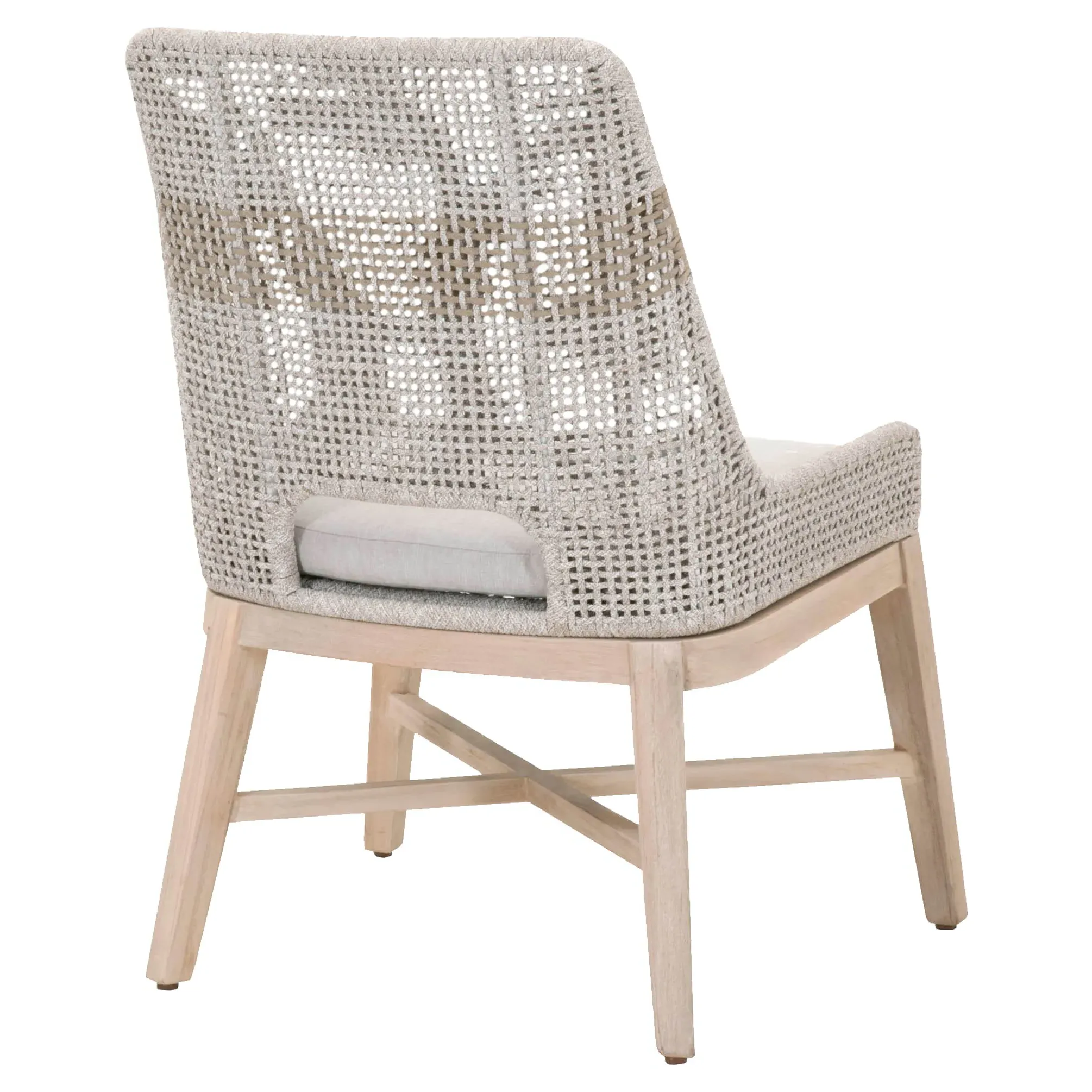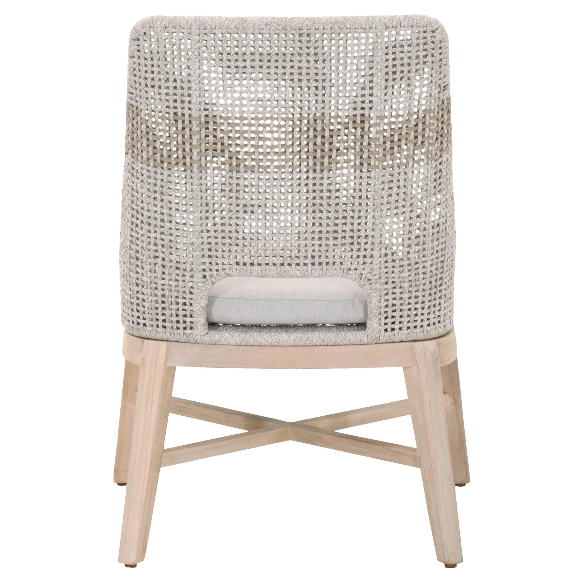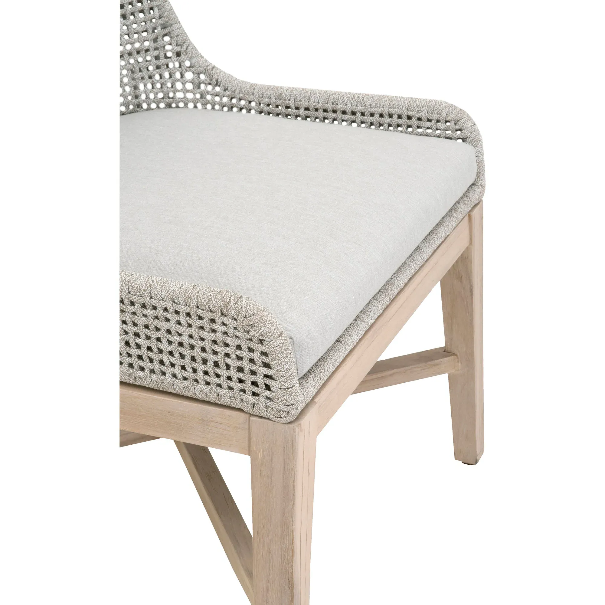 The Theodore bar stool offers outdoor durability with its solid teak frame and X-stretcher base construction. Intricately woven polyolefin rope creates visual appeal in grey and taupe tones, while the foam cushion provides comfortable seating. The all-weather fabric upholstery resists outdoor elements, and the removable seat cushion allows for easy maintenance. W21 x D21.5 x H39 cm.