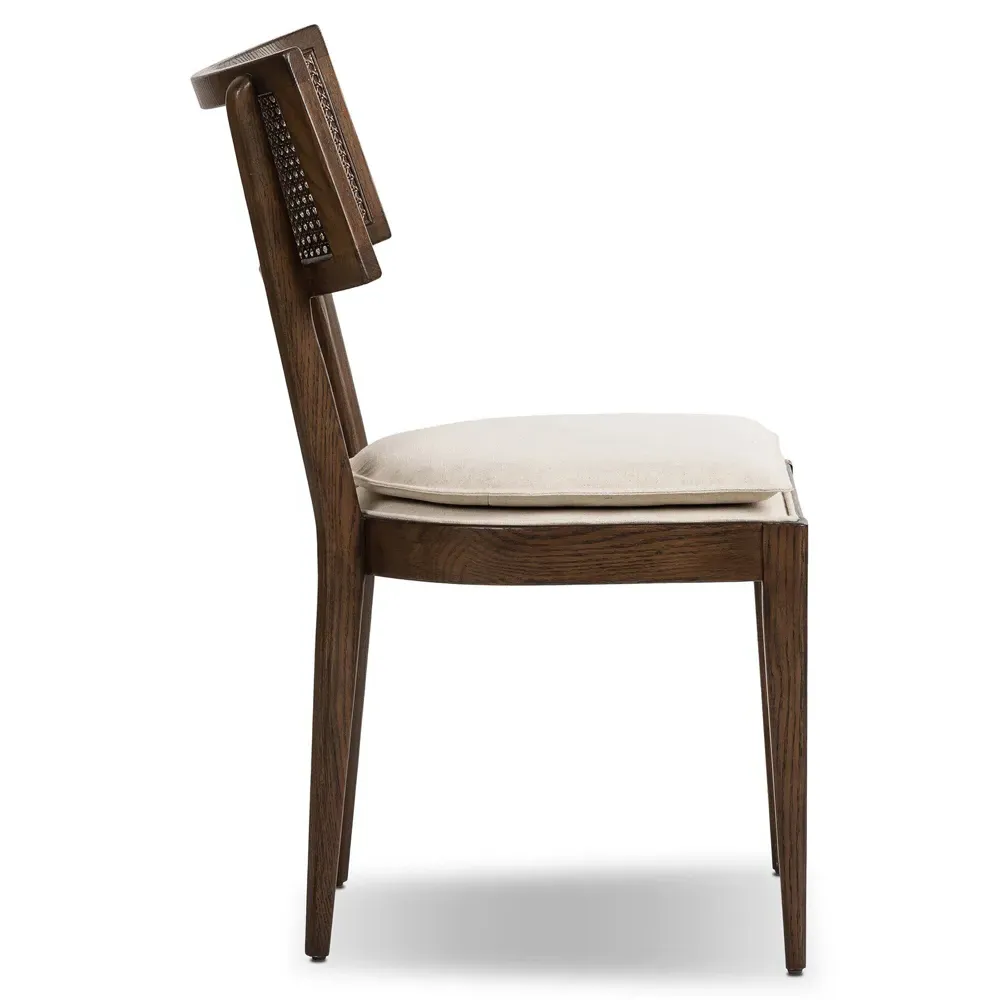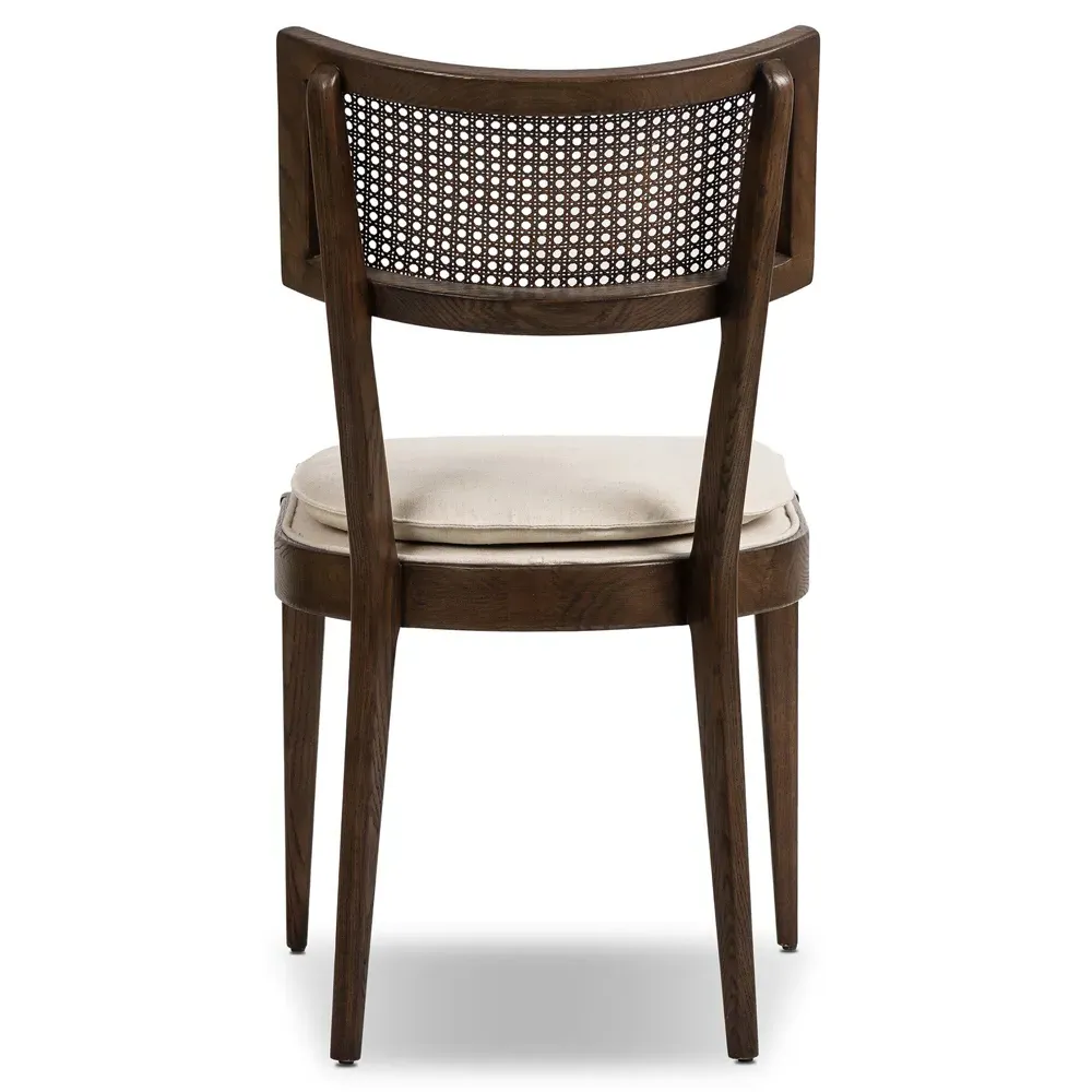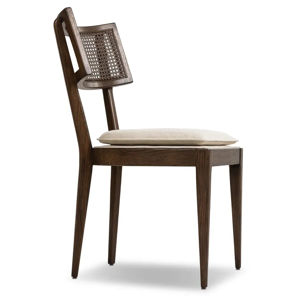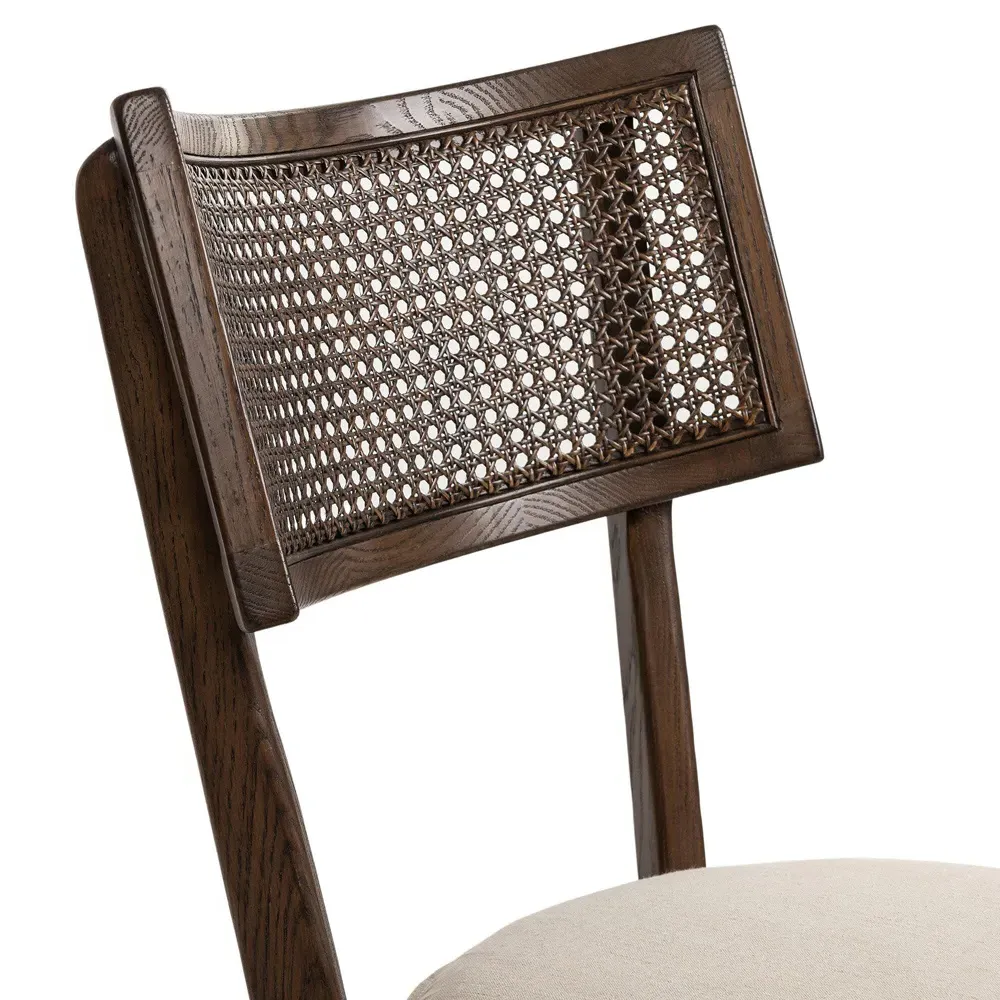 Our Tina brown dining chair fits seamlessly into your dining area. Supported by a toasted solid nettlewood frame and intricate natural cane inlay, the overall design of this brown cane chair is natural and refined. The seat cushion is fastened by Velcro and covered with a beige linen-blend performance fabric, which repels liquids and odors and is easy to clean. 36.5 inches high x 19.75 inches wide x 24.75 inches deep. Seat: 20.28 inches high x 19.09 inches deep; Distance between legs (front to back): 17.64 inches; Distance between legs (side to side): 17.52 inches; Clearance from floor: 15.55 inches; Seat front: 19.88 inches wide; Seat back: 9.45 inches high x 10.04 inches wide; Seat cushion: 1.97 inches high x 19.29 inches wide x 18.5 inches deep. Constructed from solid nettlewood, woven cane and fabric. Finished in brown, natural and beige. Upholstered in beige performance fabric; Fabric content: 92% polyester and 8% linen; Filling in body: 100% polyester fiber; Filling in seat: 93% polyurethane foam pad and 7% polyester fiber batting.
