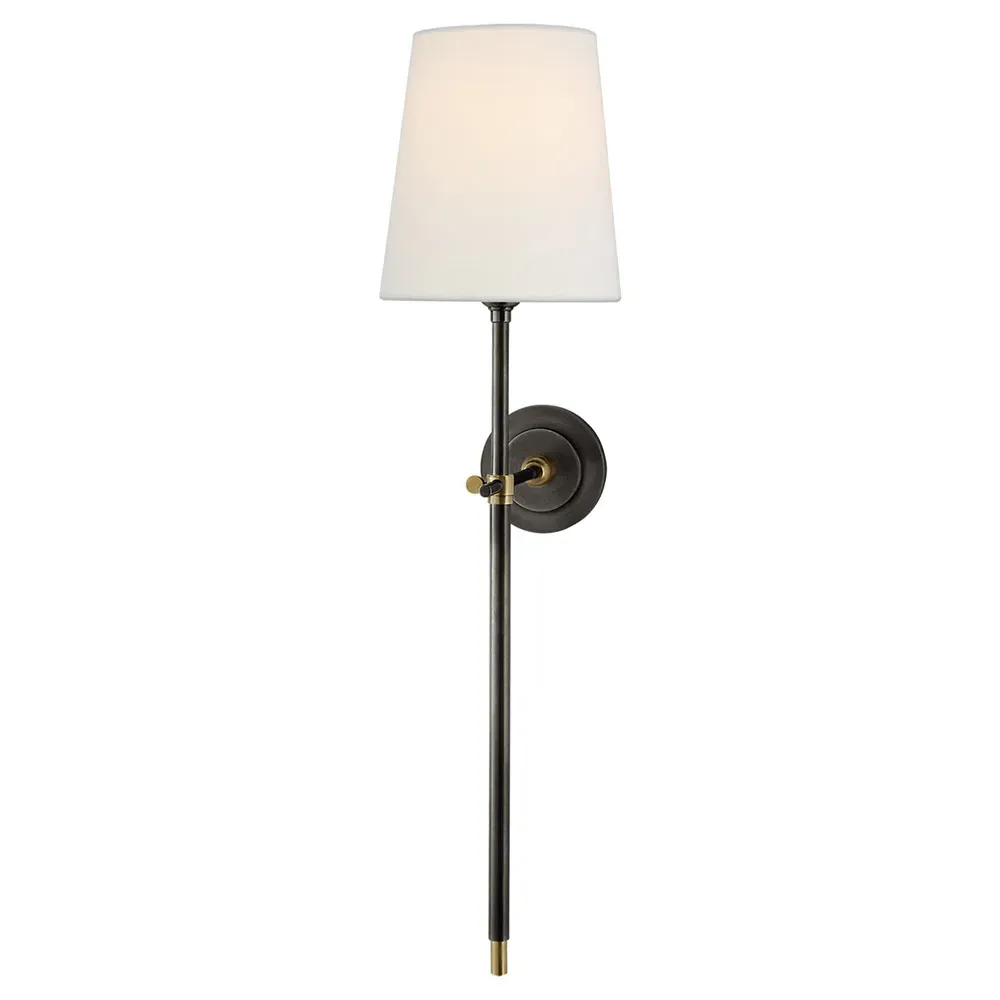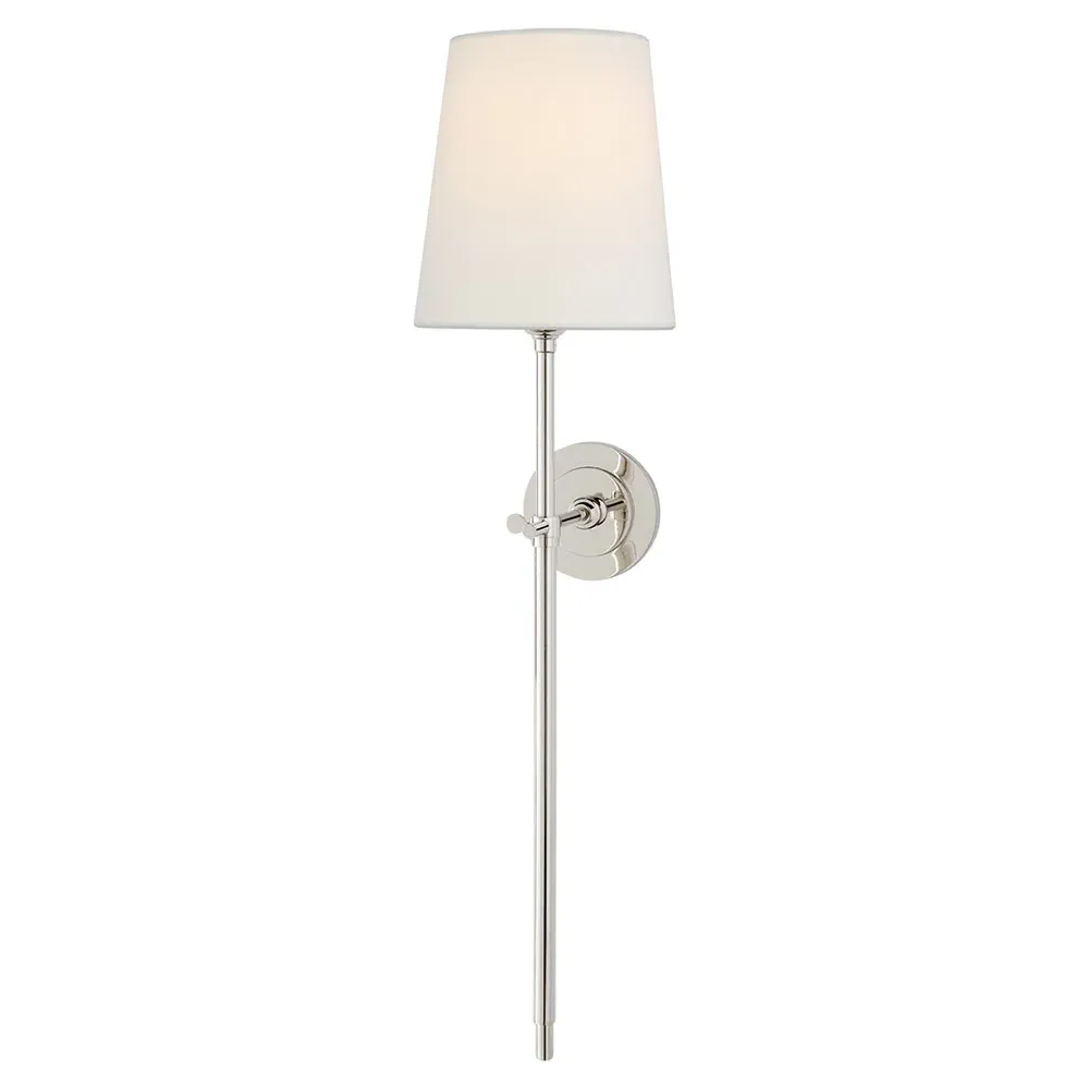 With its classic, clean-lined silhouette, the small Bryant sconce exudes modern elegance. An antique nickel finish pairs gracefully with a simplistic white linen shade. This versatile light fixture effortlessly complements nearly any interior design style, from contemporary to traditional to farmhouse. Visual Comfort Signature Collection. Overall Size: 14.25" high x 5.5" wide x 8.75" deep. Backplate: 4" Round. Finished In Antique Nickel. Material: Metal and Steel.