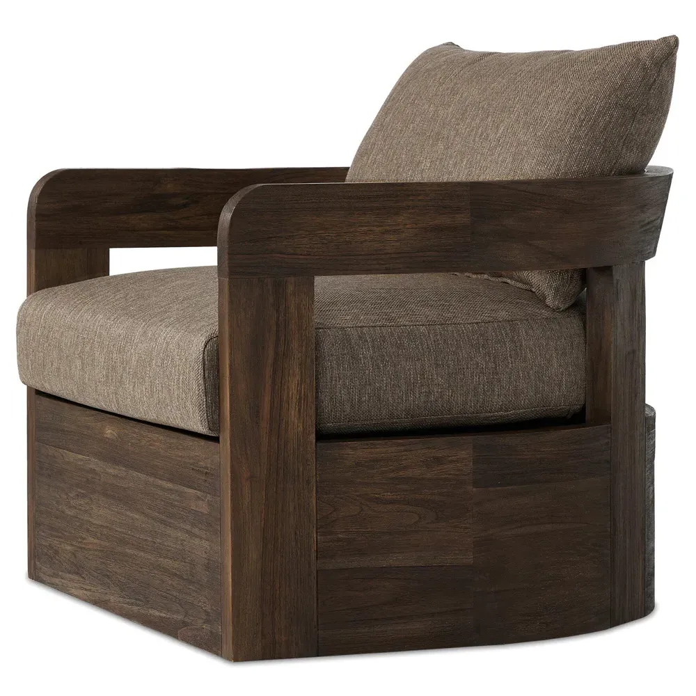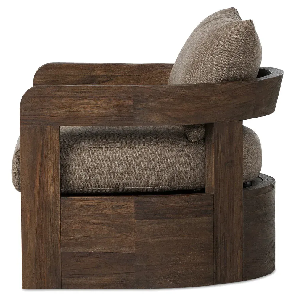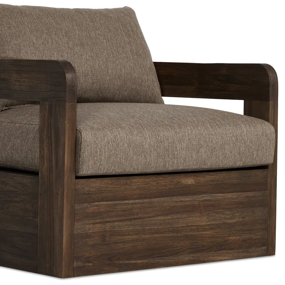 30.25 inches high x 23.5 inches wide x 24.5 inches deep. Seat: 19.57 inches high x 21.26 inches wide x 17.72 inches deep; Seat Back: 7.09 inches high; Seat Cushion: 3.25 inches thick x 21.26 inches wide x 22.56 inches deep; Back Cushion: 12.99 inches high x 19.02 inches wide x 4.92 inches deep; Clearance from Floor: 14.35 inches high; Arm: 26.65 inches high x 1.18 inches wide x 24.13 inches deep; Arm from Seat: 7.09 inches high; Distance between Legs (Front to Back): 12.80 inches; Distance between Legs (Side to Side): 21.26 inches; Weight capacity: 250 pounds. Constructed from solid FSC® certified teak. Finished in stained saddle brown. Upholstered in beige performance fabric. Fabric content: 100% olefin; Fabric rub count: 16,000; Filling in back cushion: 90% polyester fiber, 10% polyester fiber batting.