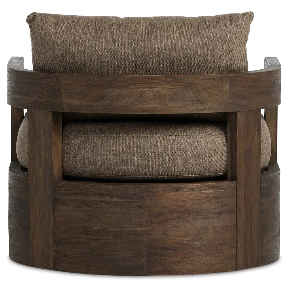 The Aviel Dining Arm Chair offers outdoor durability with comfort through its solid FSC certified teak construction and beige performance fabric upholstery. Its compact design features curved arms and supportive cushioning, while the stained saddle brown teak finish adds natural warmth. The high-performance olefin fabric withstands outdoor conditions with a 16,000 rub count rating, and the foam-filled cushions provide reliable support with a 250-pound weight capacity. W60 x D62 x H77 cm.