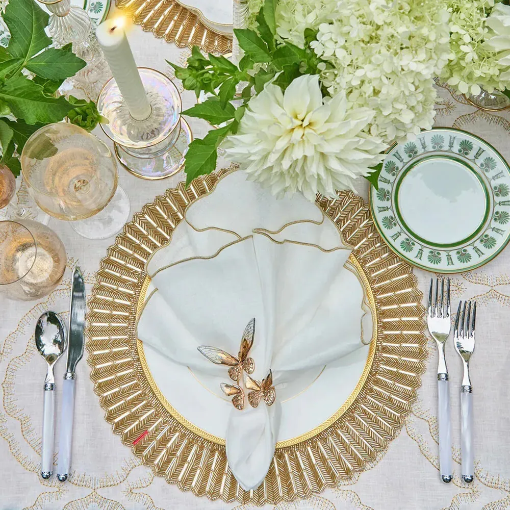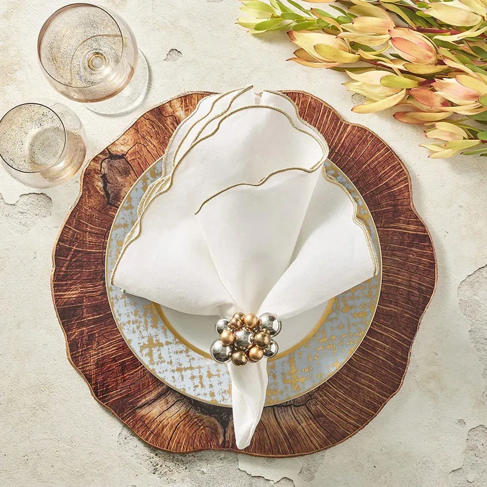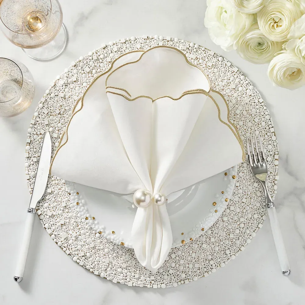 The Divot napkin set offers refined dining with its silver edge detailing that adds subtle elegance to each piece. Constructed from 100% linen, these napkins provide natural texture and durability for everyday use. The crisp white finish complements any table setting, while the quality construction ensures long-lasting performance. W21 x D21 x H0.1 cm per napkin.