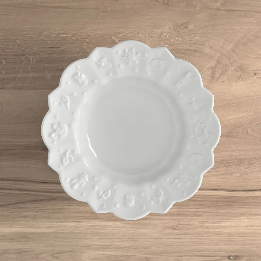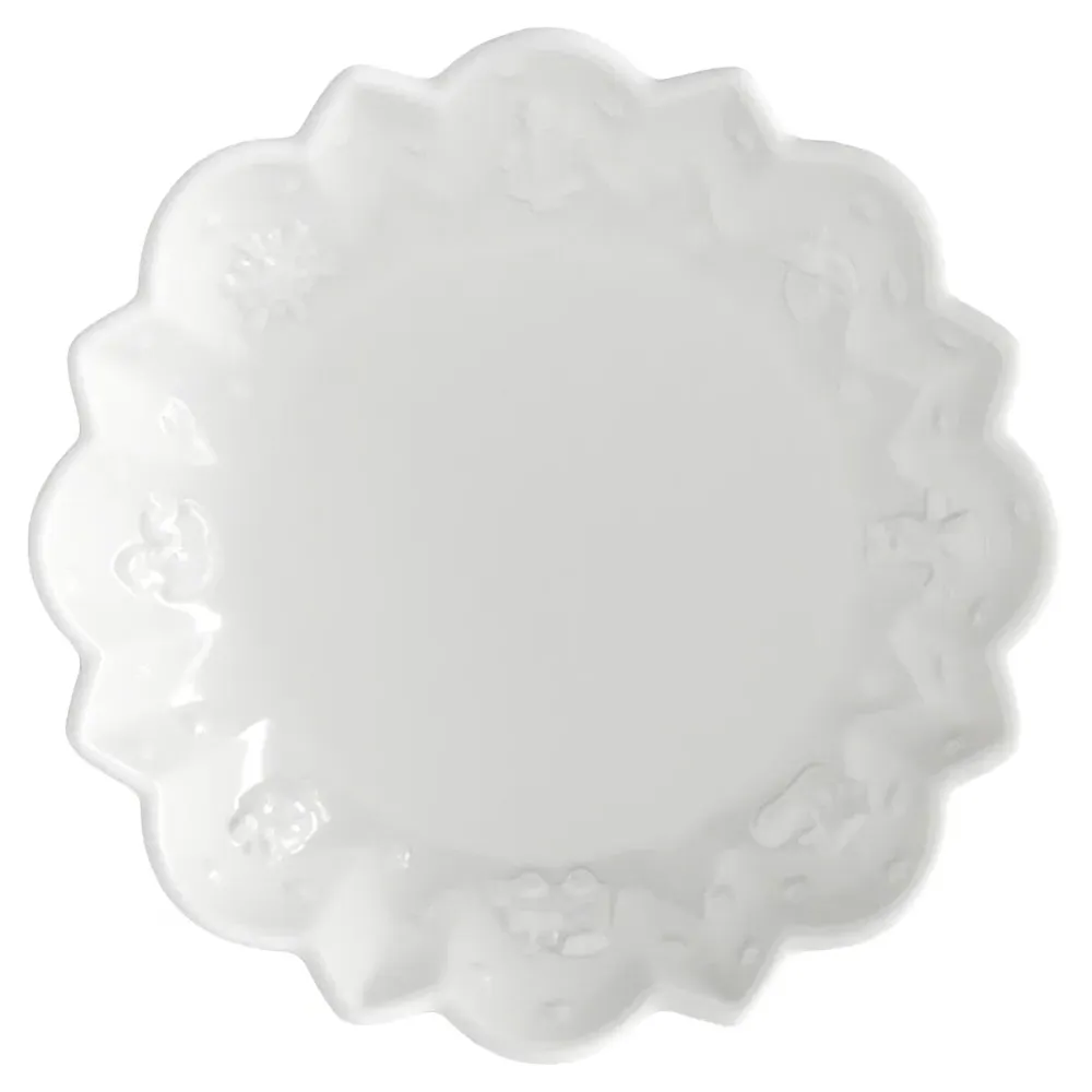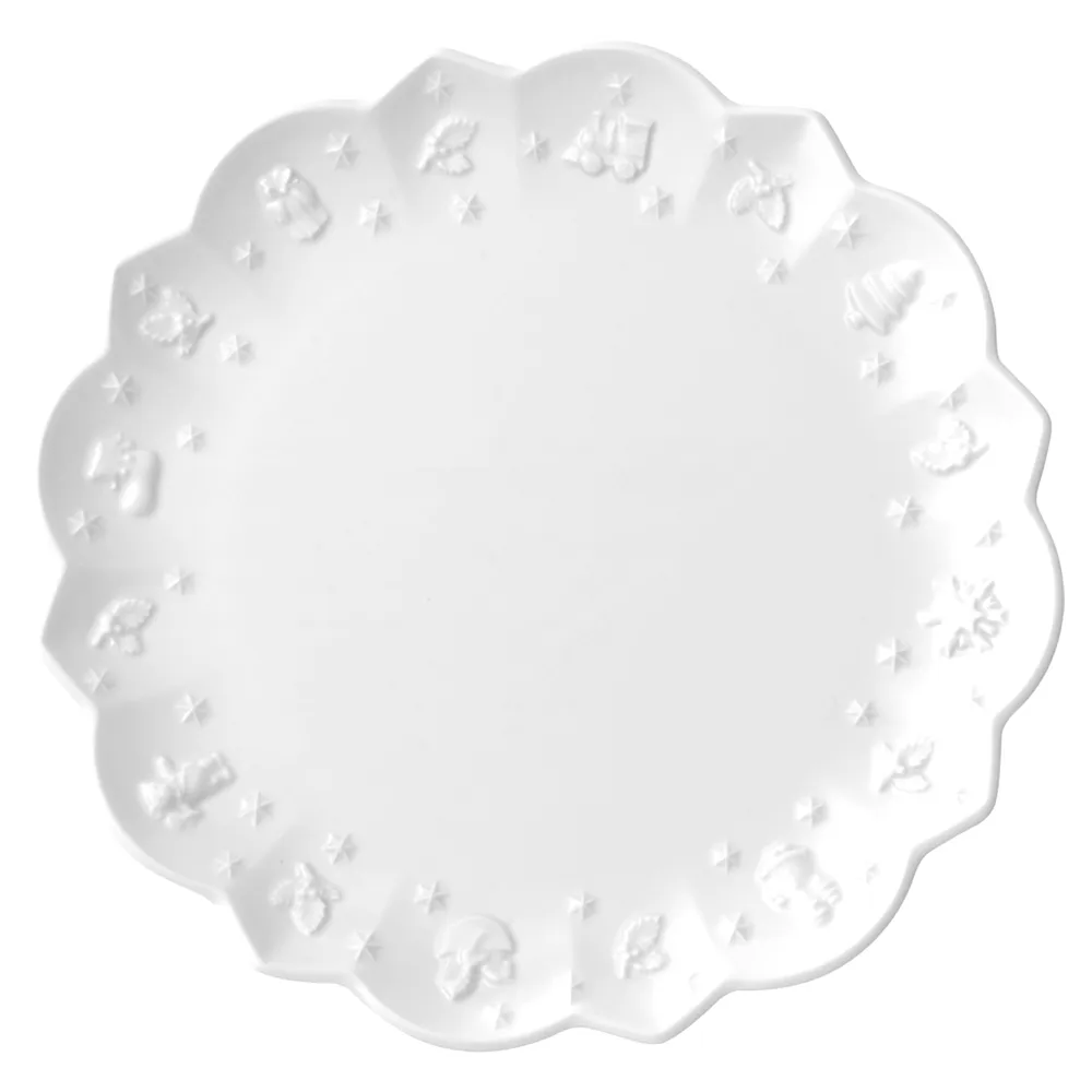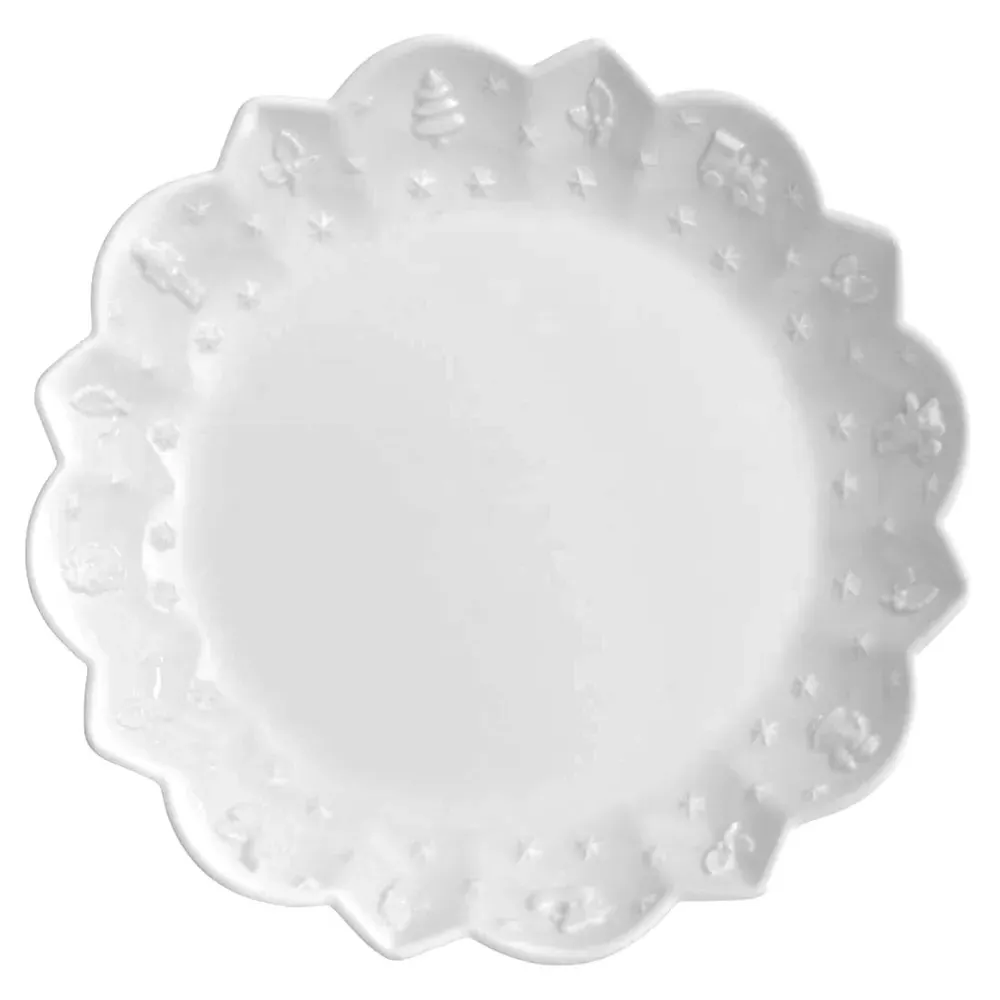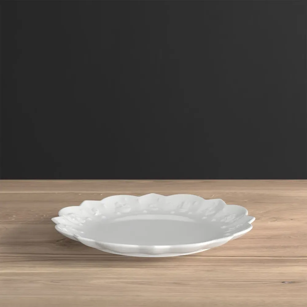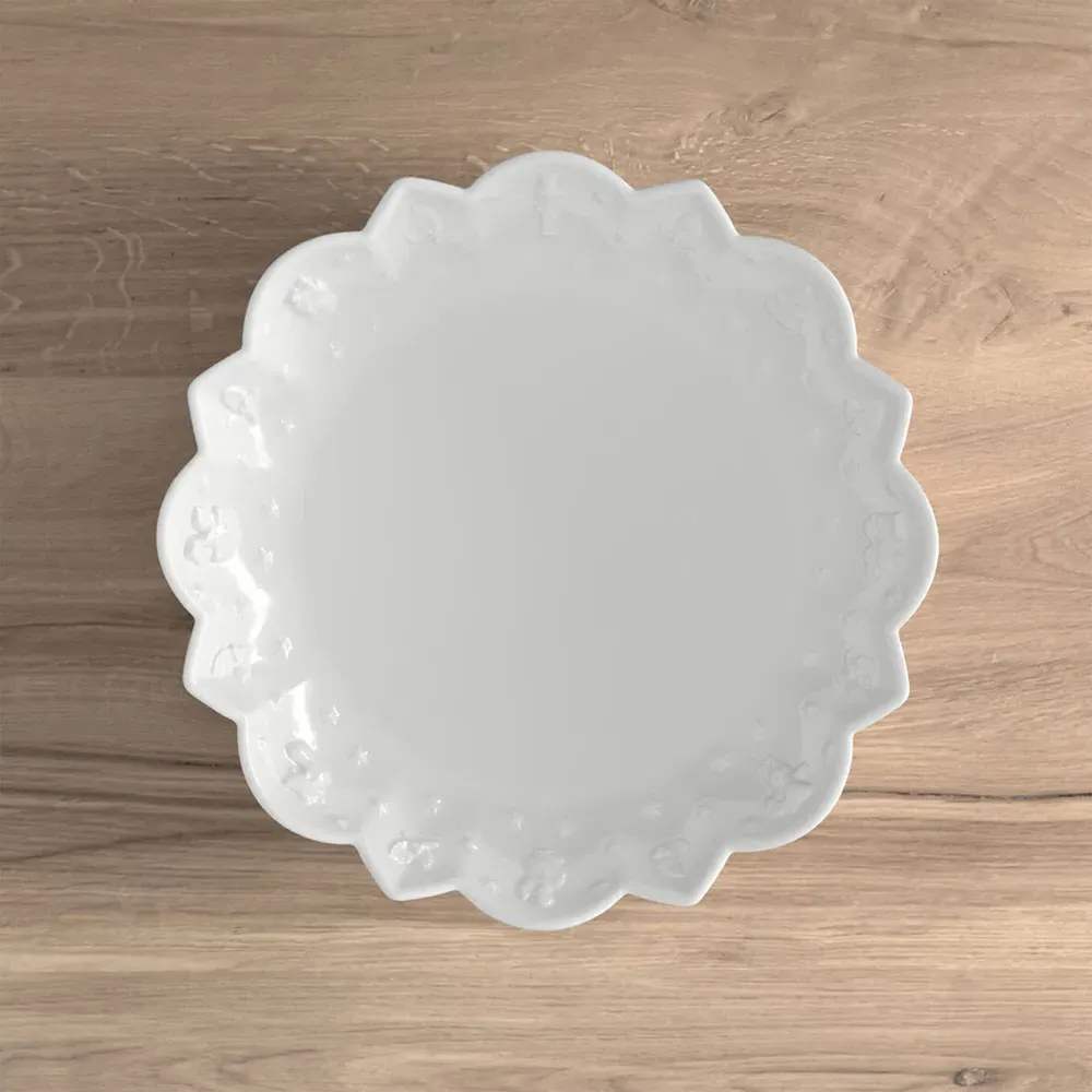 0.75 inches high x 7.25 inches wide x 7.25 inches deep. Constructed from premium porcelain. Finished in white. Toy's Delight Royal Classic is inspired by the shape of nostalgic paper plates, decorated with a high-quality porcelain relief.