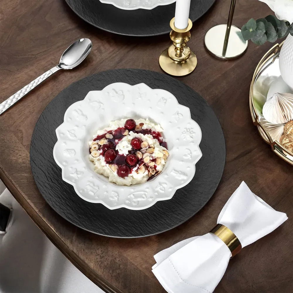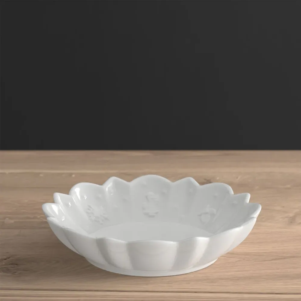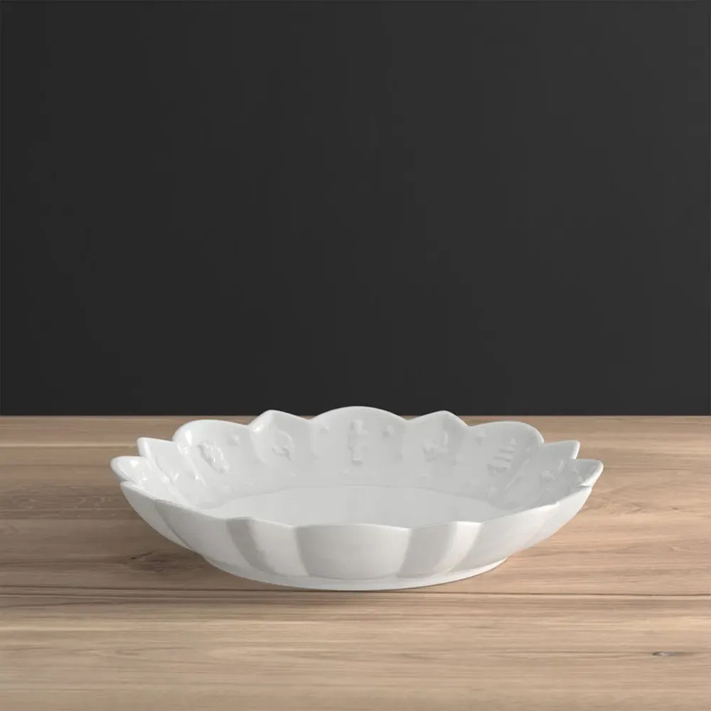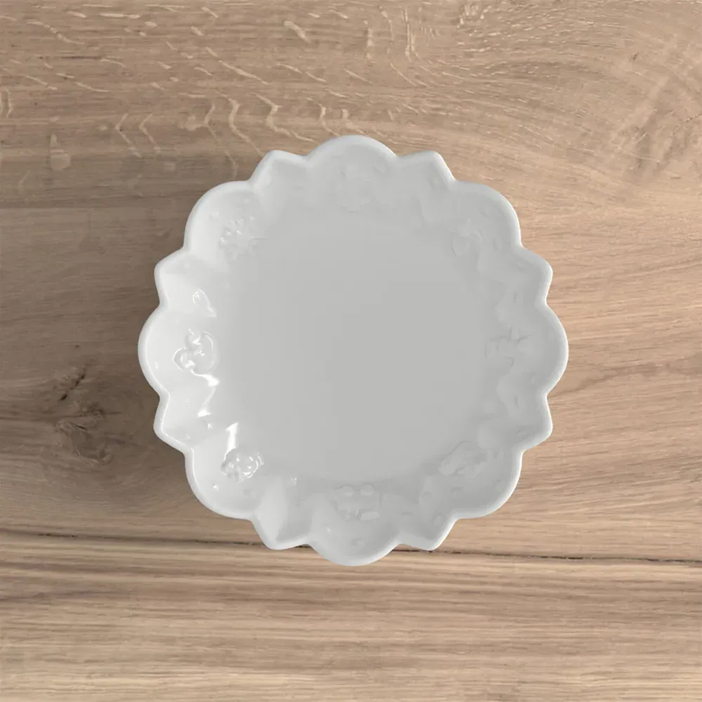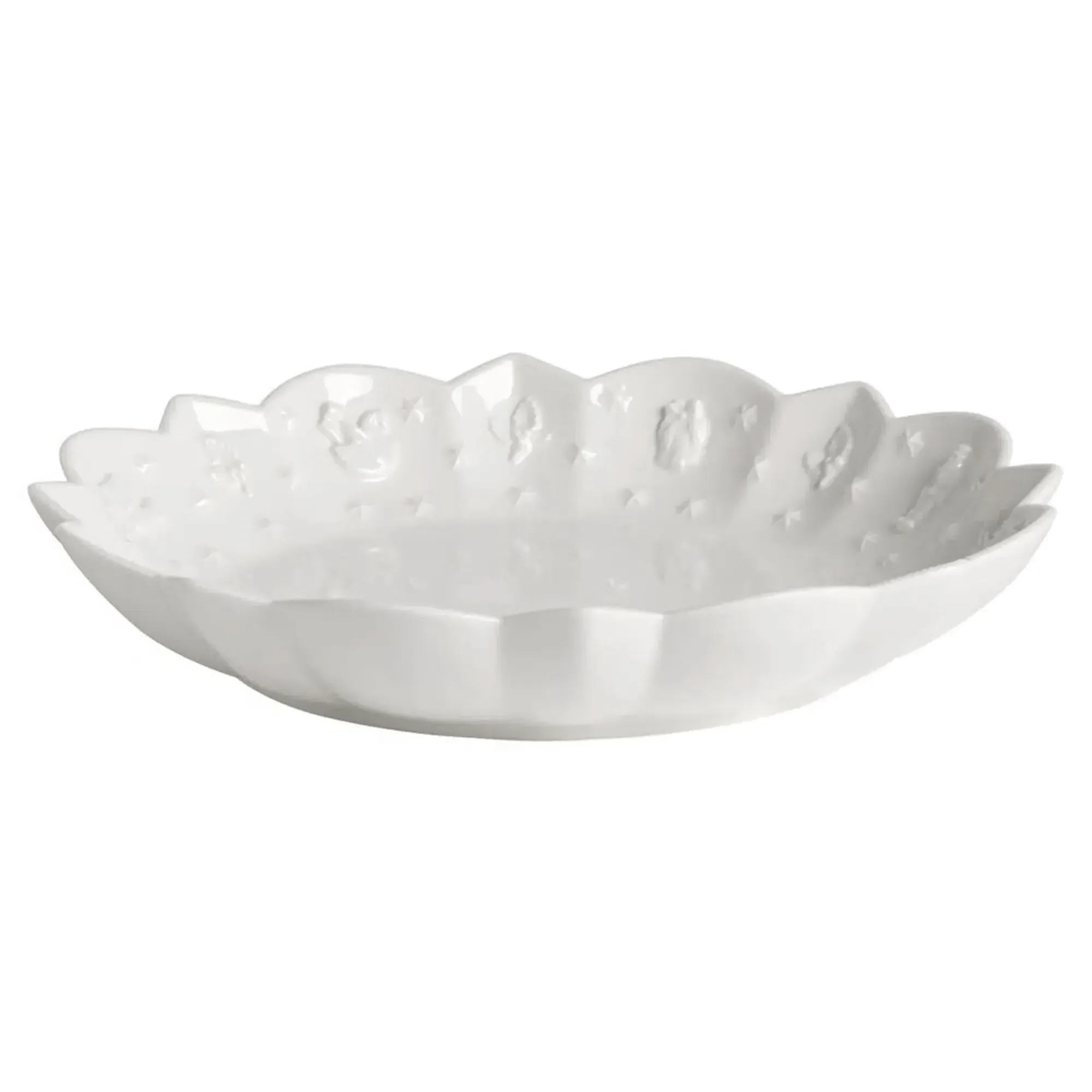 0.75 inches high x 7.25 inches wide x 7.25 inches deep. Constructed from premium porcelain. Finished in white. Toy's Delight Royal Classic is inspired by the shape of nostalgic paper plates, decorated with a high-quality porcelain relief.