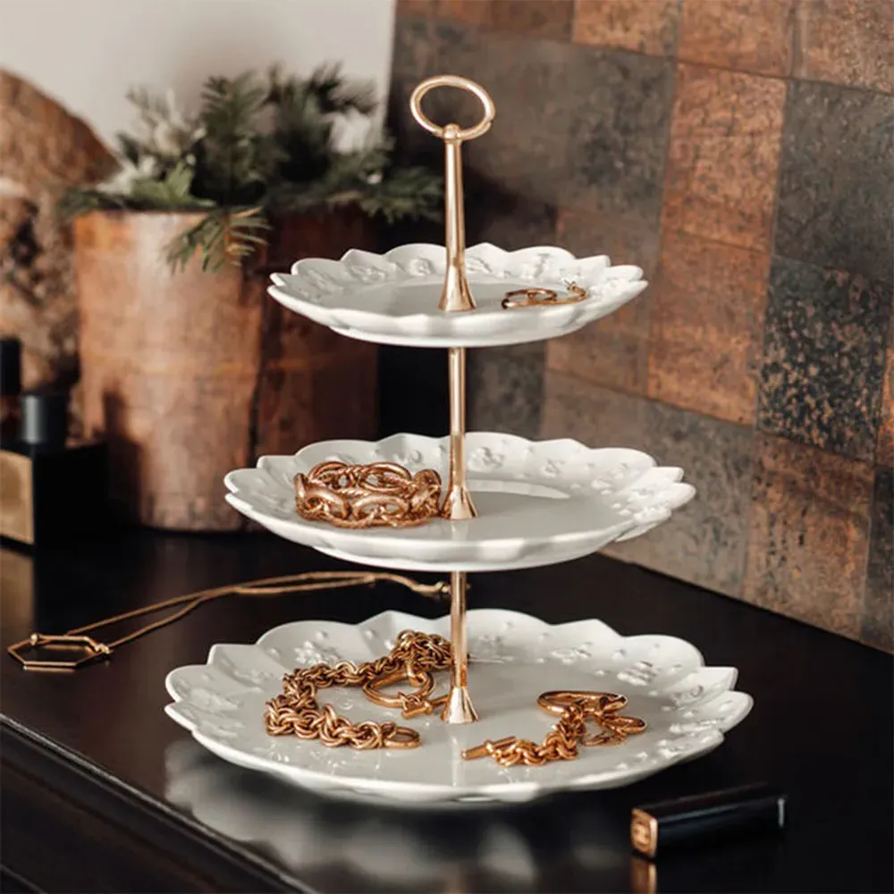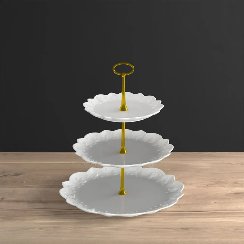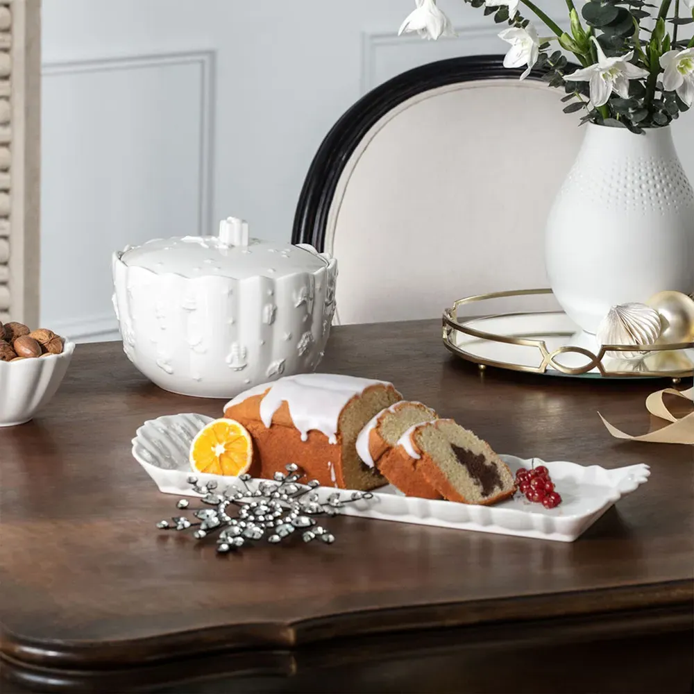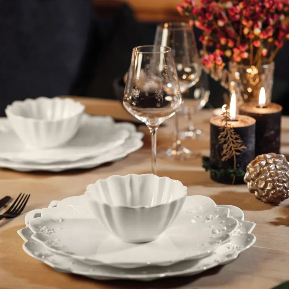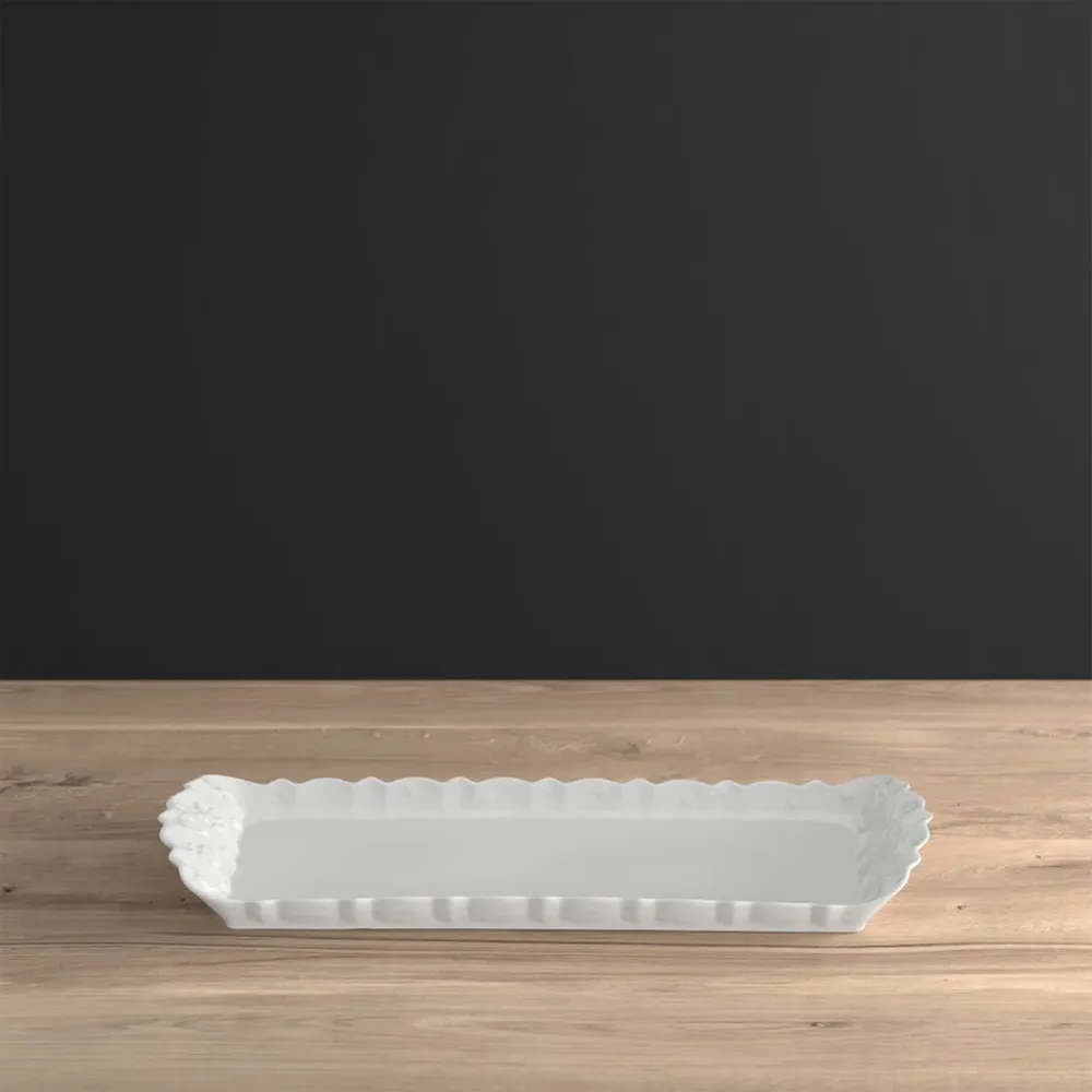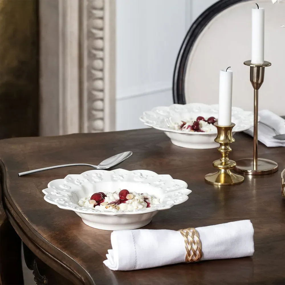 0.75 inches high x 7.25 inches wide x 7.25 inches deep. Constructed from premium porcelain. Finished in white. Toy's Delight Royal Classic is inspired by the shape of nostalgic paper plates, decorated with a high-quality porcelain relief.
