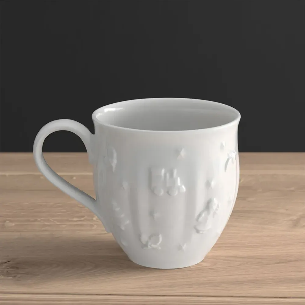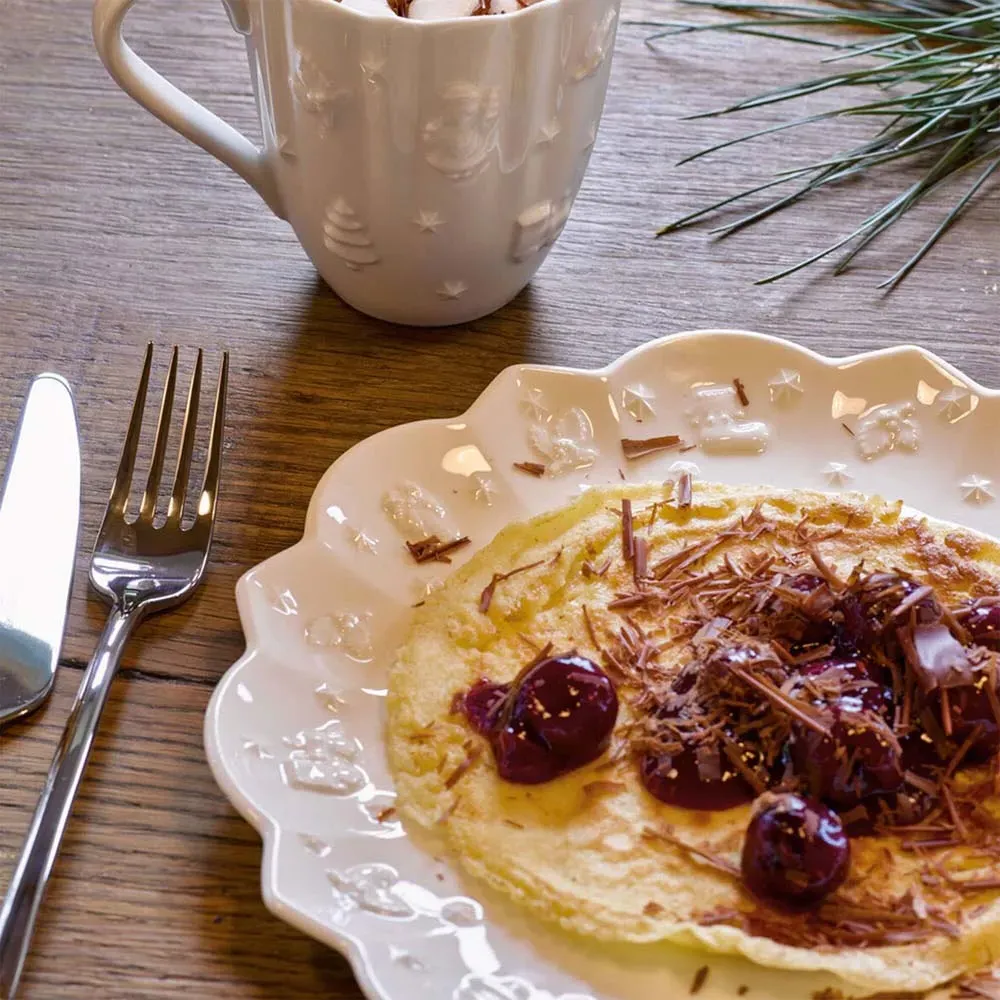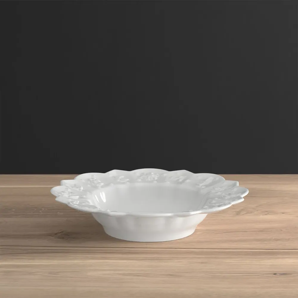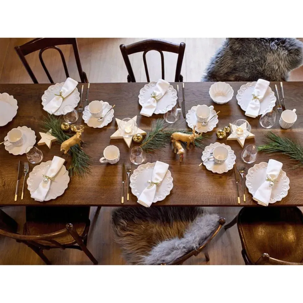 The saucer complements the nostalgic paper plate-inspired design with its high-quality porcelain relief decoration. Its premium porcelain construction ensures lasting durability, while the generous size accommodates various cup styles. The white finish creates a cohesive table presentation. W7.25 x D7.25 x H0.75 inches.