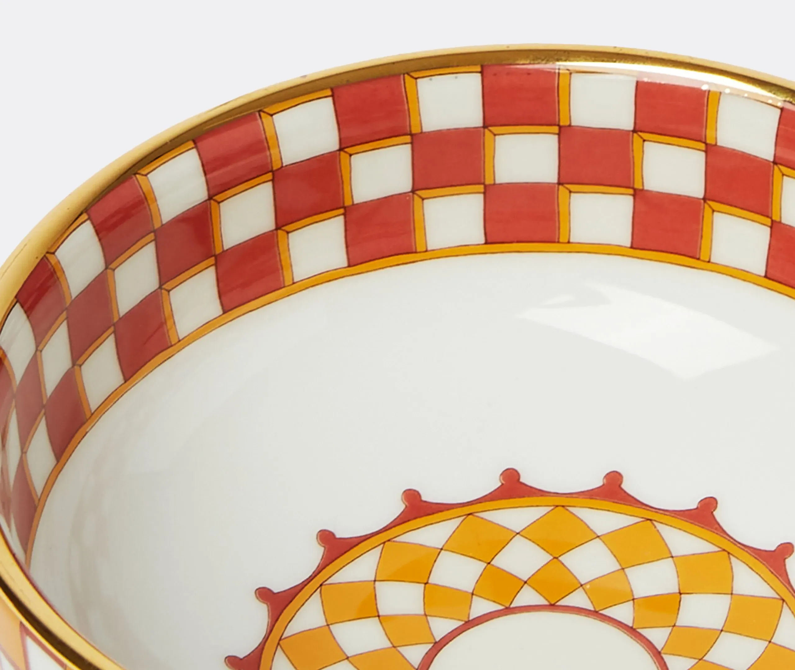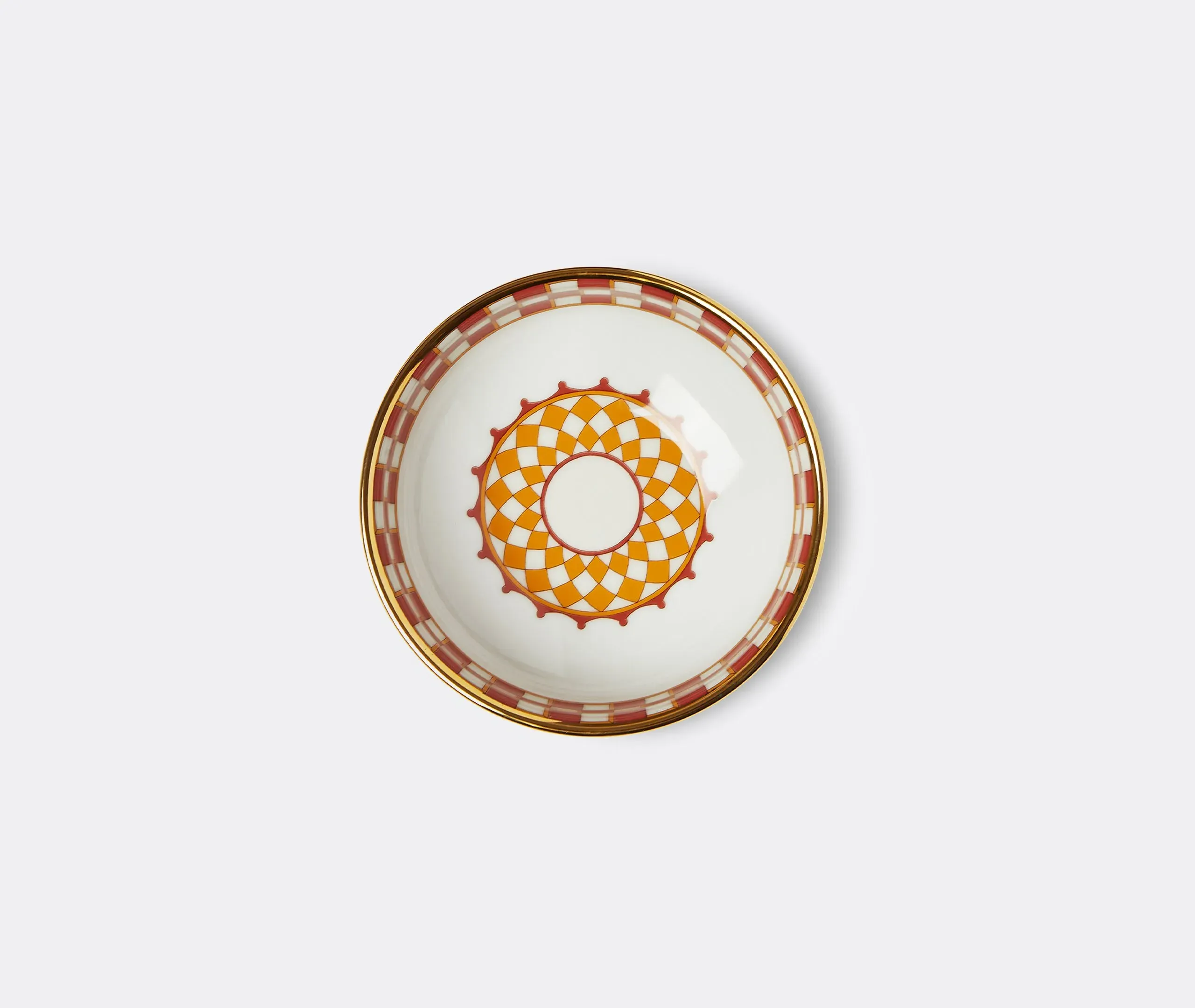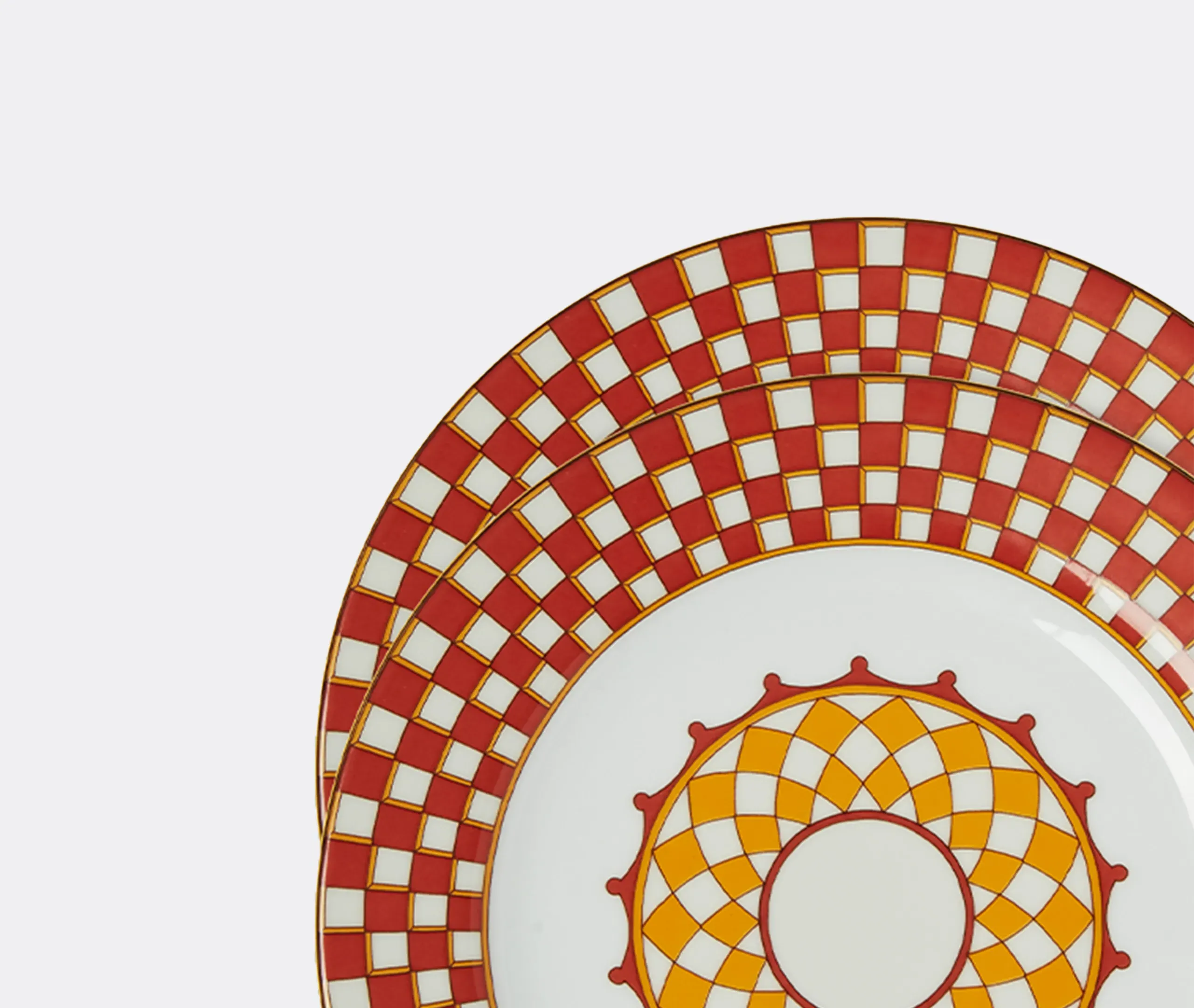 The ancient symbol of the sun shines through a series of resplendent tableware designs by La DoubleJ. Uplifting and versatile, designs draw the power and spirit of the sun to tables all year. Shades of burning red, saffron and gold glean throughout the collection in solar wheels and geometric flame motifs. The 'Apollo' side plate — named after the Greek god of Sun and Light — is crafted by historic artisans in Verona from the finest porcelain, and is encircled with an 18K gold trim. This stunning multicolor plate, with its fiery concentric borders, comes as a set of two, and can be introduced into simple, white tableware as a statement, or blended with other pieces from the 'Apollo' collection.